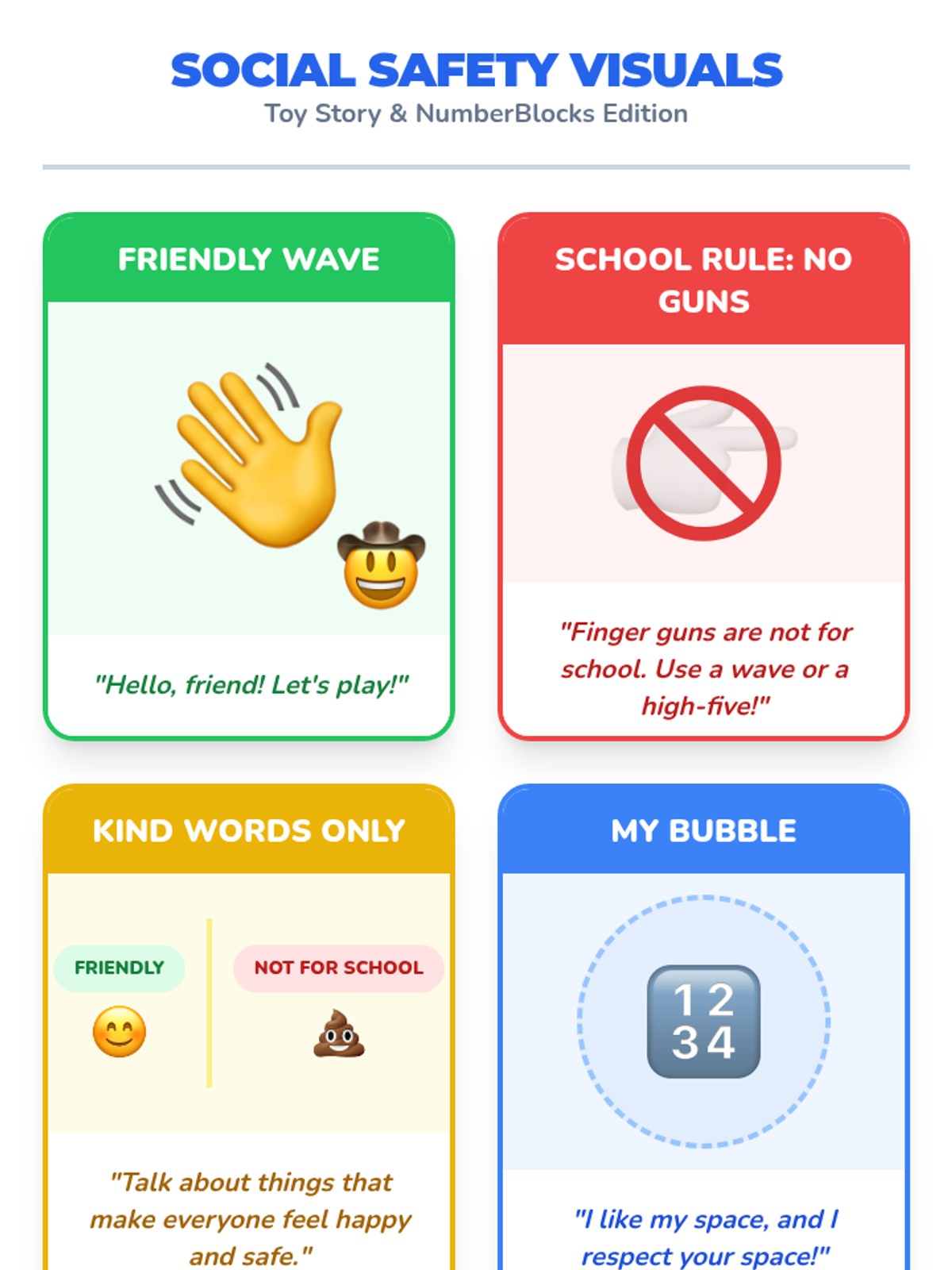 A comprehensive 12-session social skills program designed for a 1st-grade student with Autism, focusing on social norms, personal boundaries, and school safety through the engaging themes of Toy Story and NumberBlocks.