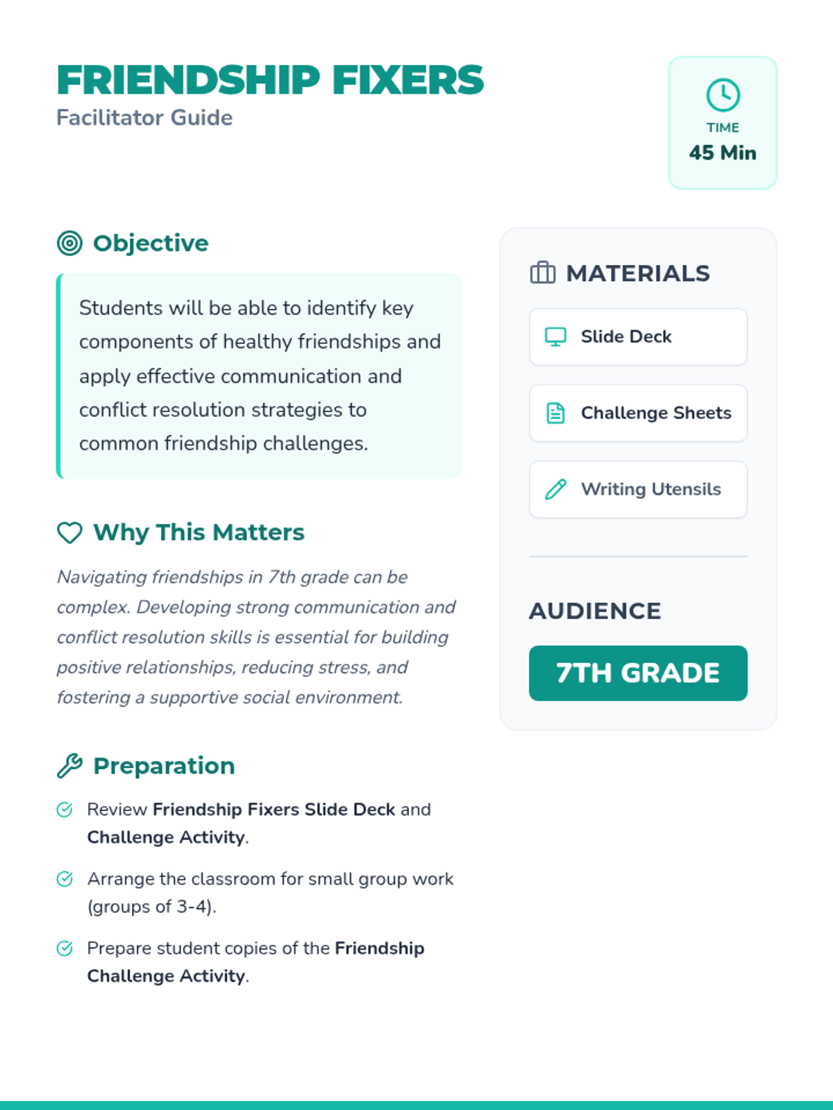 A two-part series designed for 7th-grade groups to build essential social-emotional skills. Students will learn to navigate the pressures of middle school by mastering stress management techniques and conflict resolution strategies for healthy friendships.