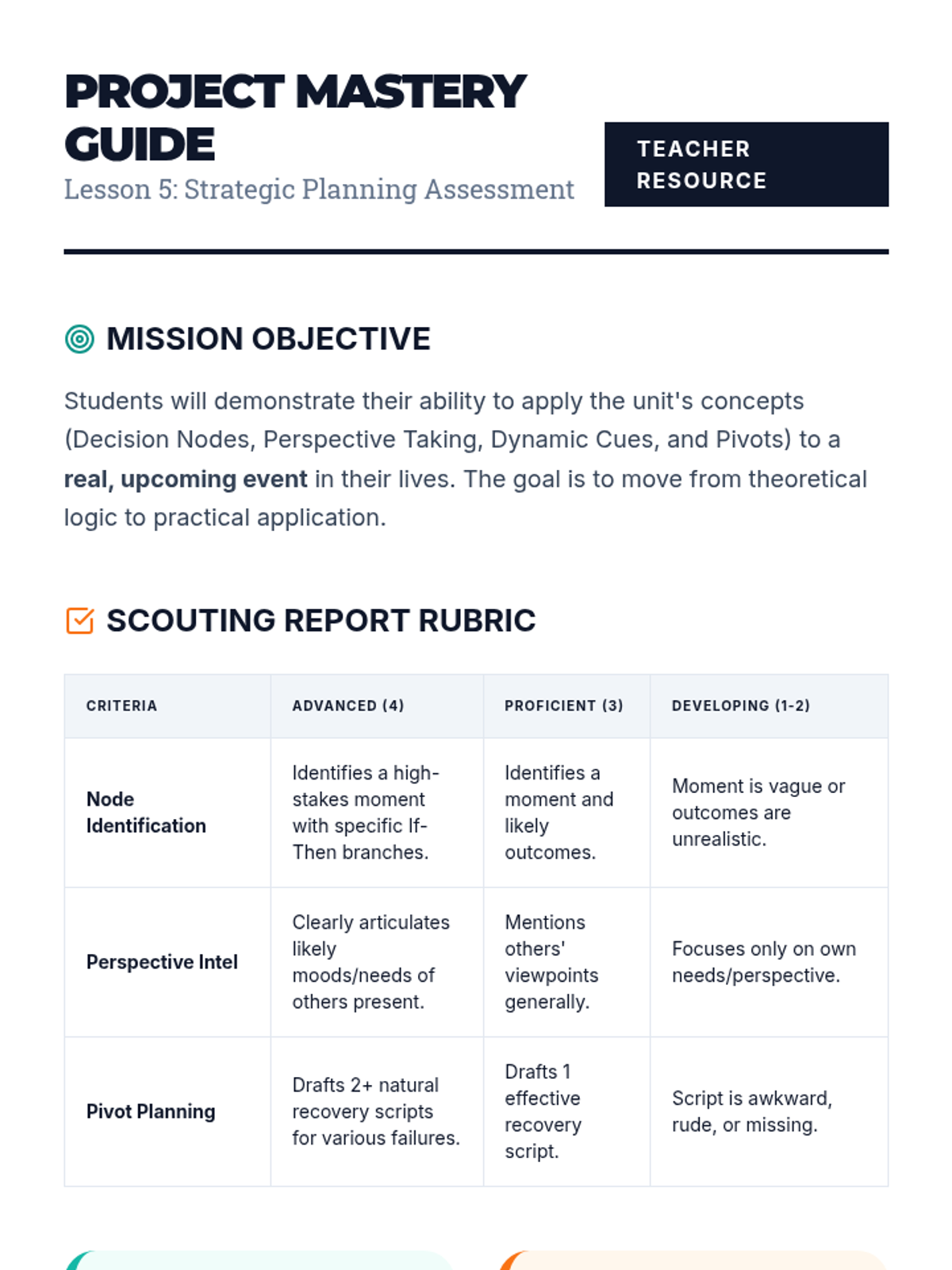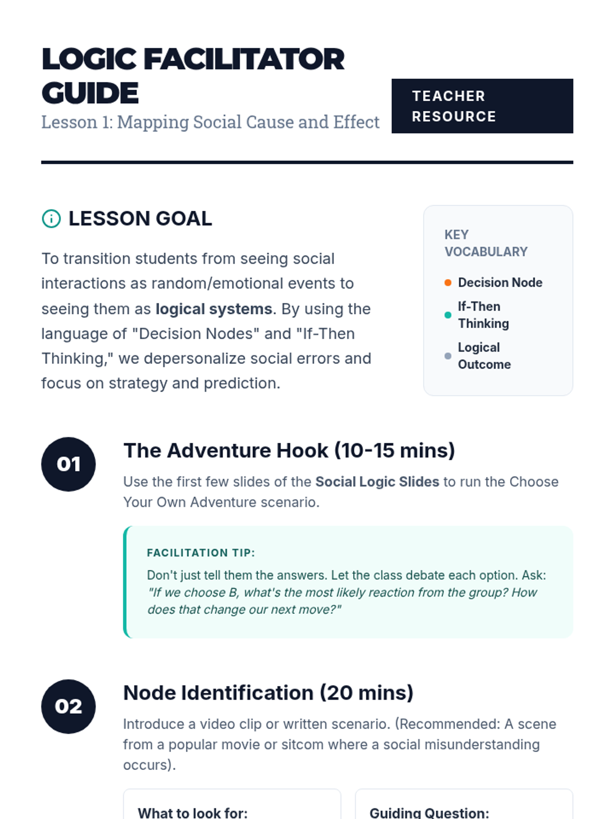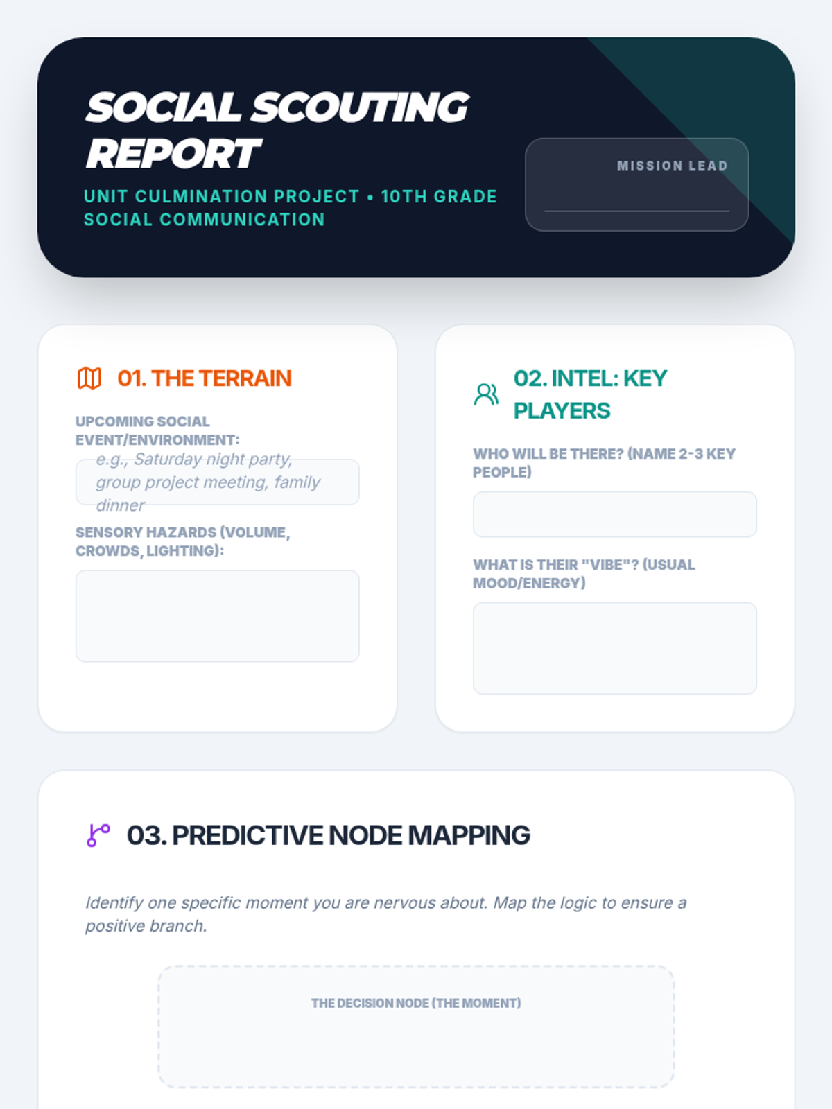 A 5-lesson unit designed for 10th-grade students to develop 'If-Then' thinking in social interactions. Students use game-based logic and predictive analysis to understand cause and effect, take perspectives, read dynamic cues, and plan for real-world social success.