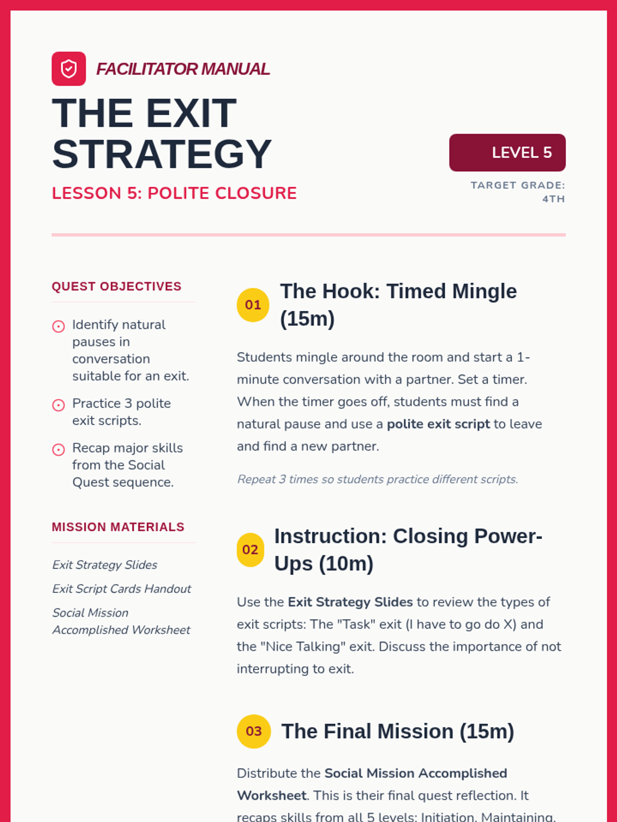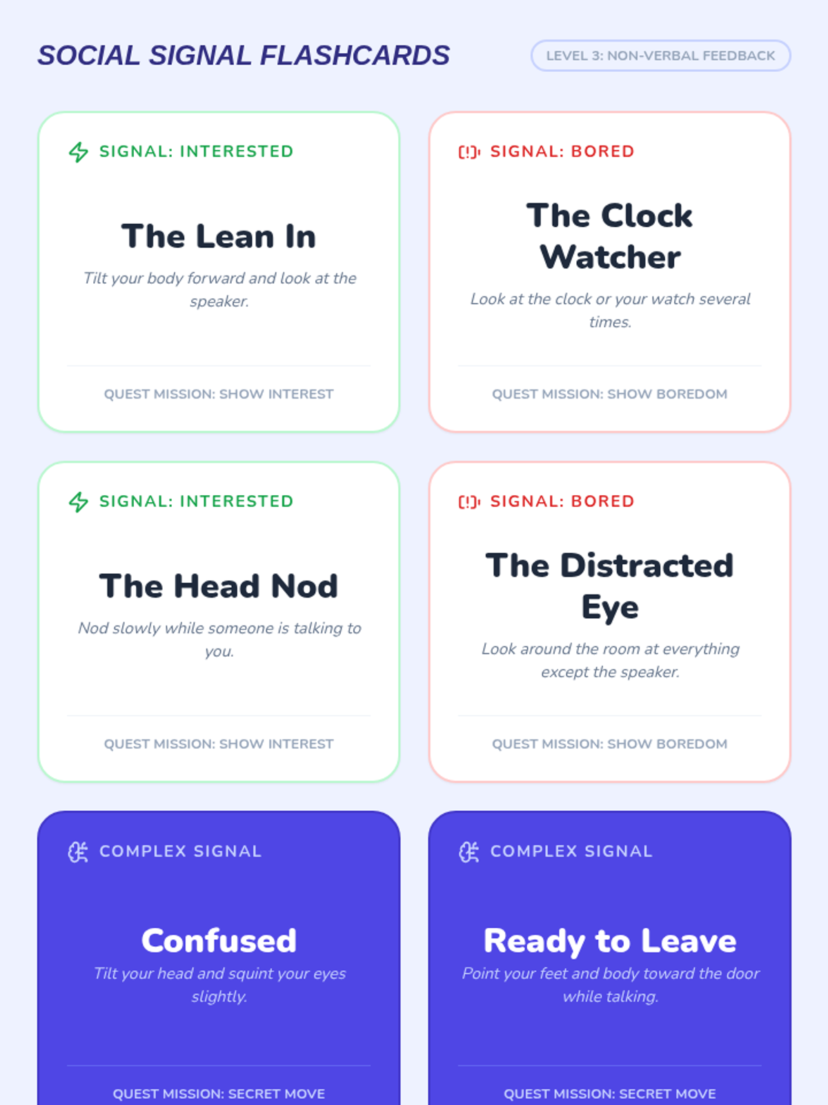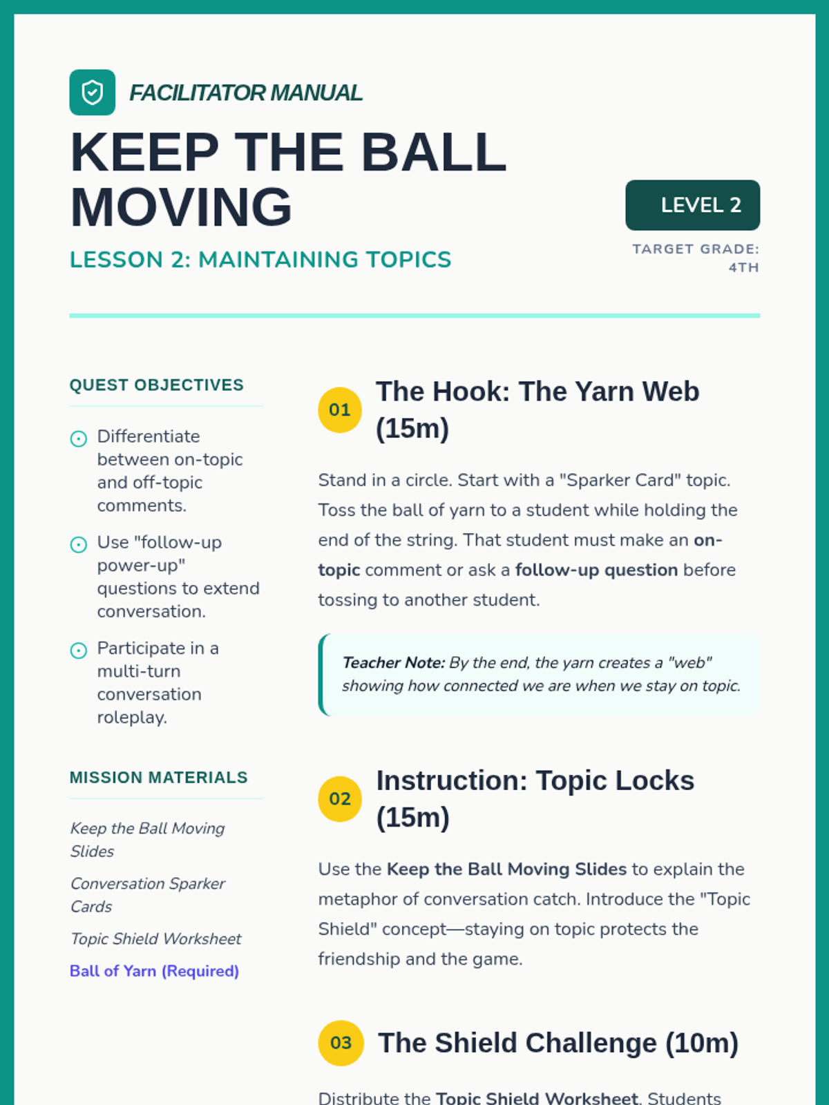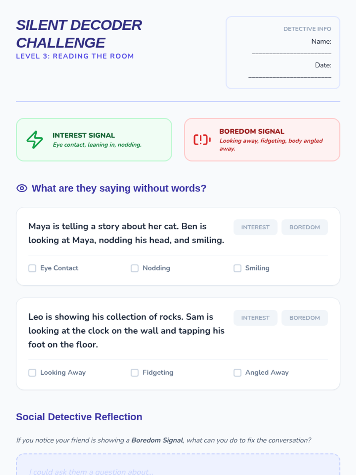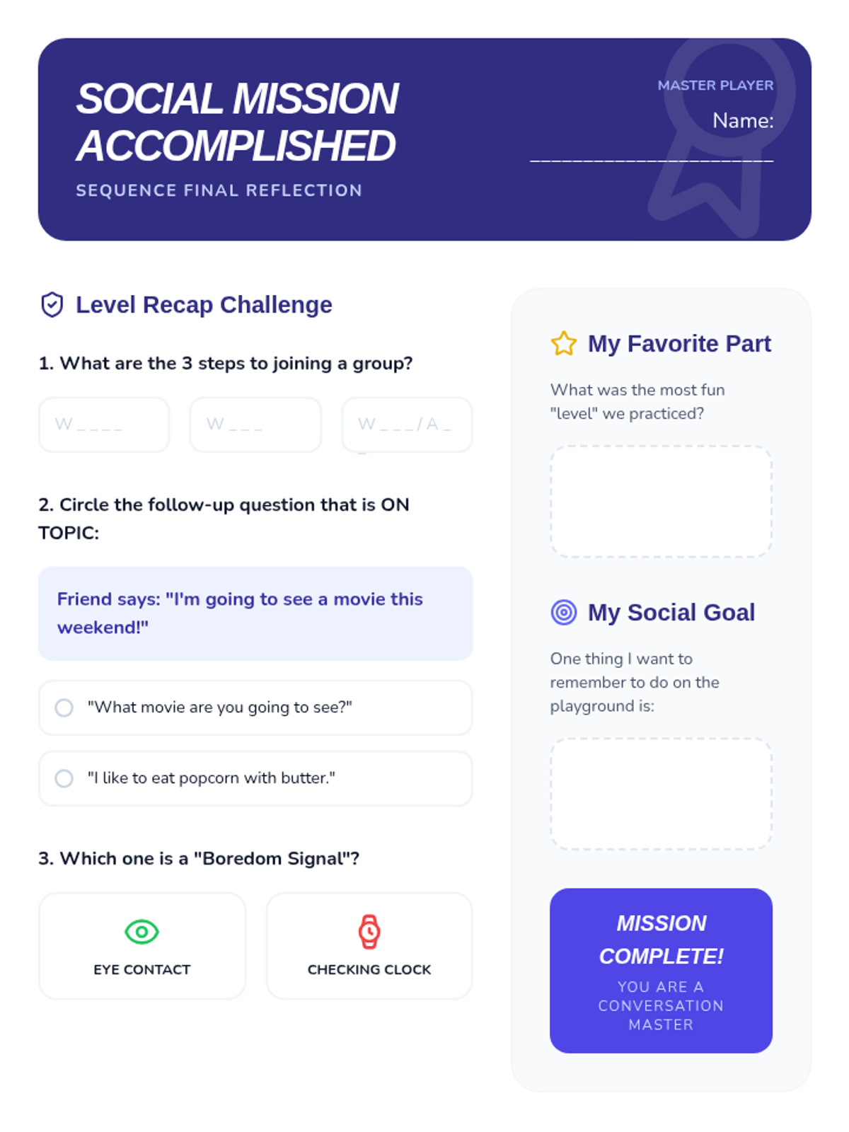 A gamified sequence for 4th graders to master the 'rules' of social interaction, treating conversations and play as structured quests with specific levels and objectives. Students use social stories and interactive games to practice initiating, maintaining, and ending social encounters.