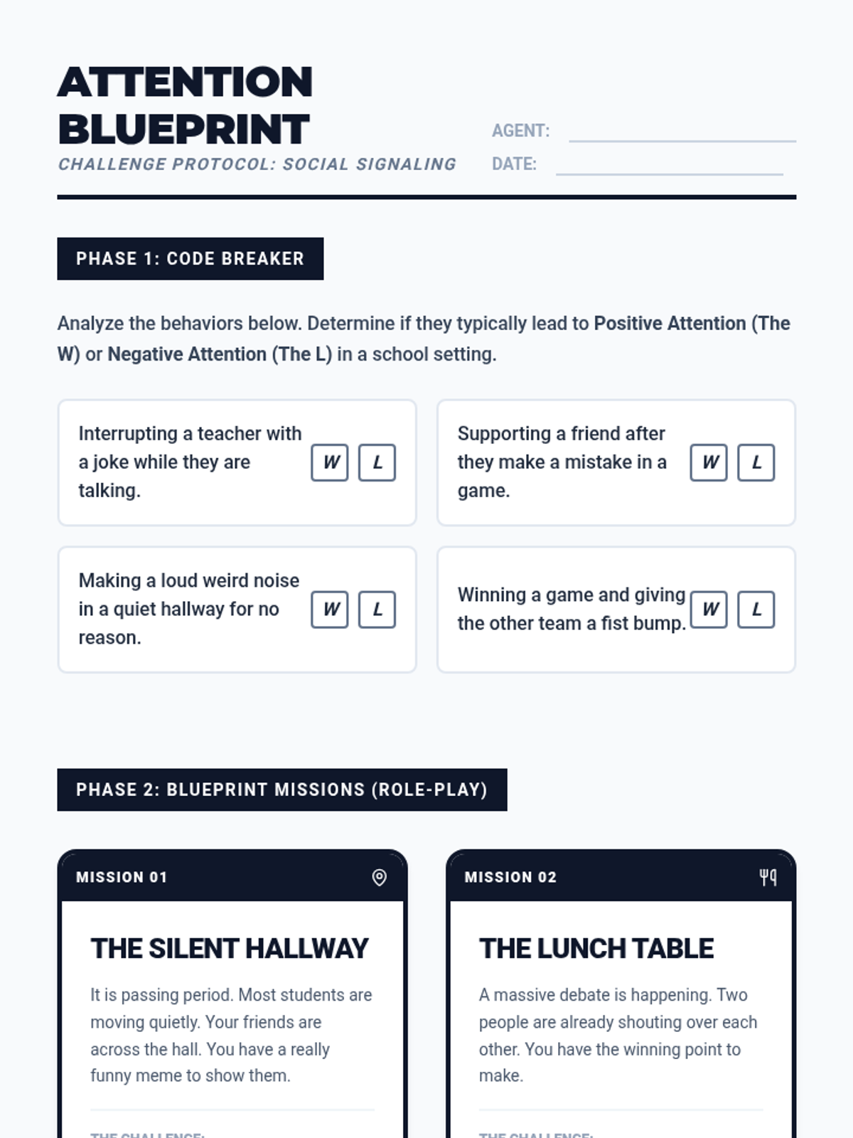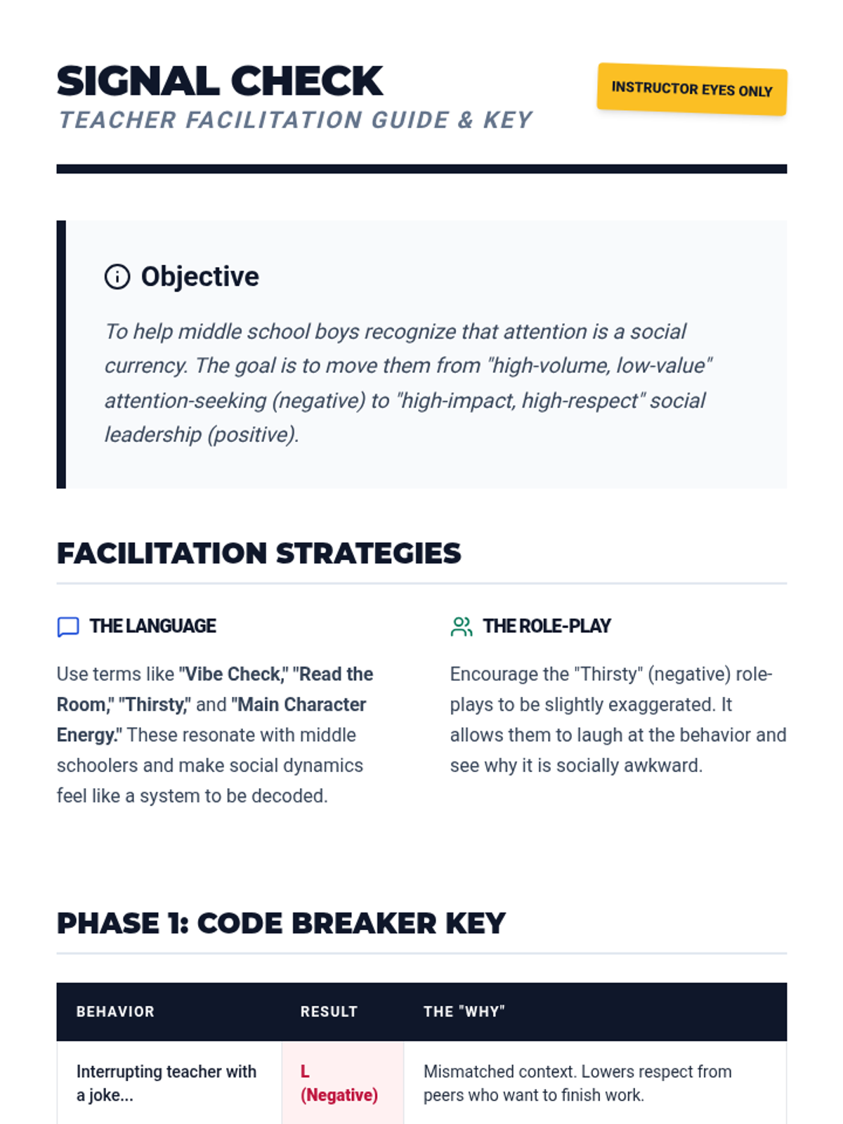 A unit focused on helping middle school boys navigate social dynamics, specifically focusing on how to gain positive attention through appropriate behavior, timing, and reading social contexts.