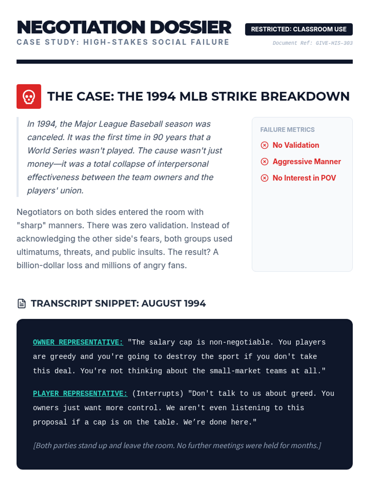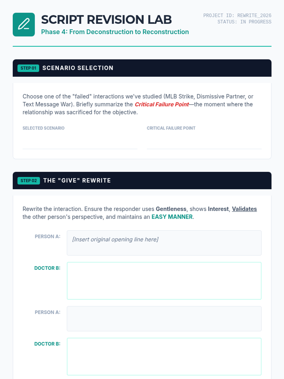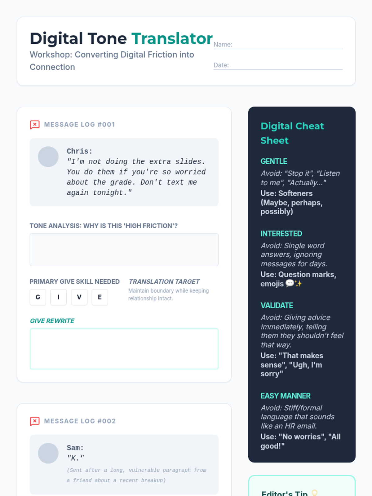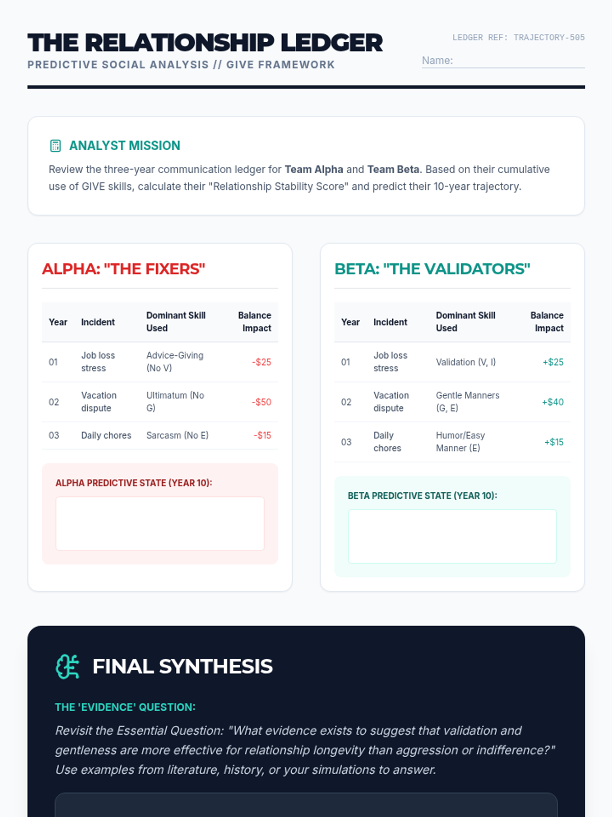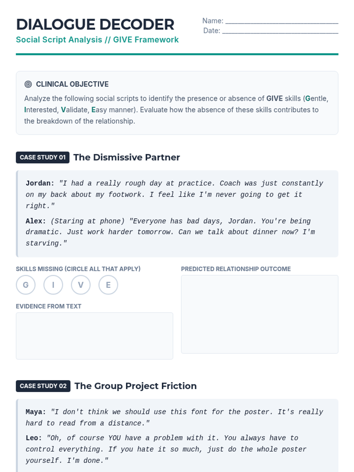 An analytical sequence for 11th-grade students to evaluate and deconstruct relationship communication using the DBT GIVE framework. Students analyze literary, digital, and historical interactions to master validation and gentleness as strategic tools for relationship longevity.