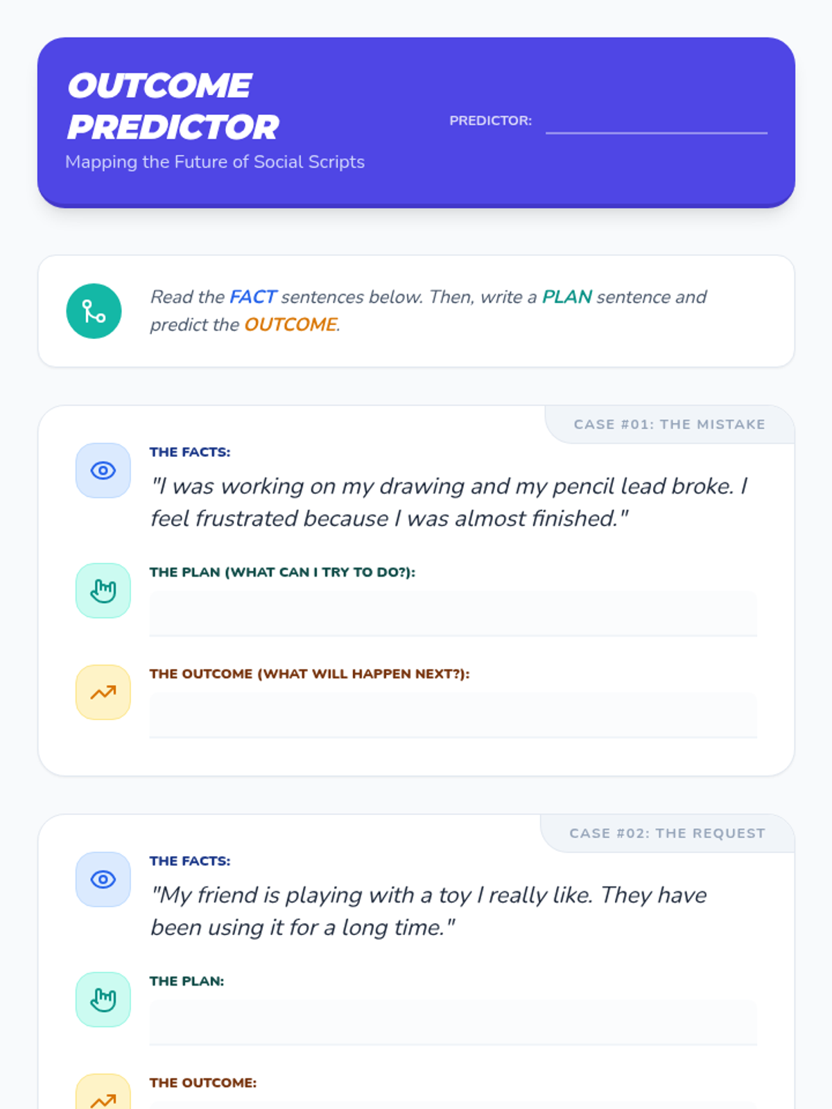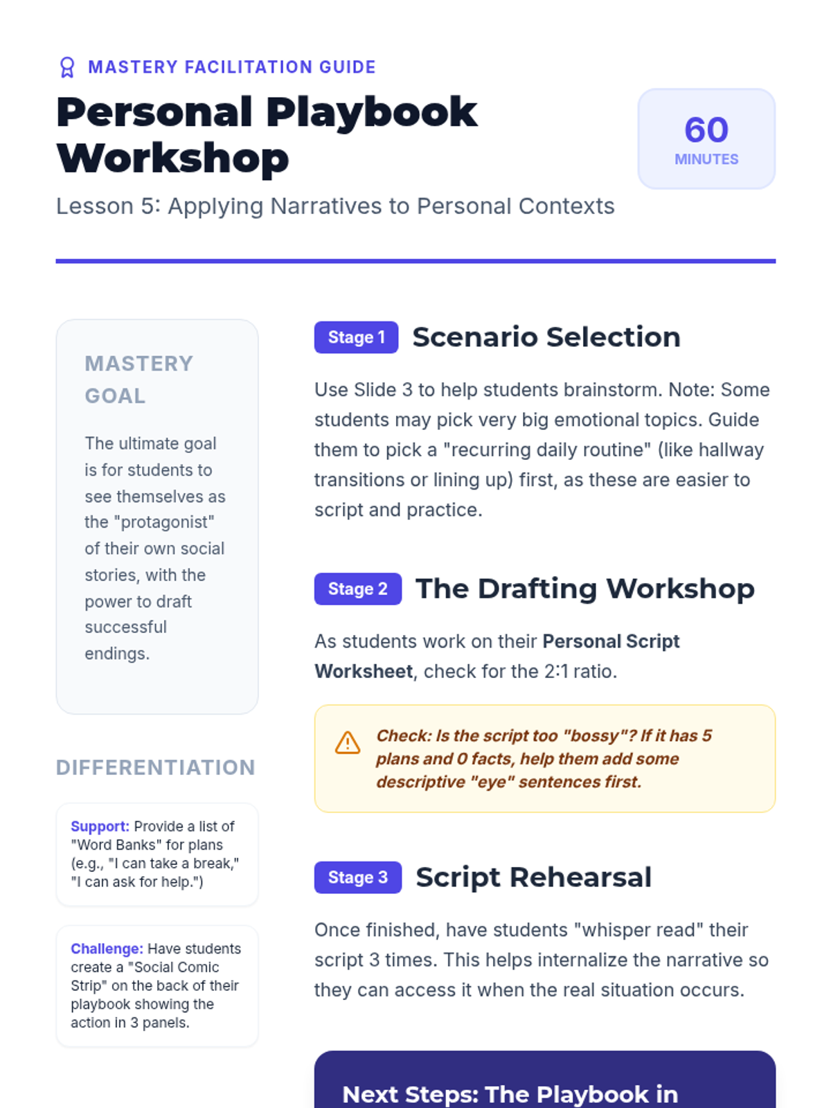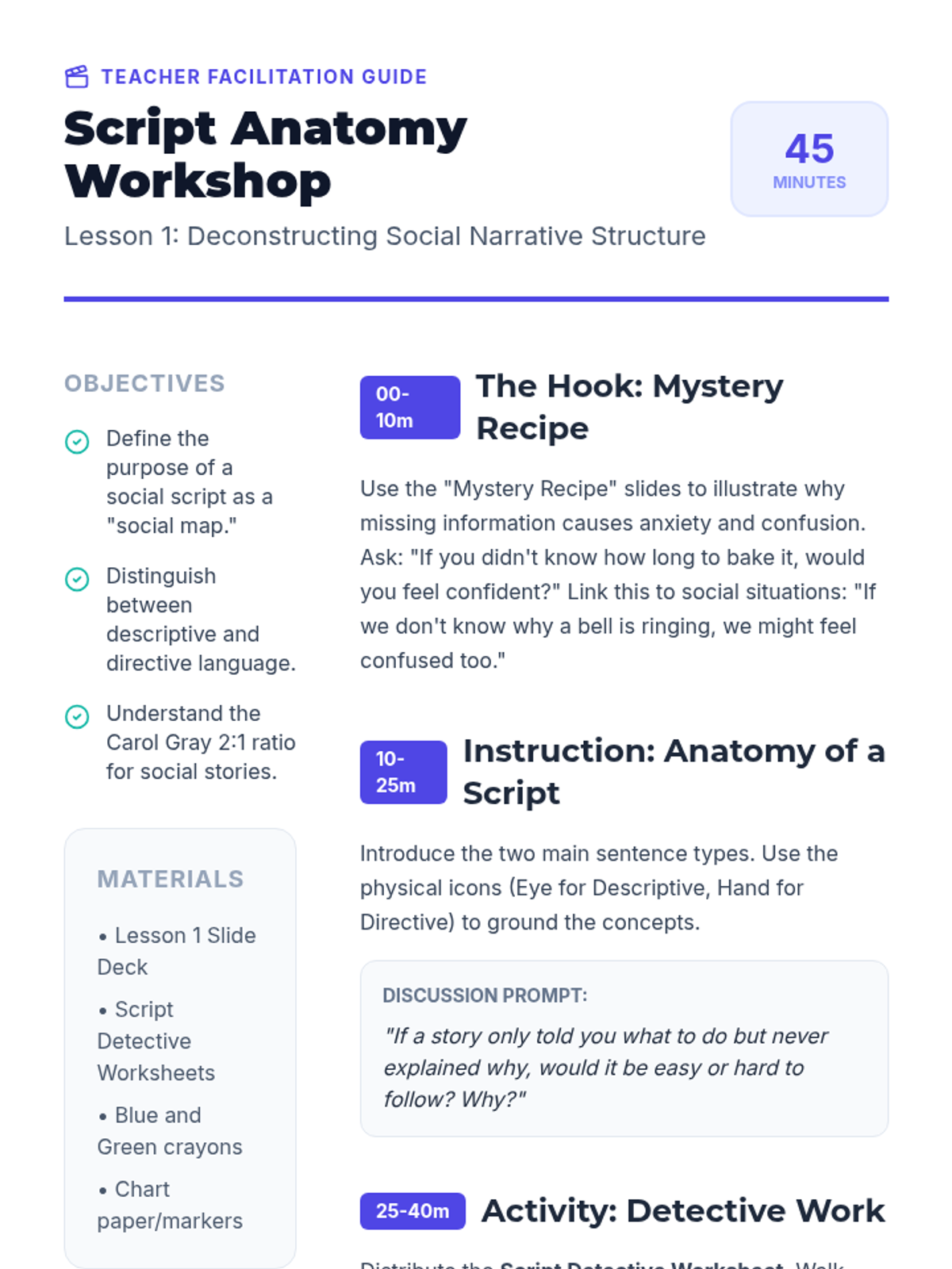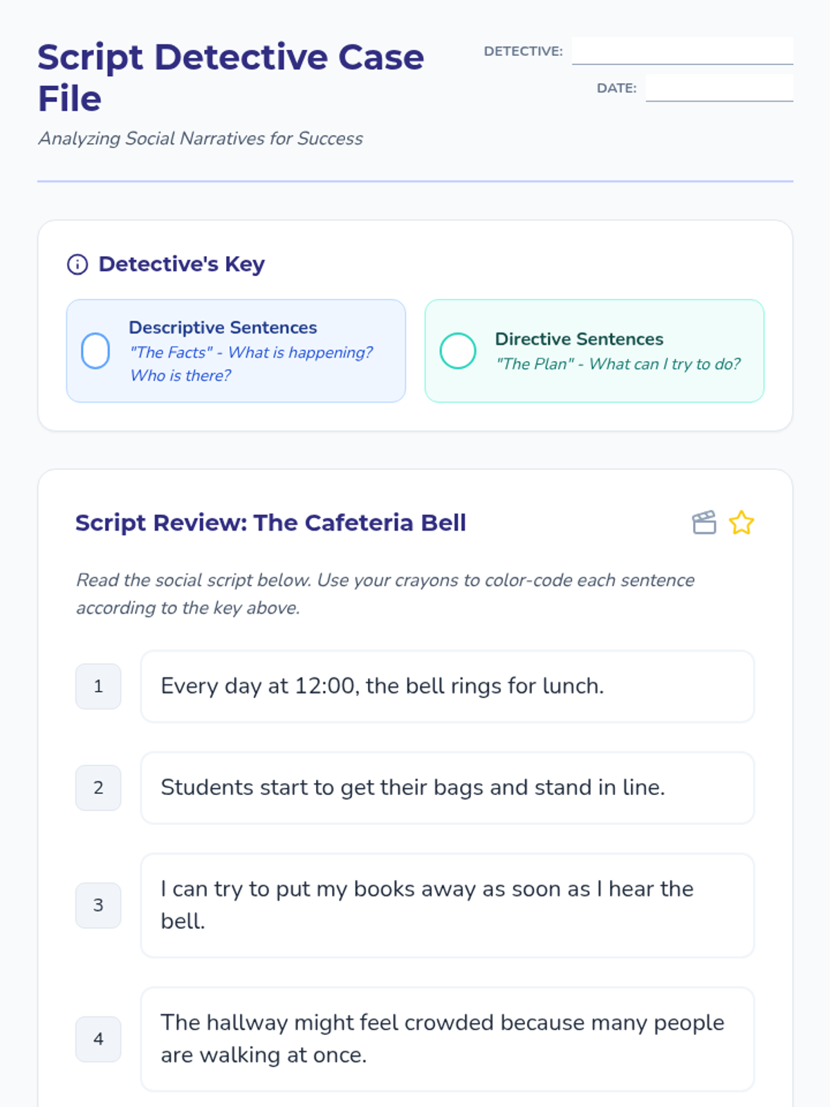 A comprehensive sequence for 4th-grade students to understand the structure, purpose, and application of social narratives. Through a 'Social Script Studio' theme, students learn to deconstruct social stories, identify context clues, and apply these frameworks to navigate social situations successfully.
