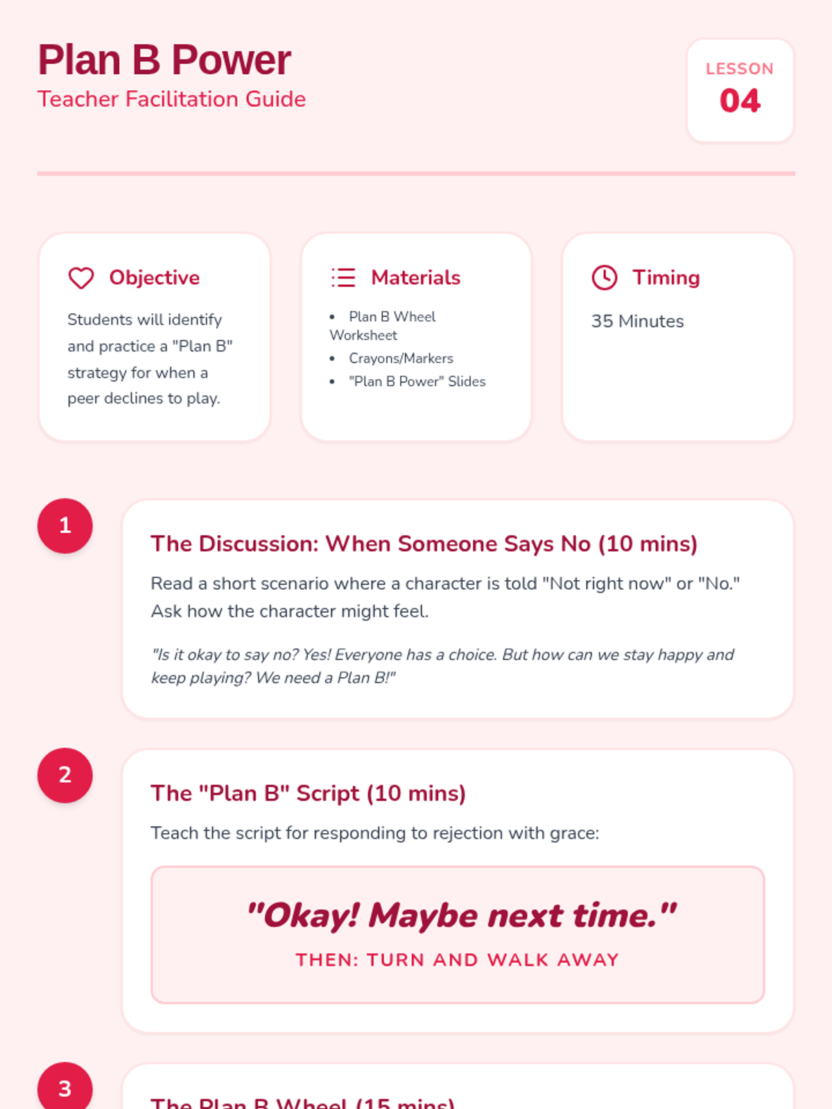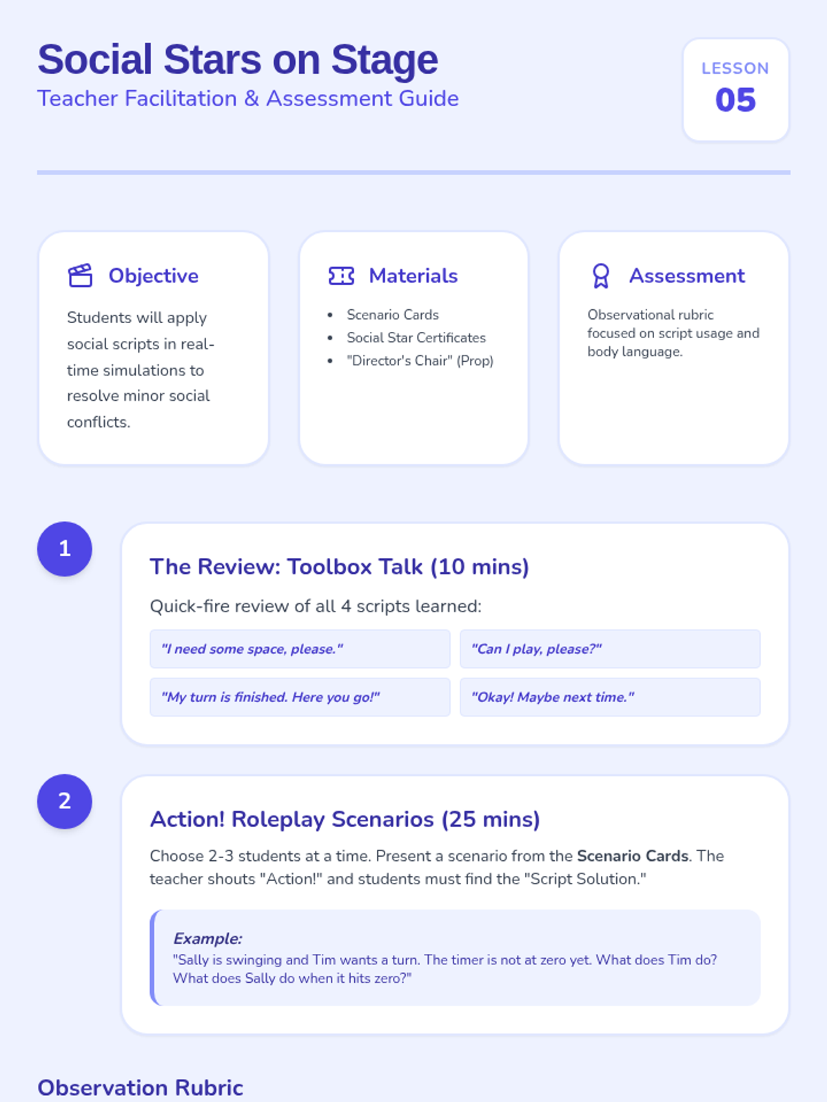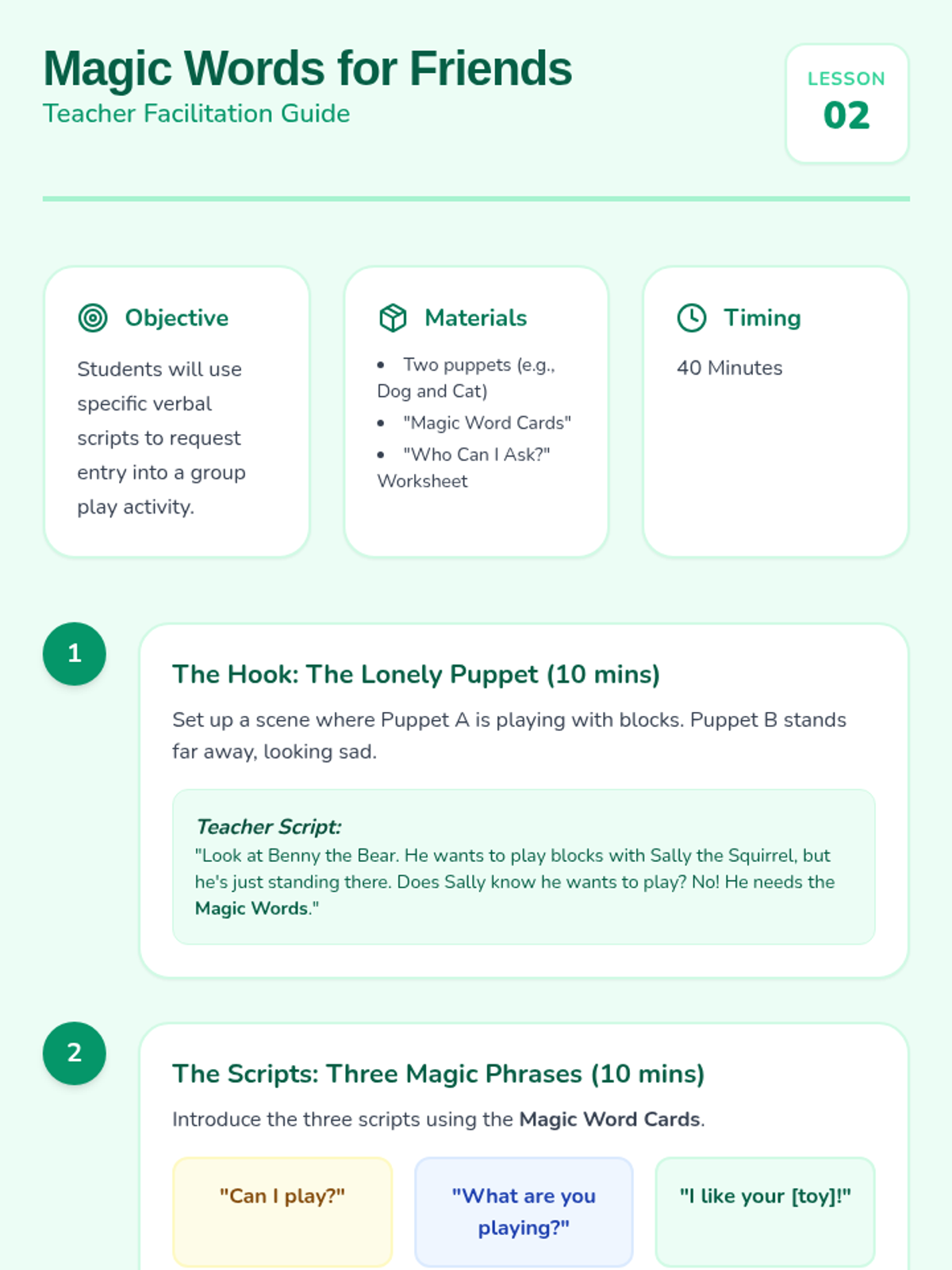 A Kindergarten social-emotional learning sequence focused on building positive peer interaction skills through social scripting, personal boundaries, and conflict resolution. Students use role-play and visual stories to internalize strategies for sharing, joining groups, and handling social rejection.
