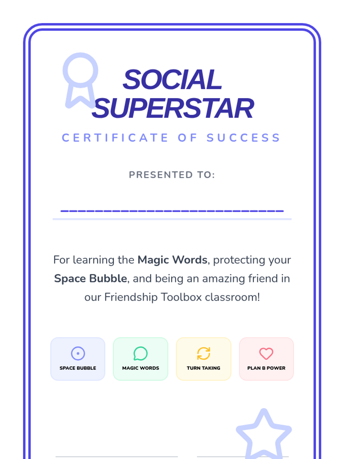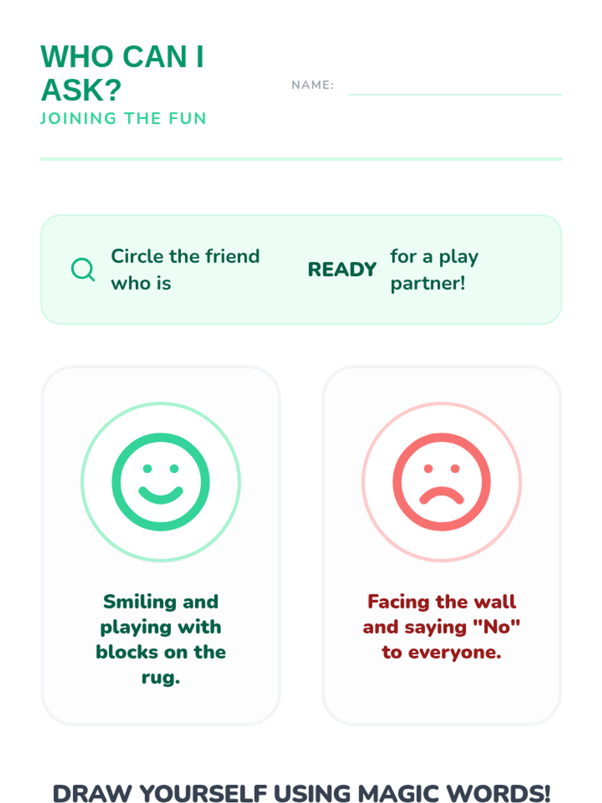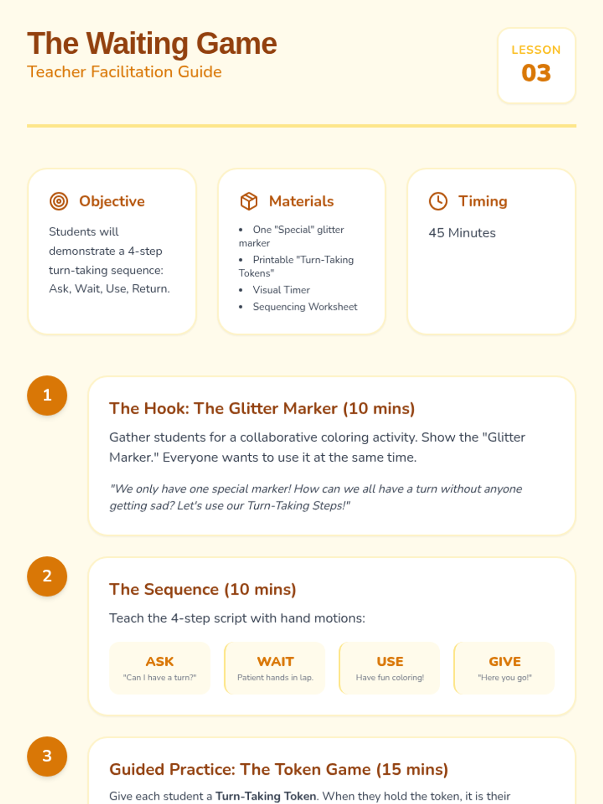 A Kindergarten social-emotional learning sequence focused on building positive peer interaction skills through social scripting, personal boundaries, and conflict resolution. Students use role-play and visual stories to internalize strategies for sharing, joining groups, and handling social rejection.
