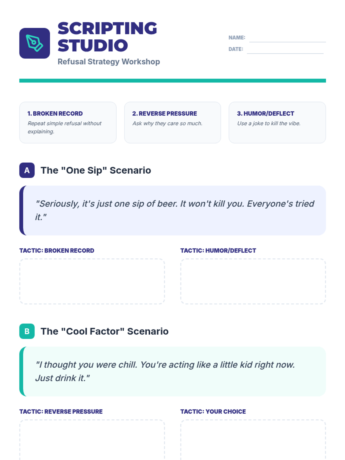 This sequence equips 7th-grade students with the practical communication skills and social awareness needed to navigate peer pressure regarding alcohol. Students move from identifying subtle pressure to mastering verbal and non-verbal refusal techniques and creating personalized safety plans.