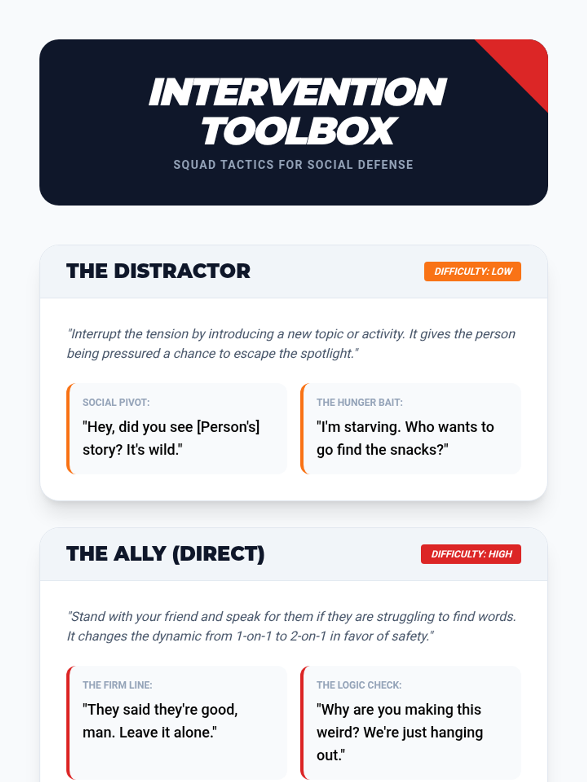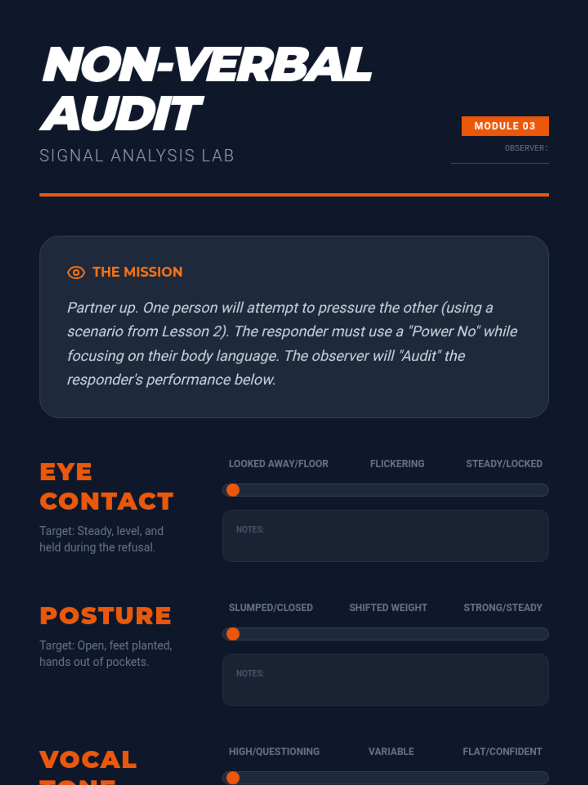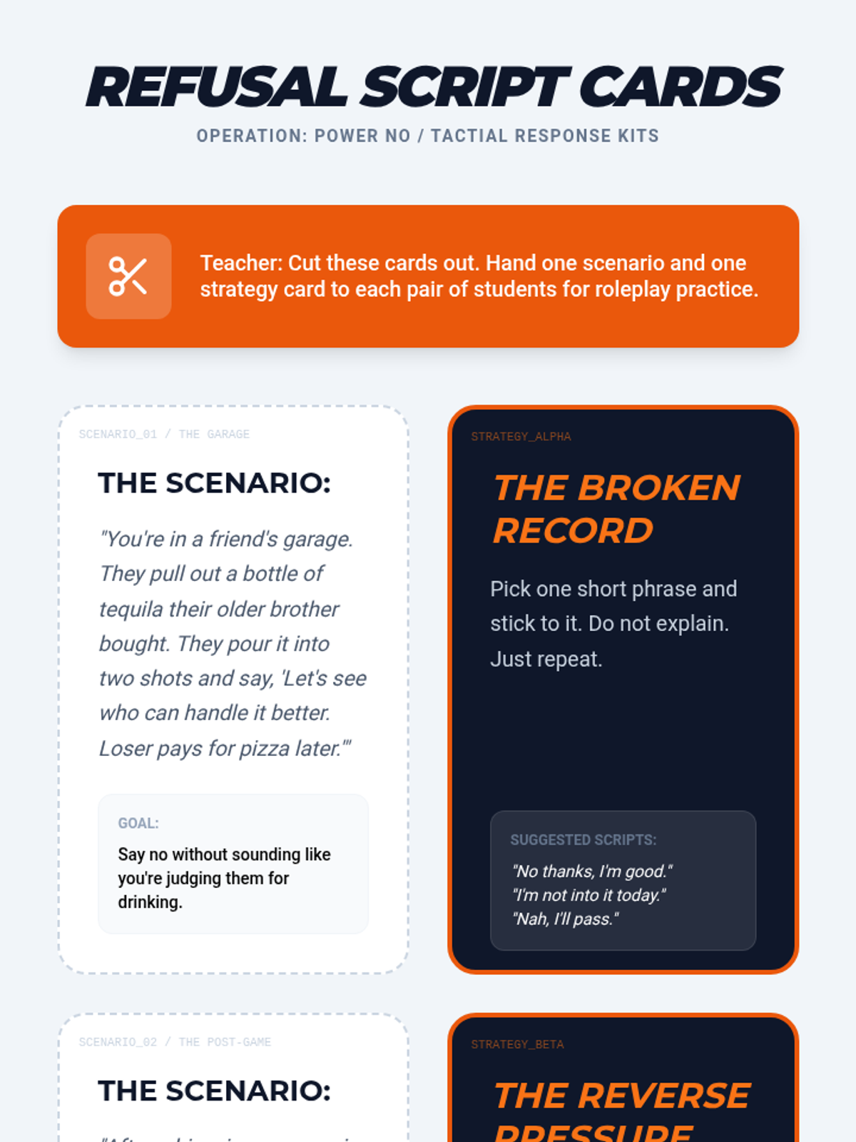This sequence equips 9th-grade students with practical tools to navigate peer pressure regarding alcohol use. It moves from identifying subtle social influences to mastering verbal and non-verbal refusal strategies, planning exit logistics, and practicing bystander intervention.