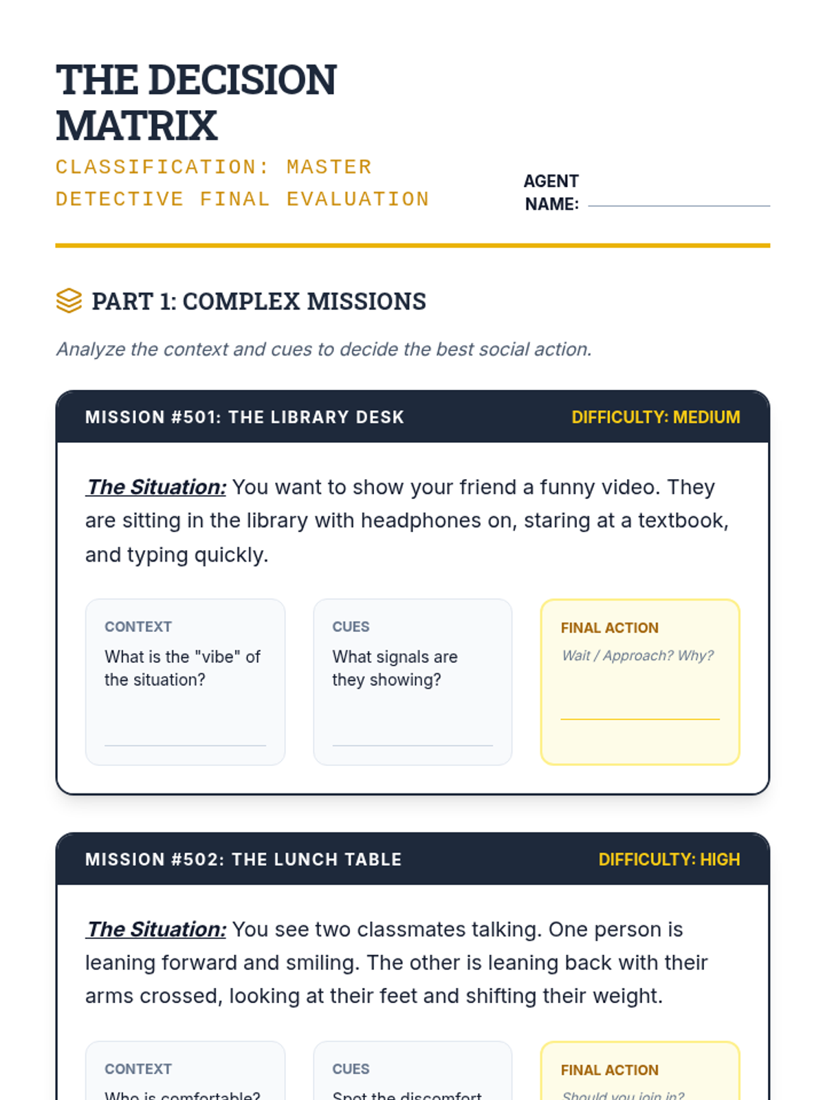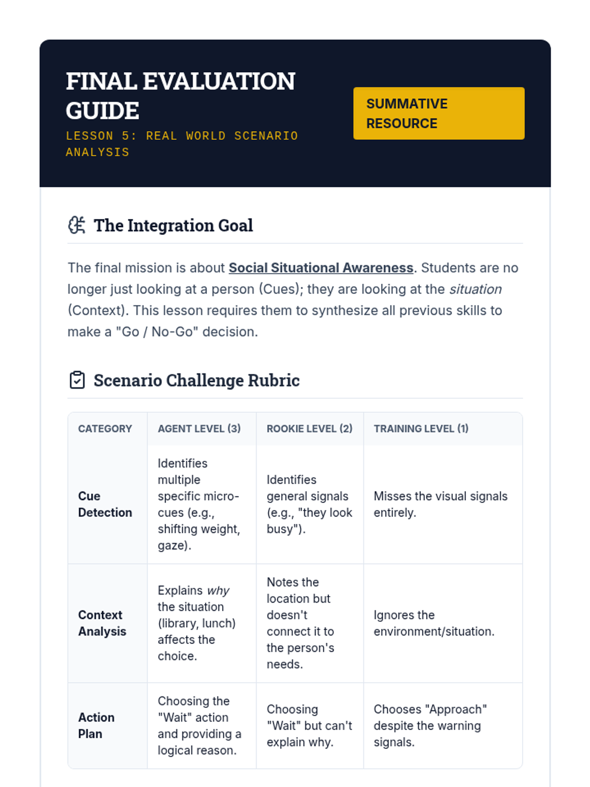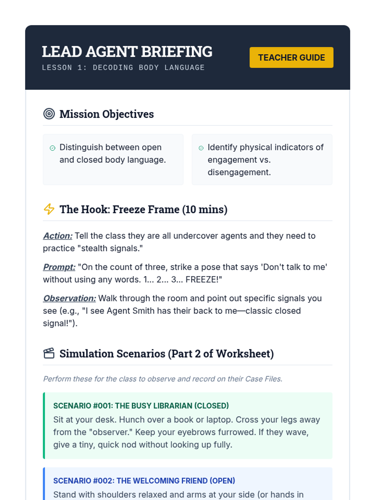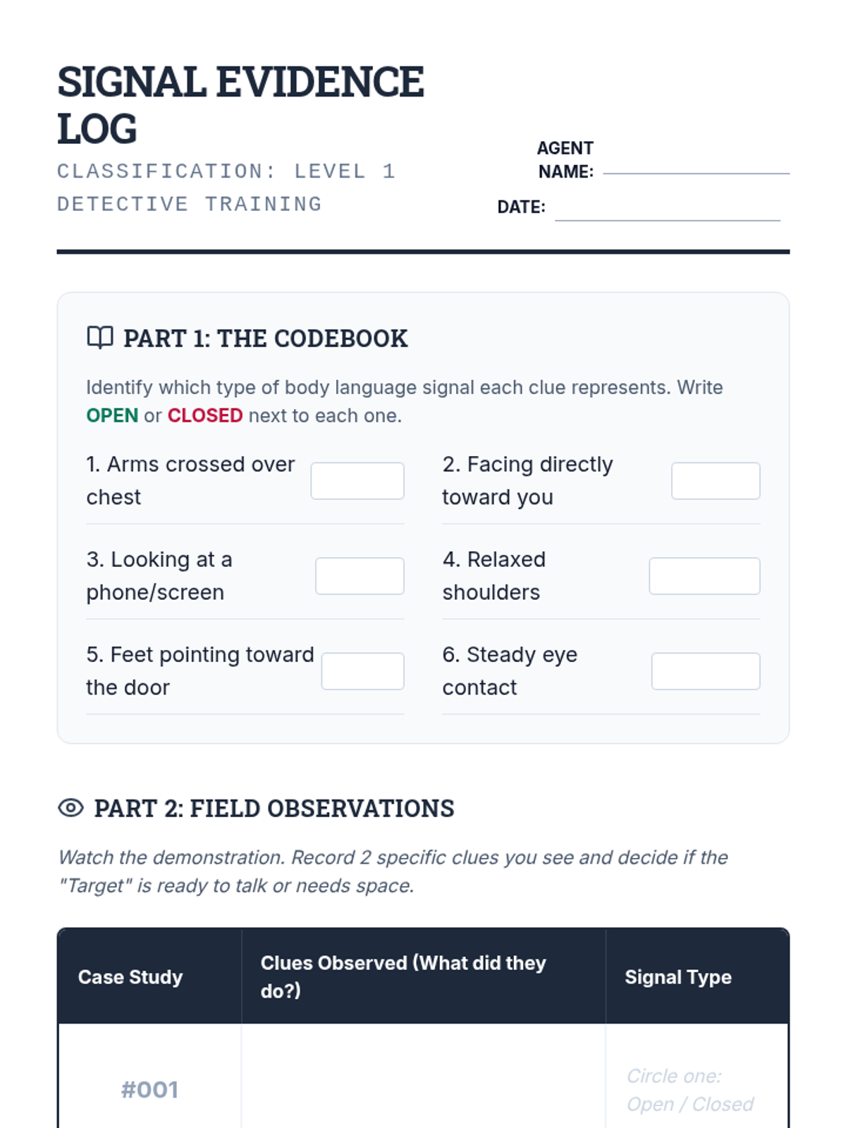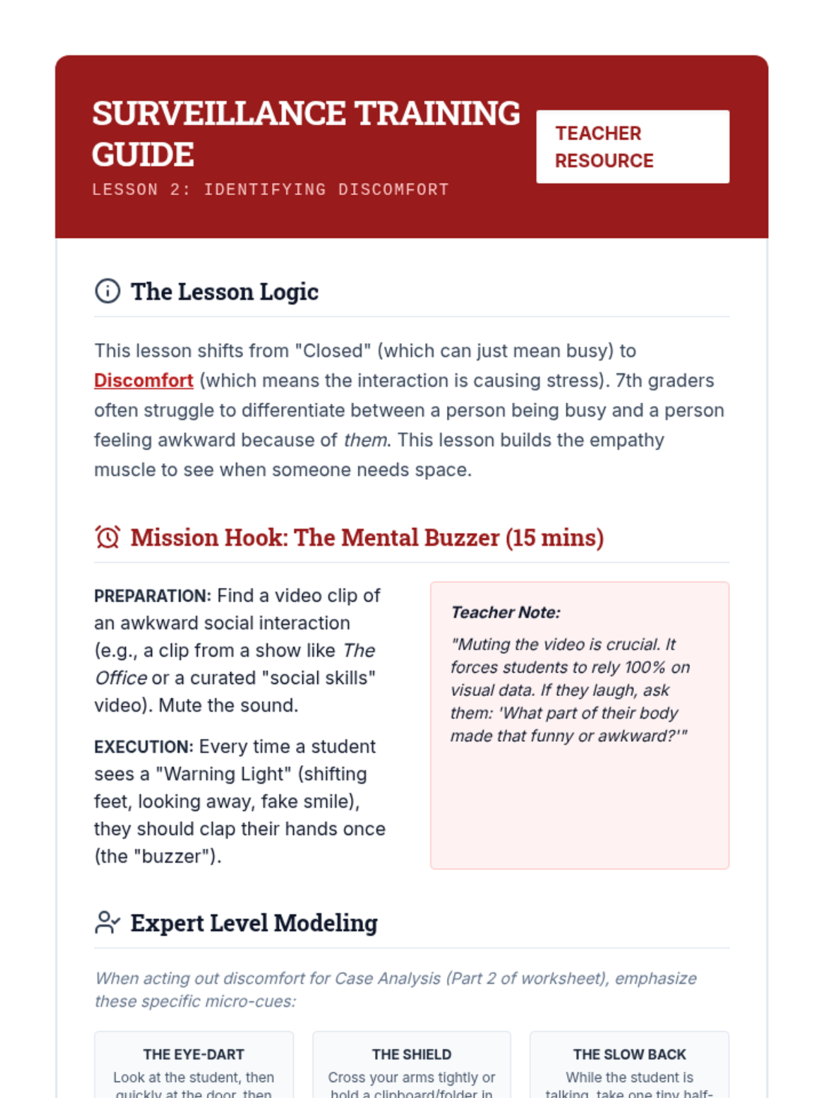 A 5-lesson sequence for 7th-grade students focusing on receptive social communication, specifically decoding nonverbal cues like body language and personal space to adjust social behavior. Students learn to observe open/closed signals, identify discomfort, and practice a 'Notice and Adjust' loop for social calibration.