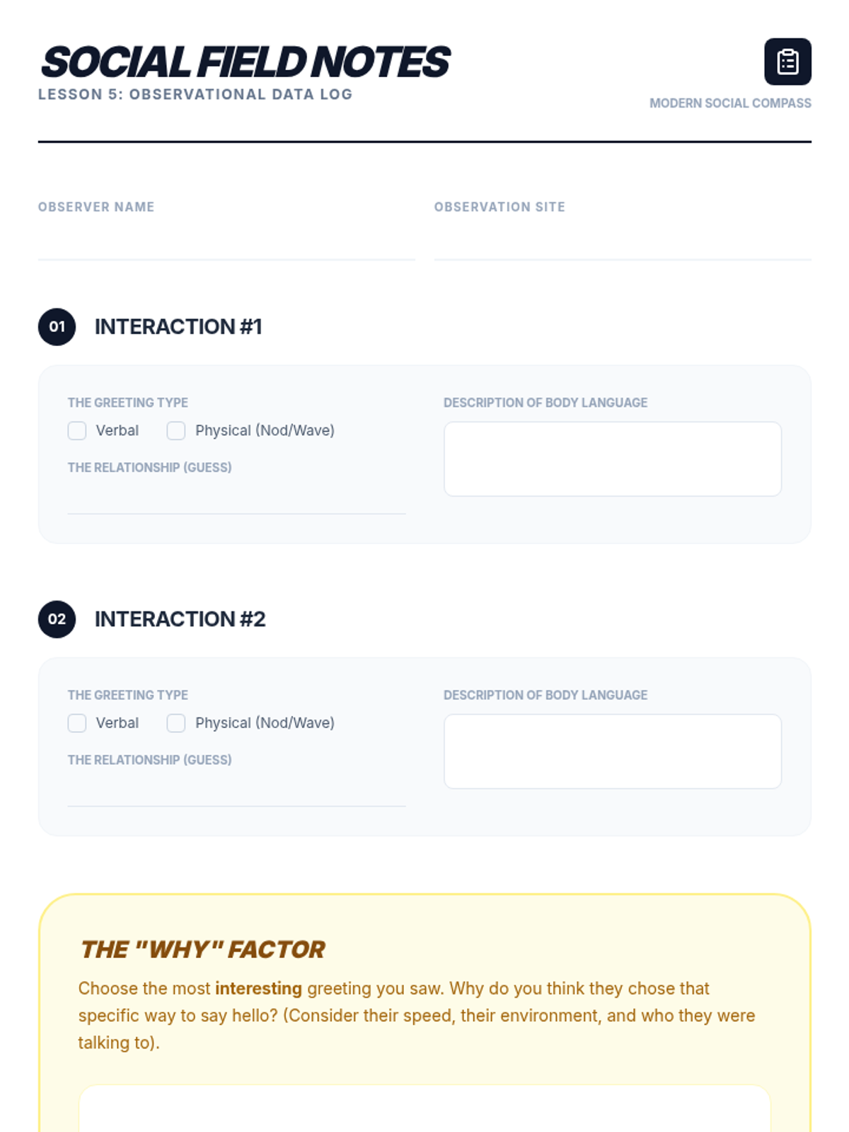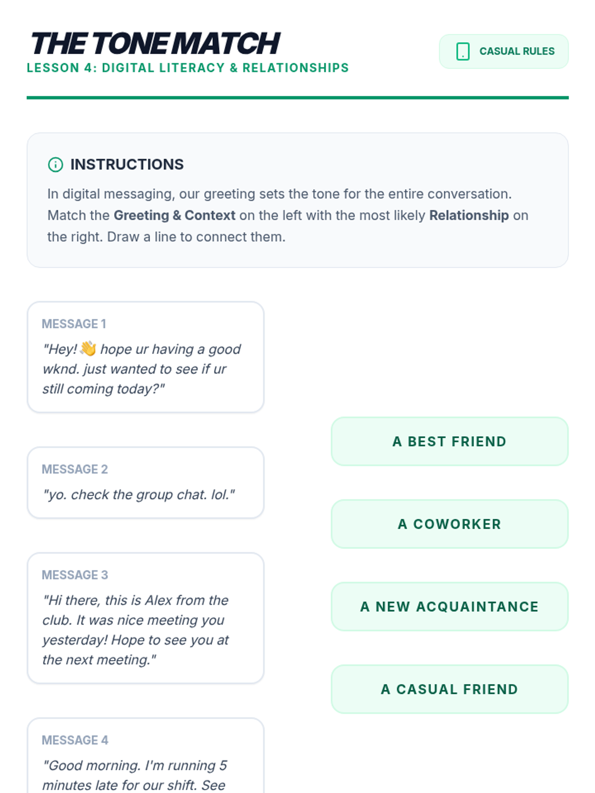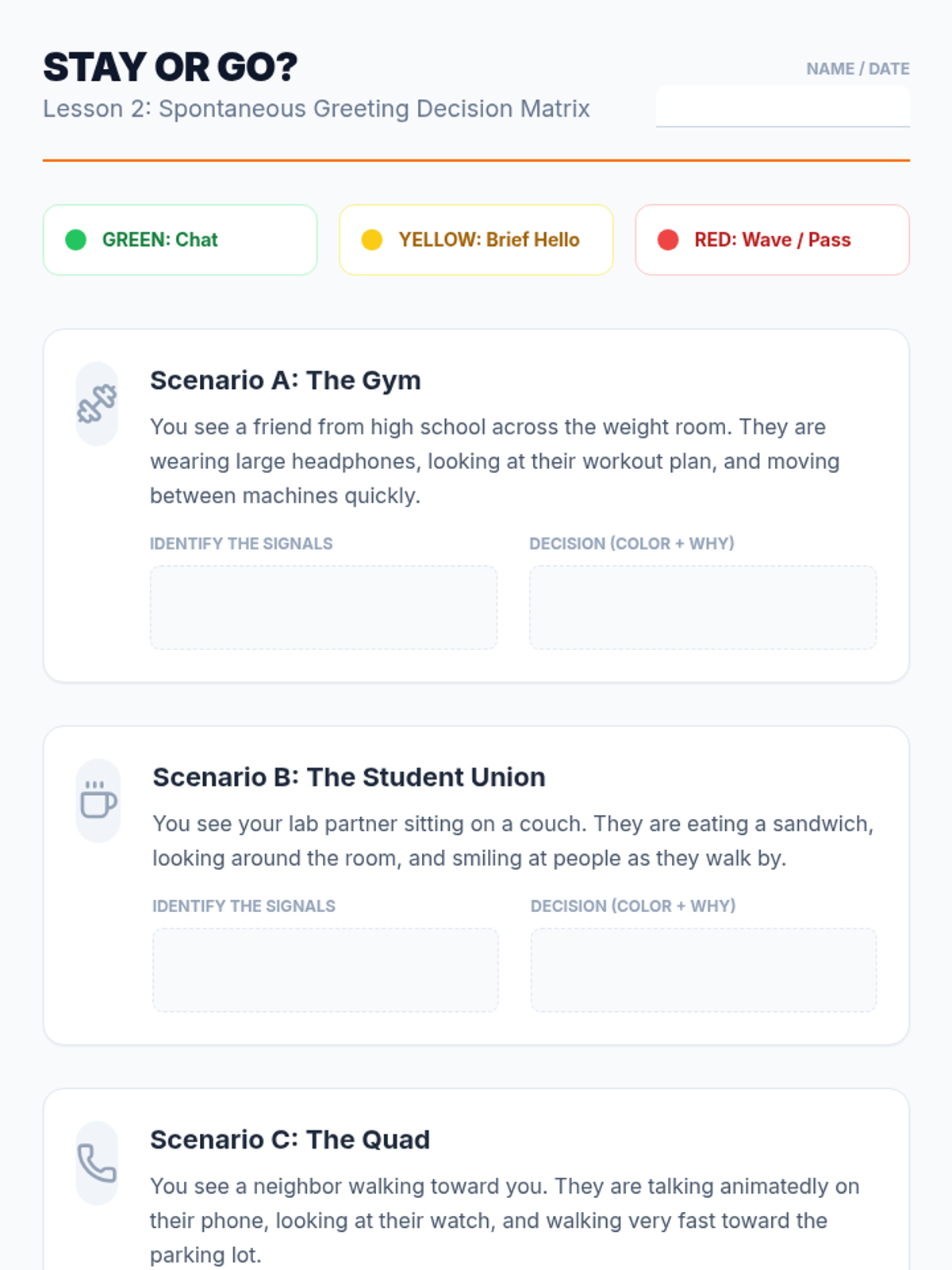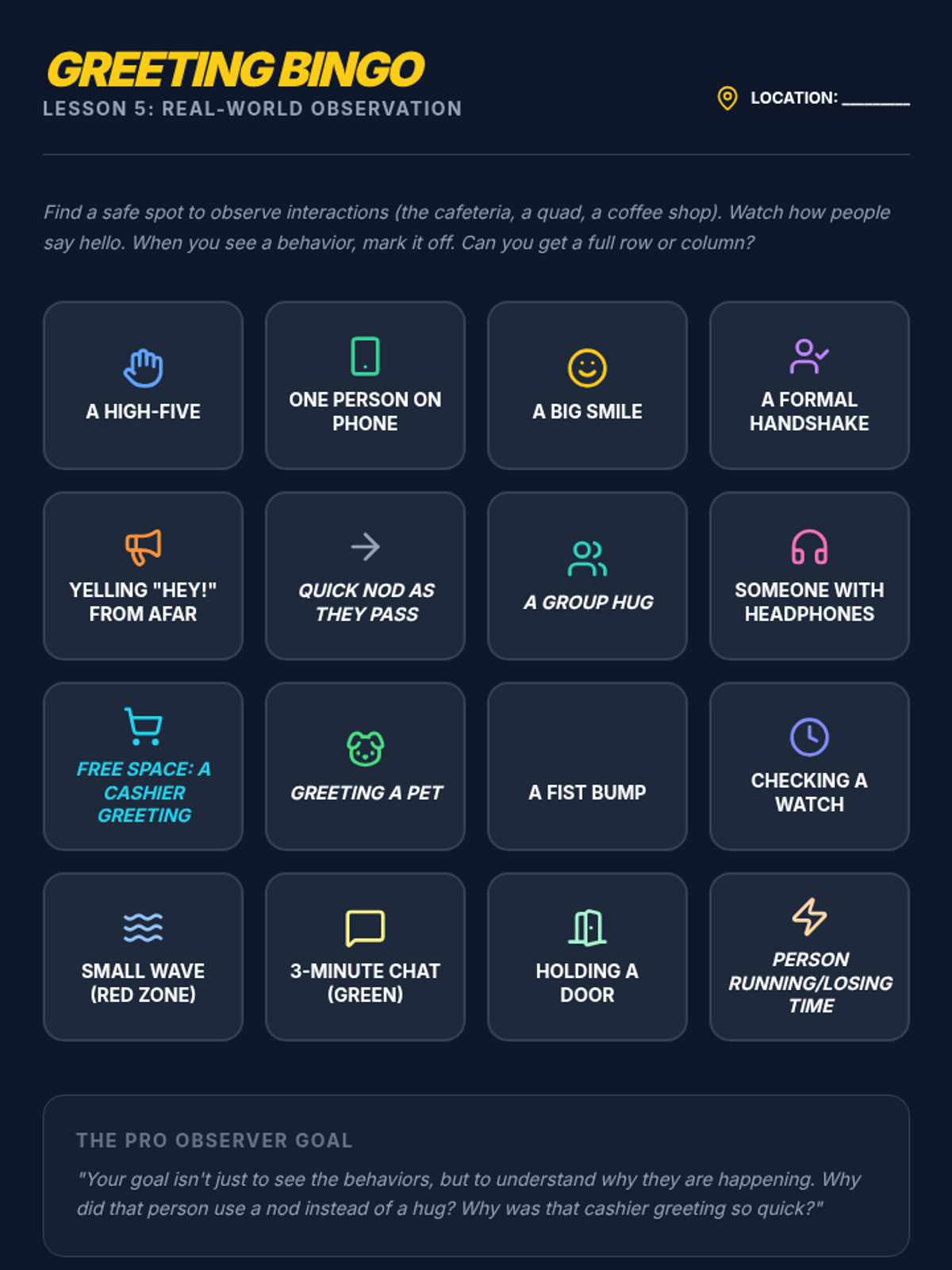 A series of lessons designed to improve social awareness, non-verbal communication, and situational appropriateness in diverse real-world environments.