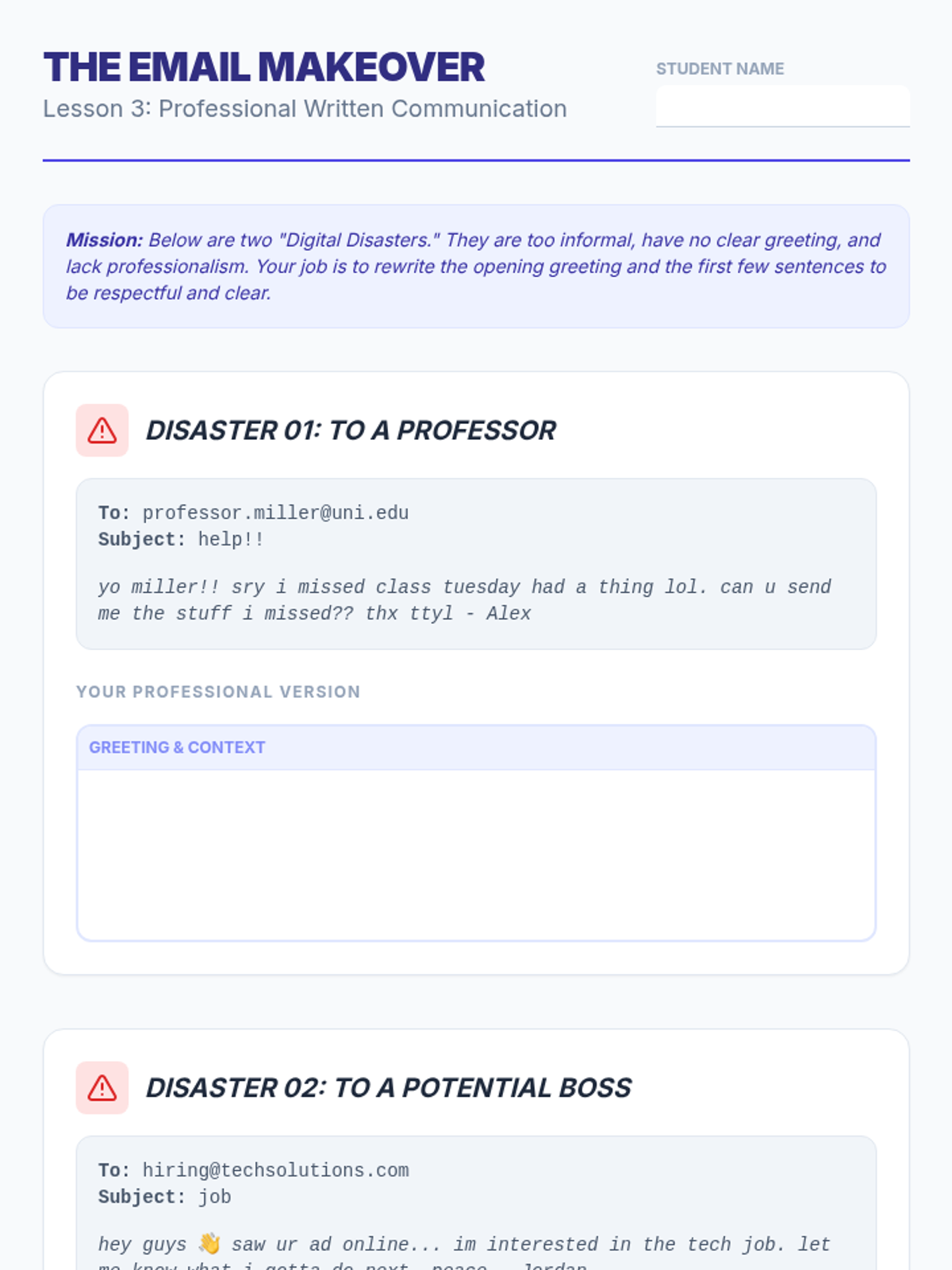 A comprehensive high school curriculum covering 11 essential employability skills, from foundational concepts to advanced application in professional settings. Includes instructional slides, student worksheets, and teacher guides for every skill.