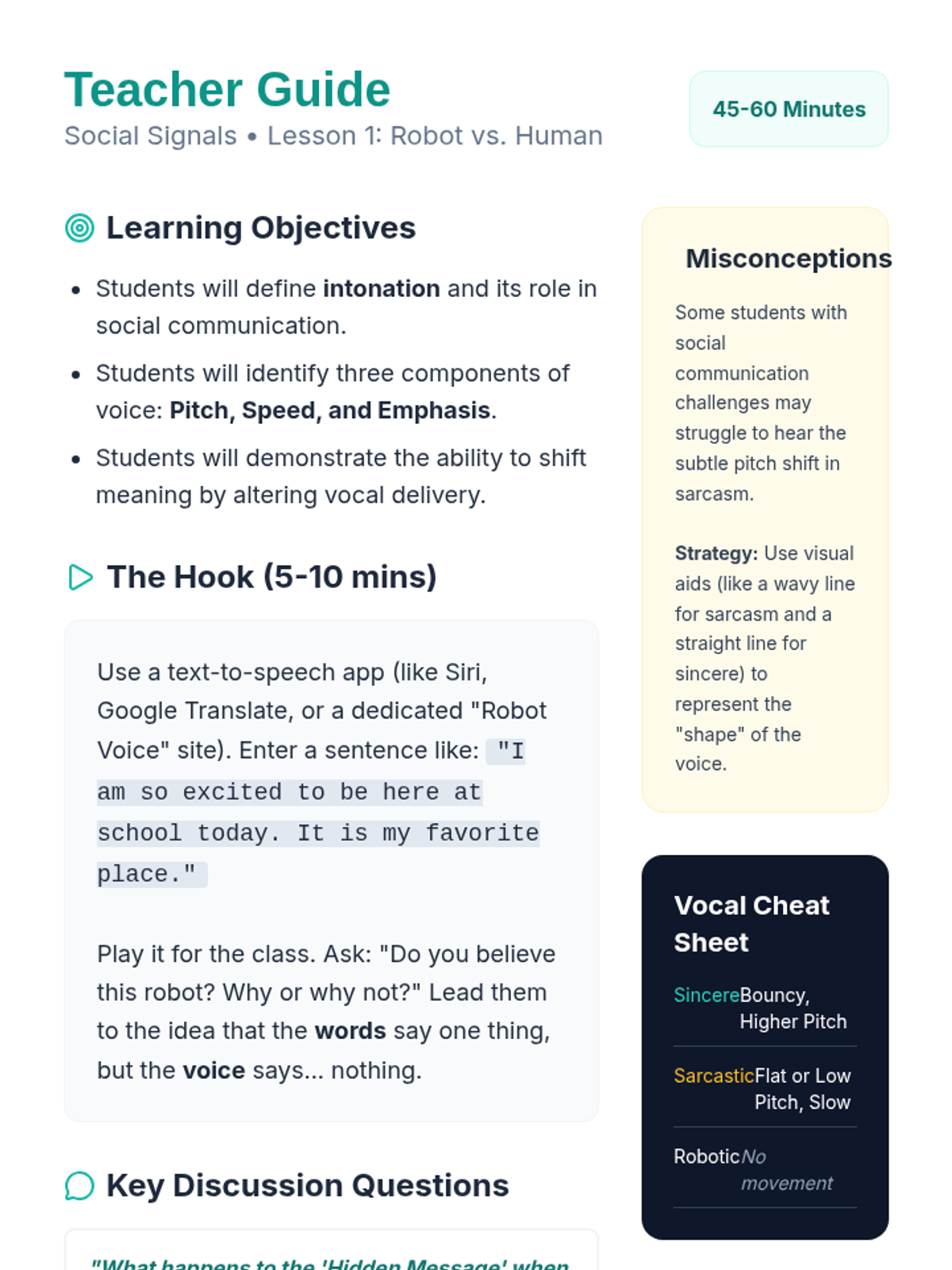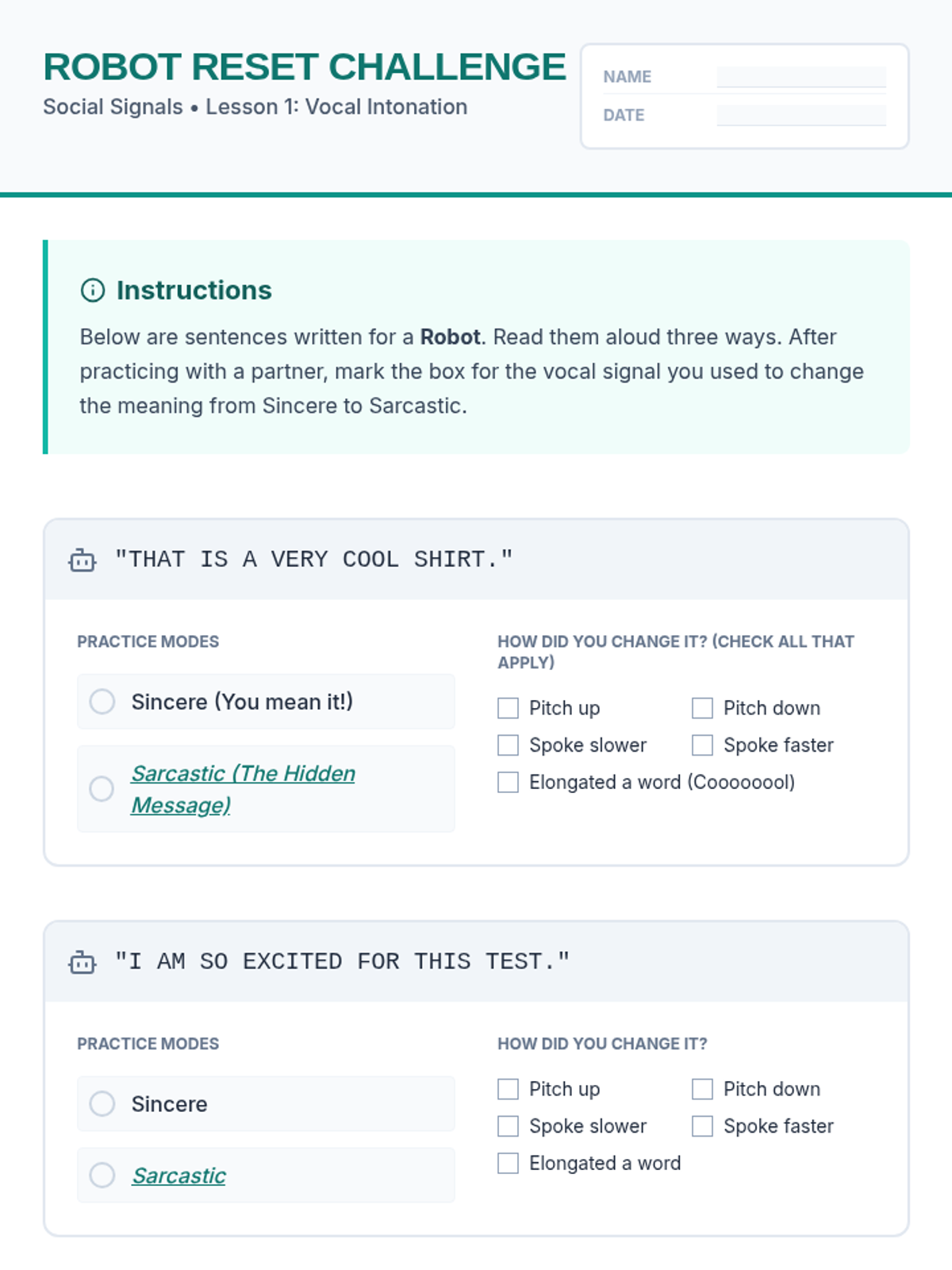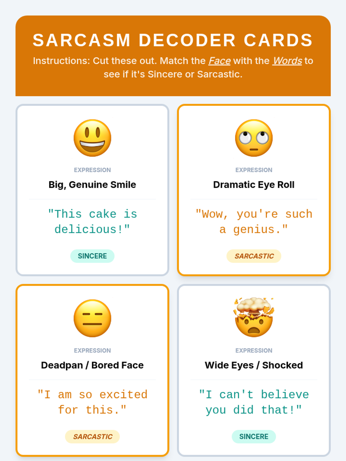 This sequence helps 6th-grade students decode the nuances of sarcasm by analyzing vocal intonation, facial expressions, and speaker intent. Students progress from basic auditory discrimination to performing complex social shifts in scripted scenarios.