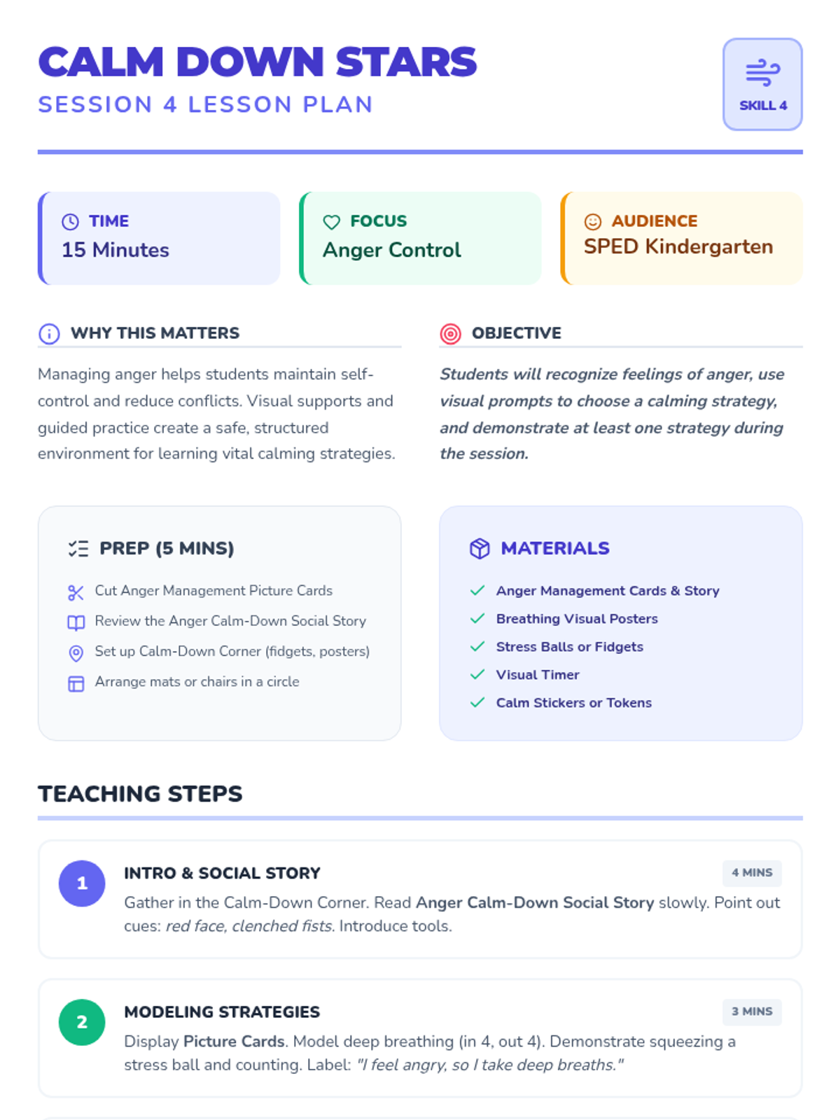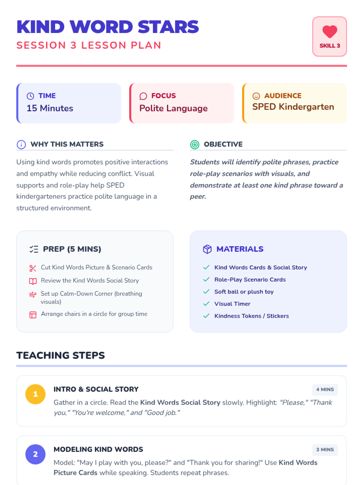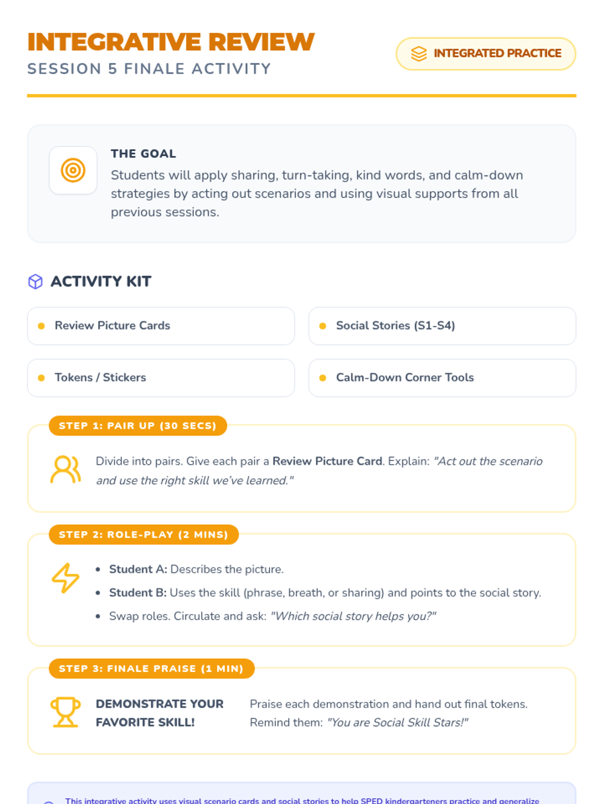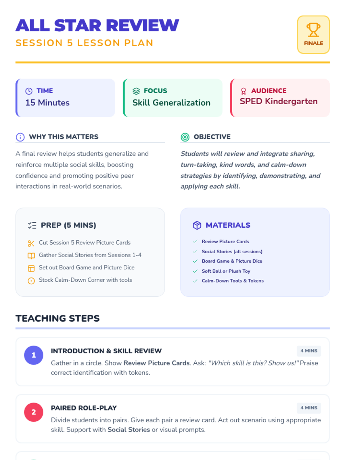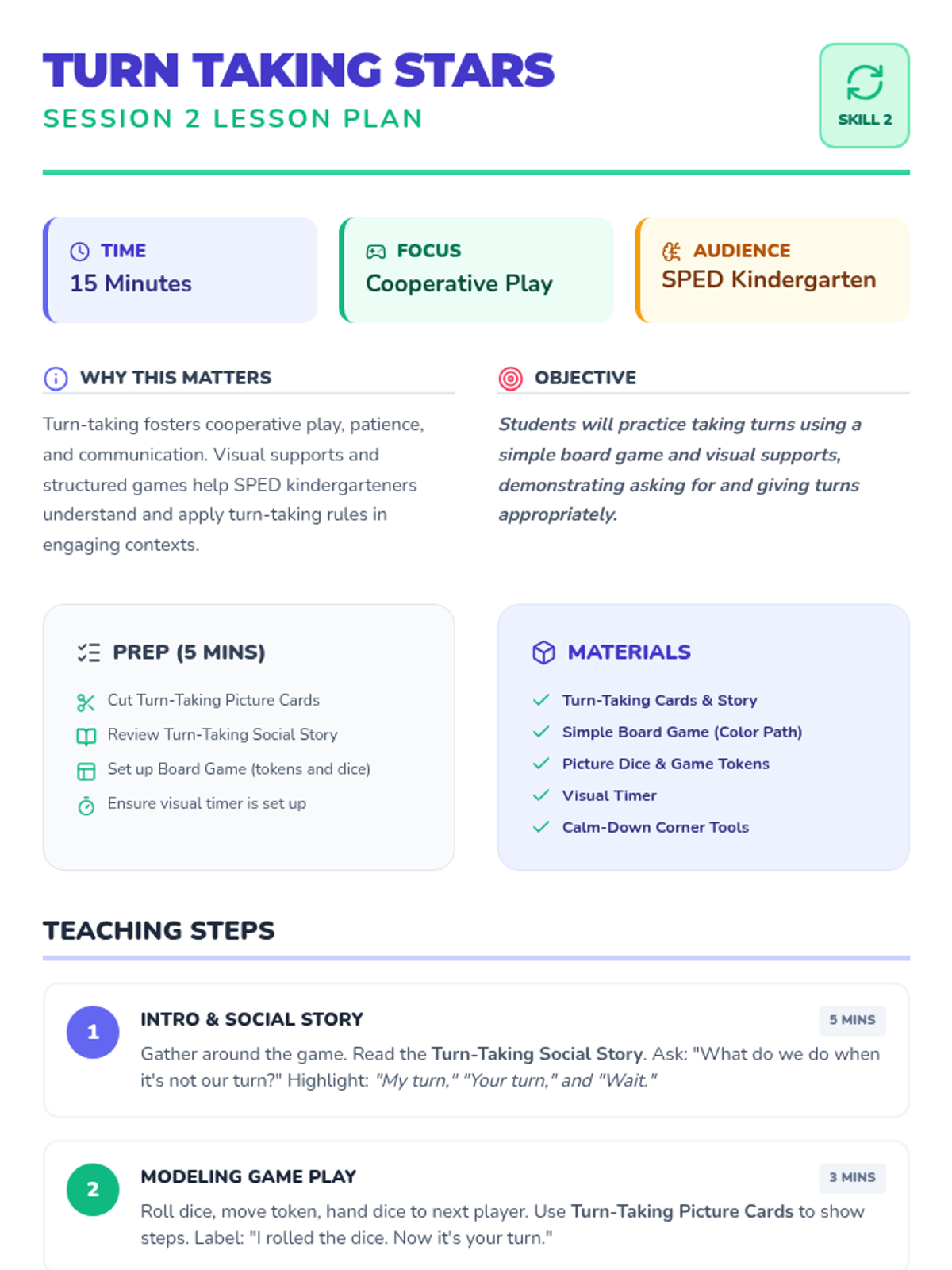 A 5-session Tier 2 social skills intervention for SPED kindergarteners, focusing on sharing, turn-taking, kind words, and anger management using visual supports and games.