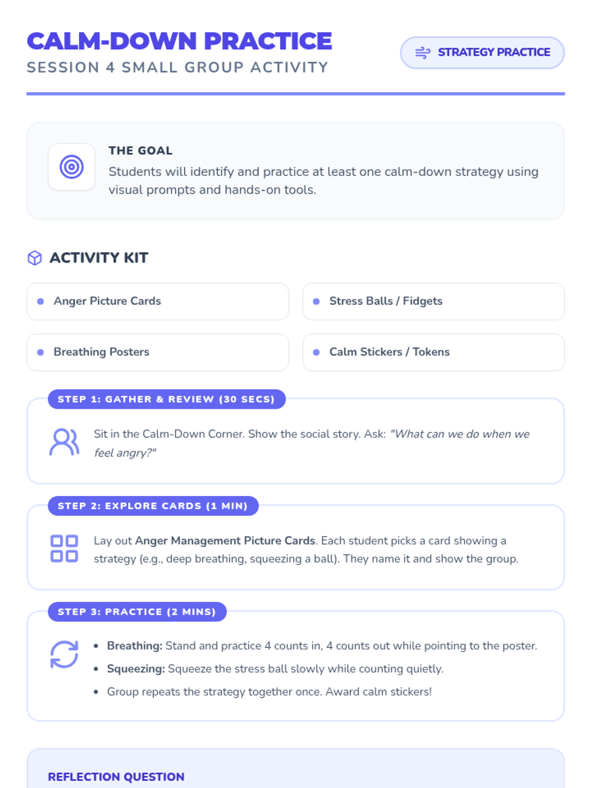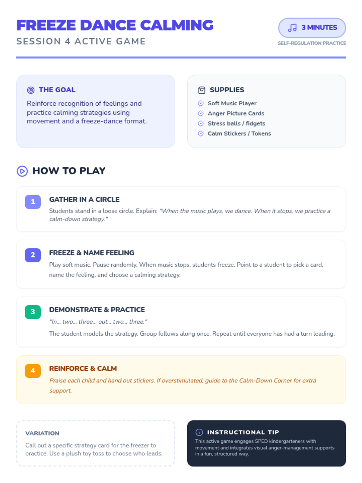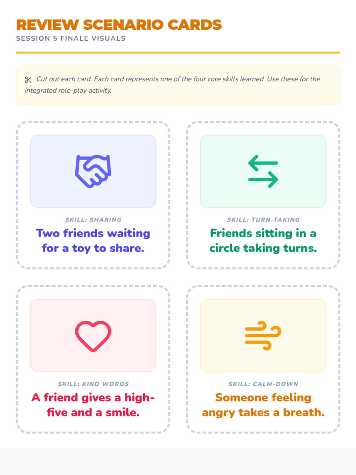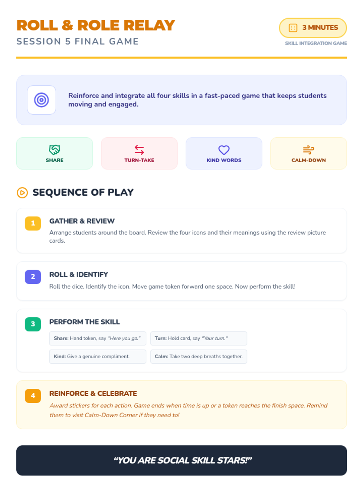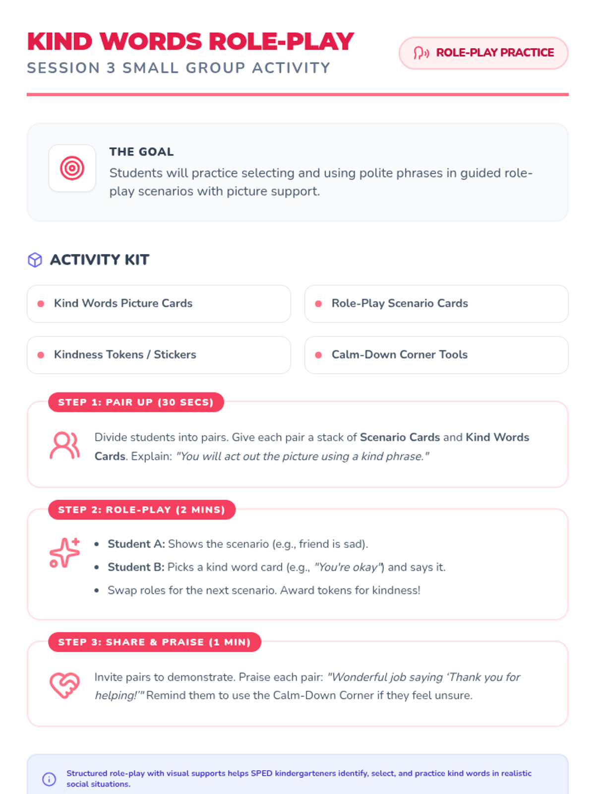 A 5-session Tier 2 social skills intervention for SPED kindergarteners, focusing on sharing, turn-taking, kind words, and anger management using visual supports and games.