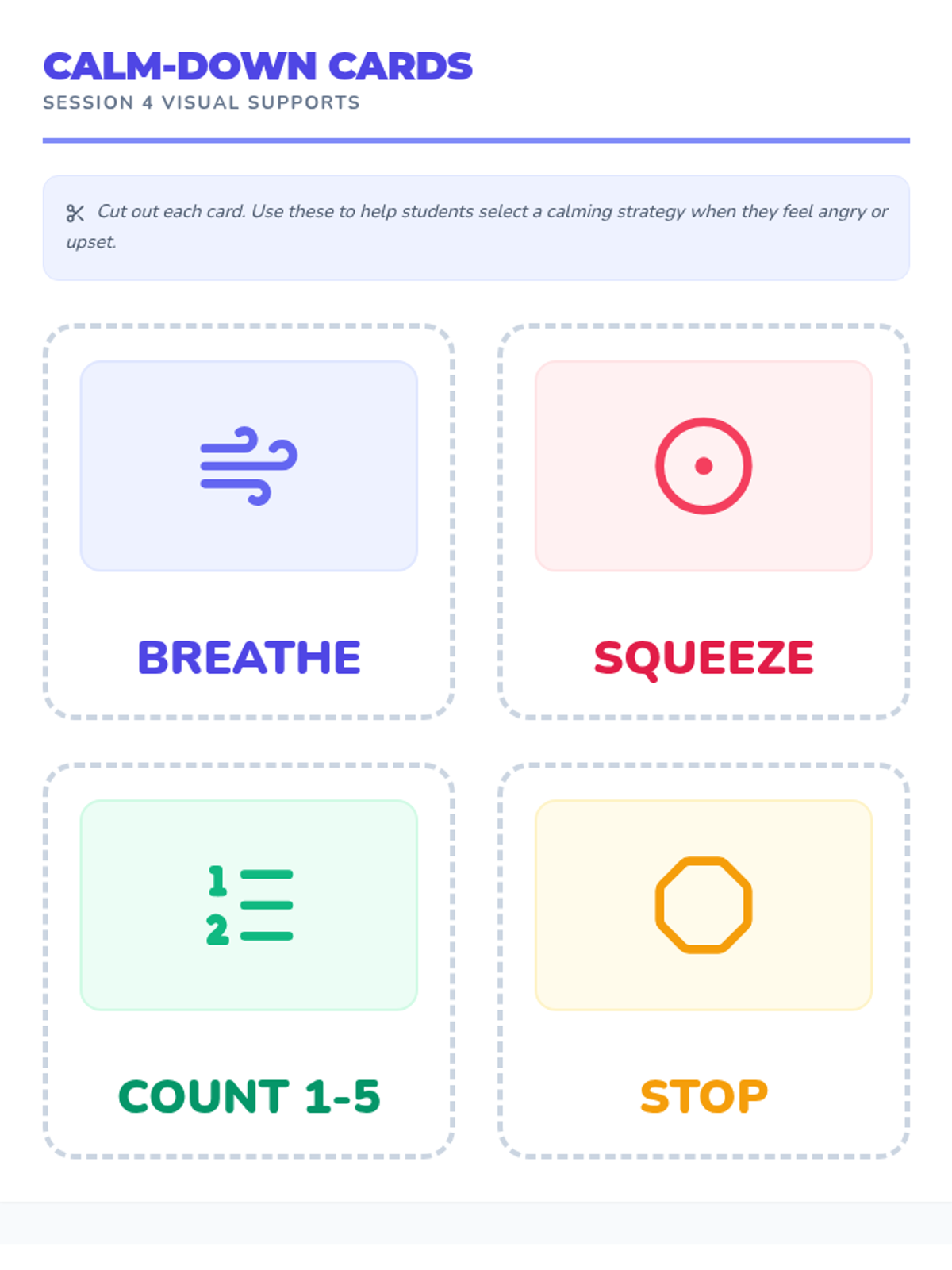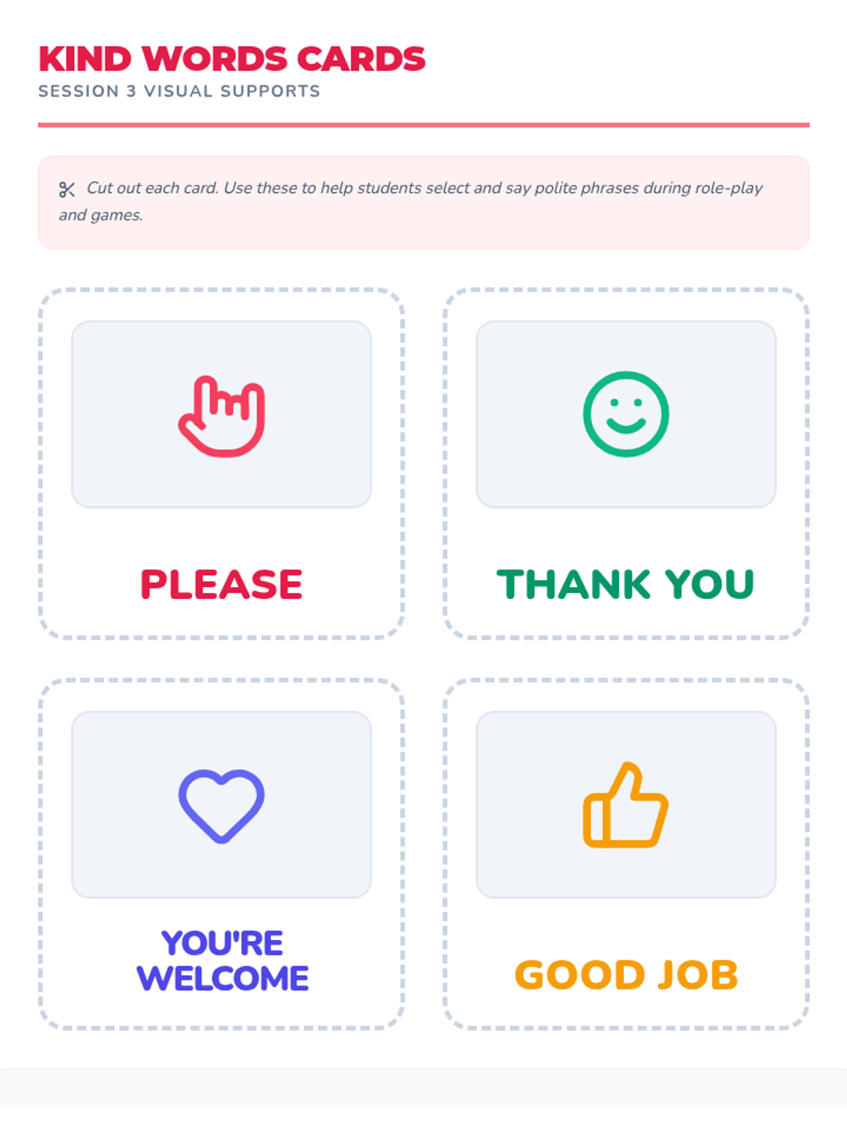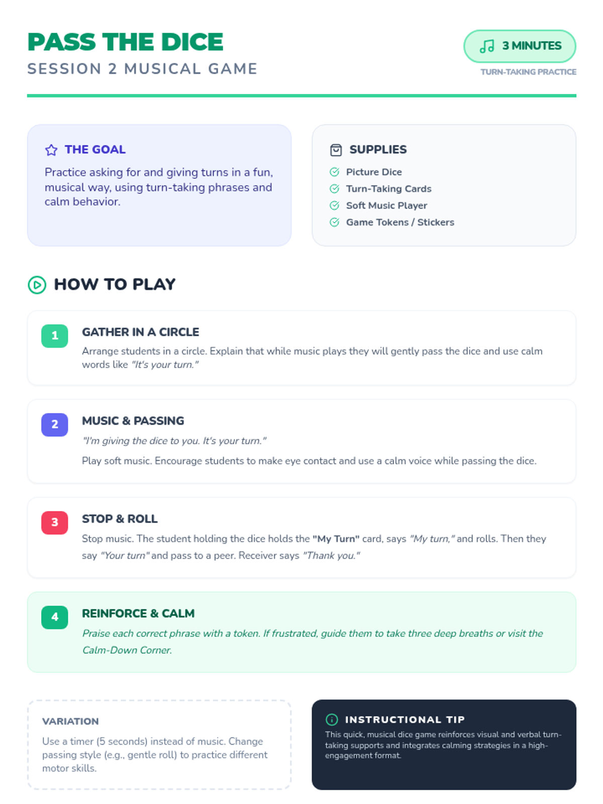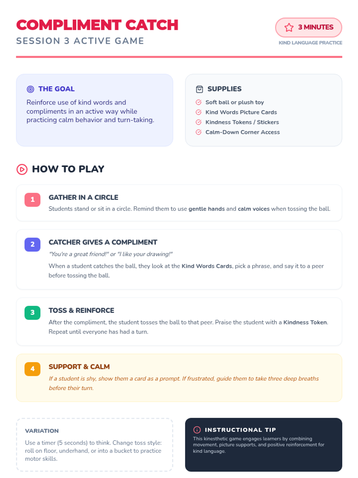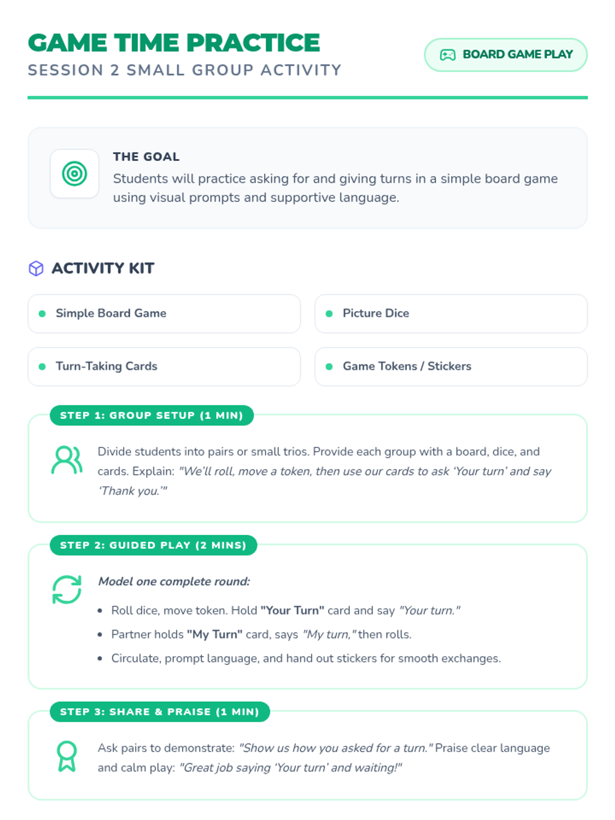 A 5-session Tier 2 social skills intervention for SPED kindergarteners, focusing on sharing, turn-taking, kind words, and anger management using visual supports and games.