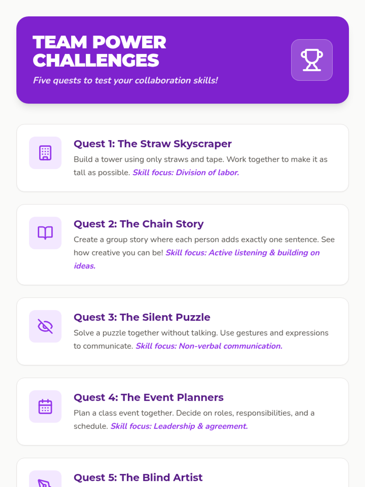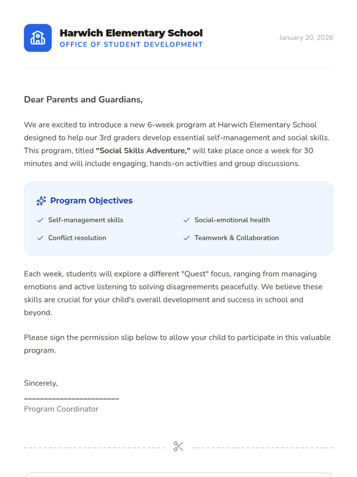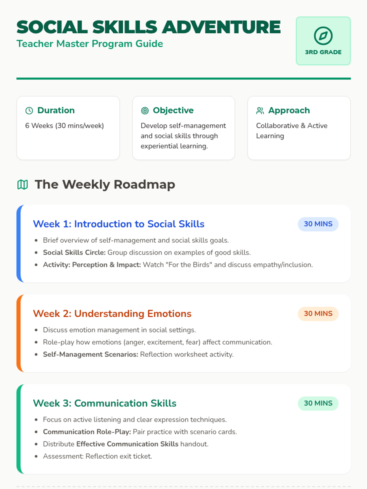A six-week experiential learning program for 3rd graders focused on developing self-management, communication, conflict resolution, and teamwork skills through a collaborative 'adventure' theme.