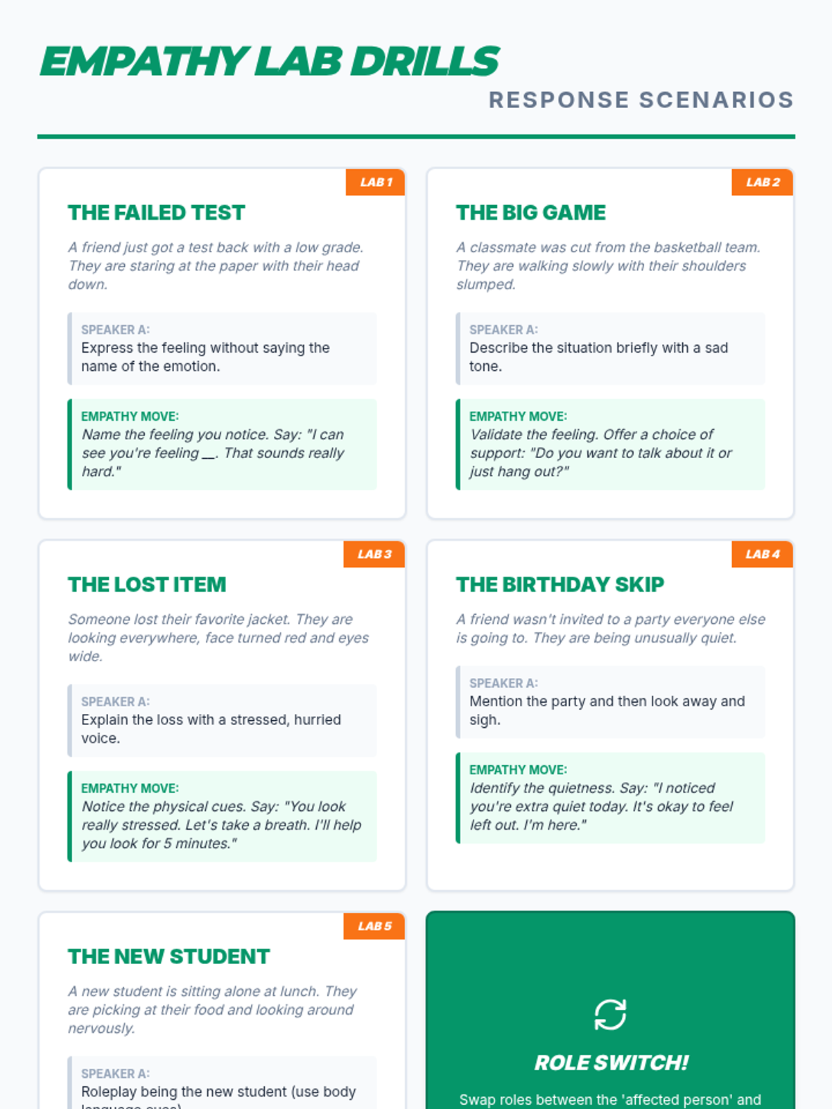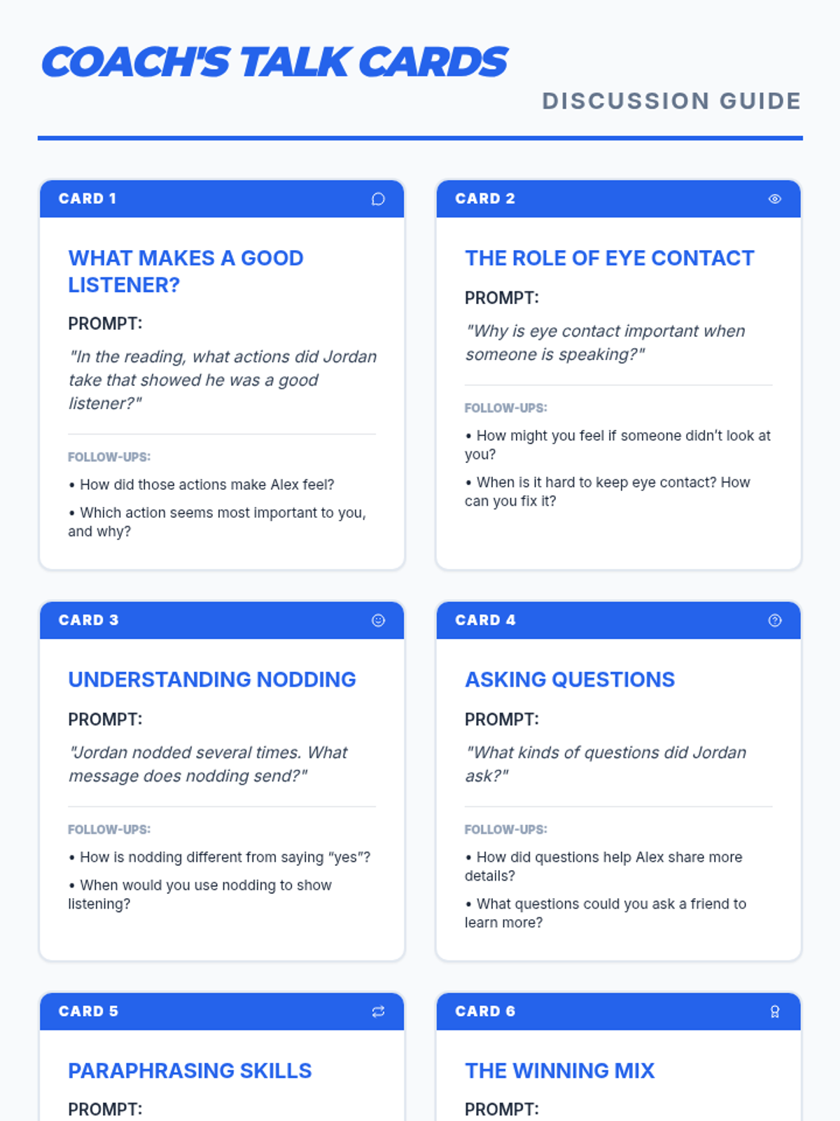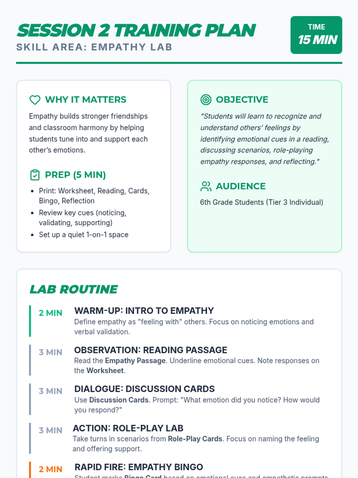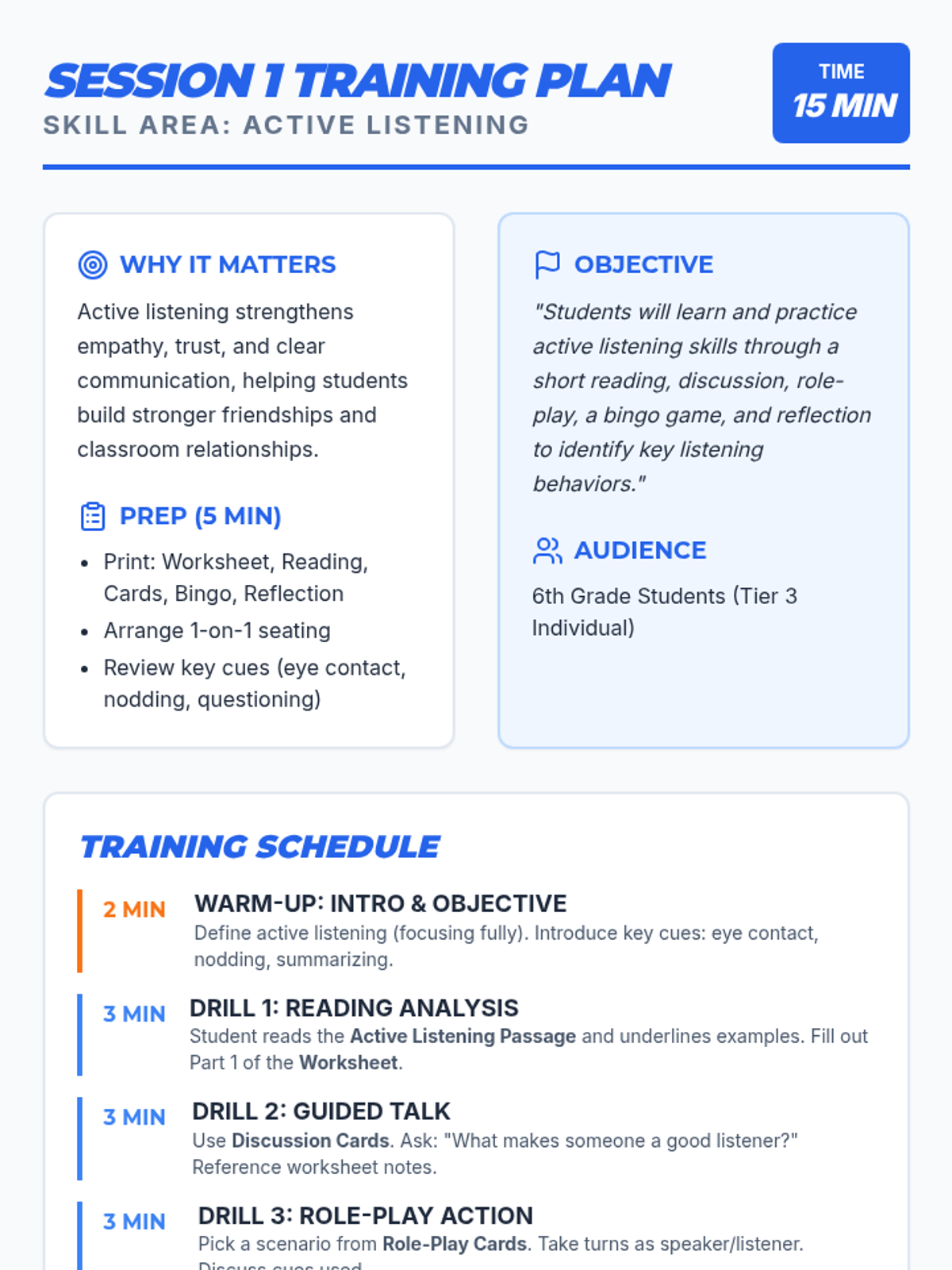 A 4-session individual social skills training program for 6th graders. These 15-minute sessions focus on active listening, empathy, assertiveness, and conflict resolution using a high-energy 'gym training' theme for Tier 3 support.