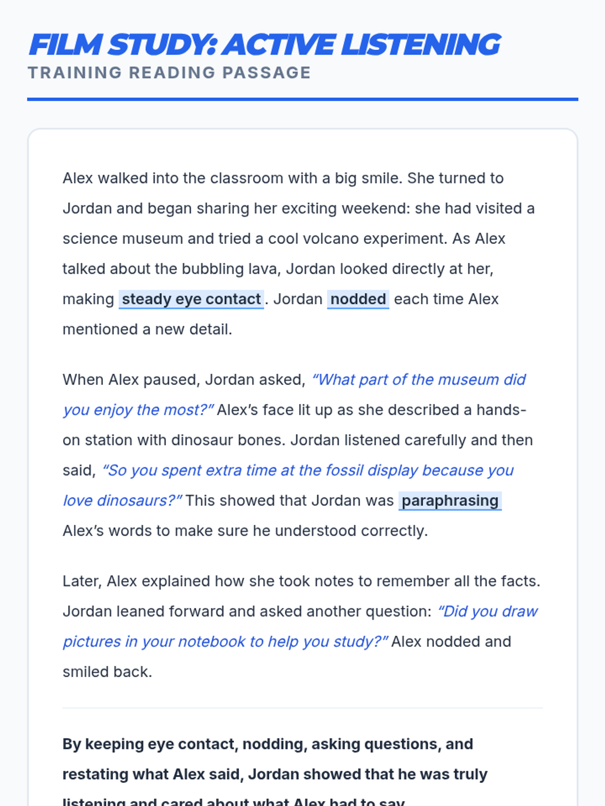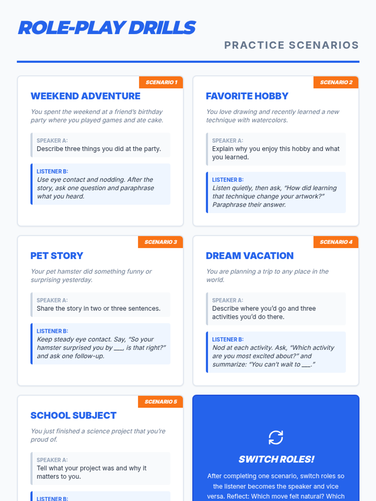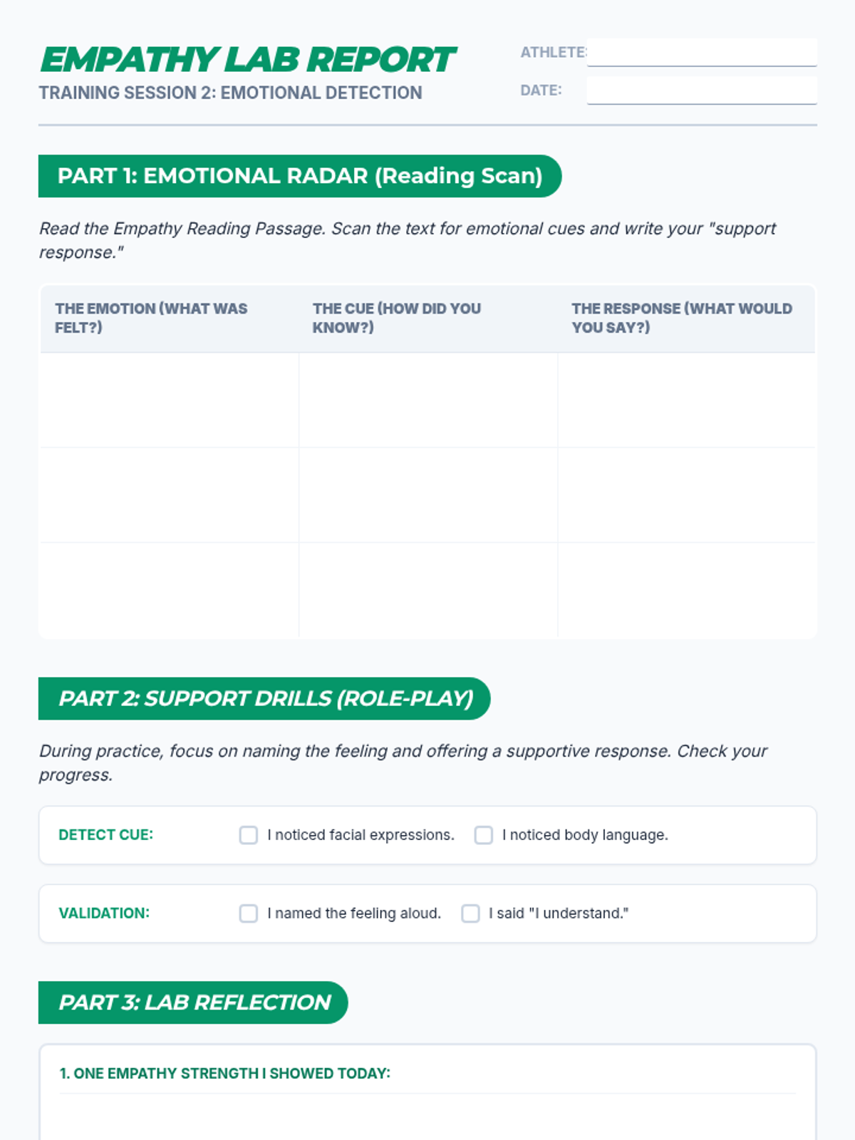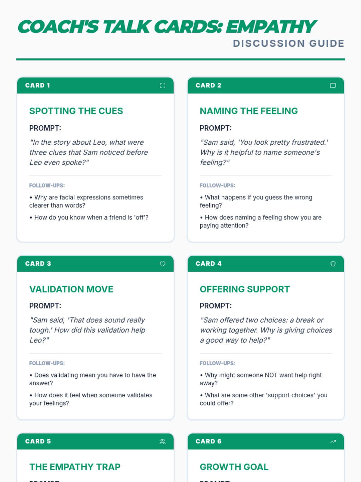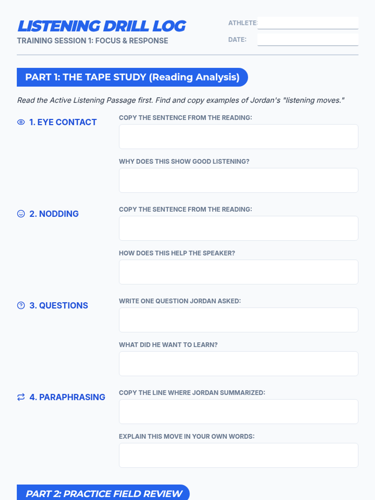 A 4-session individual social skills training program for 6th graders. These 15-minute sessions focus on active listening, empathy, assertiveness, and conflict resolution using a high-energy 'gym training' theme for Tier 3 support.
