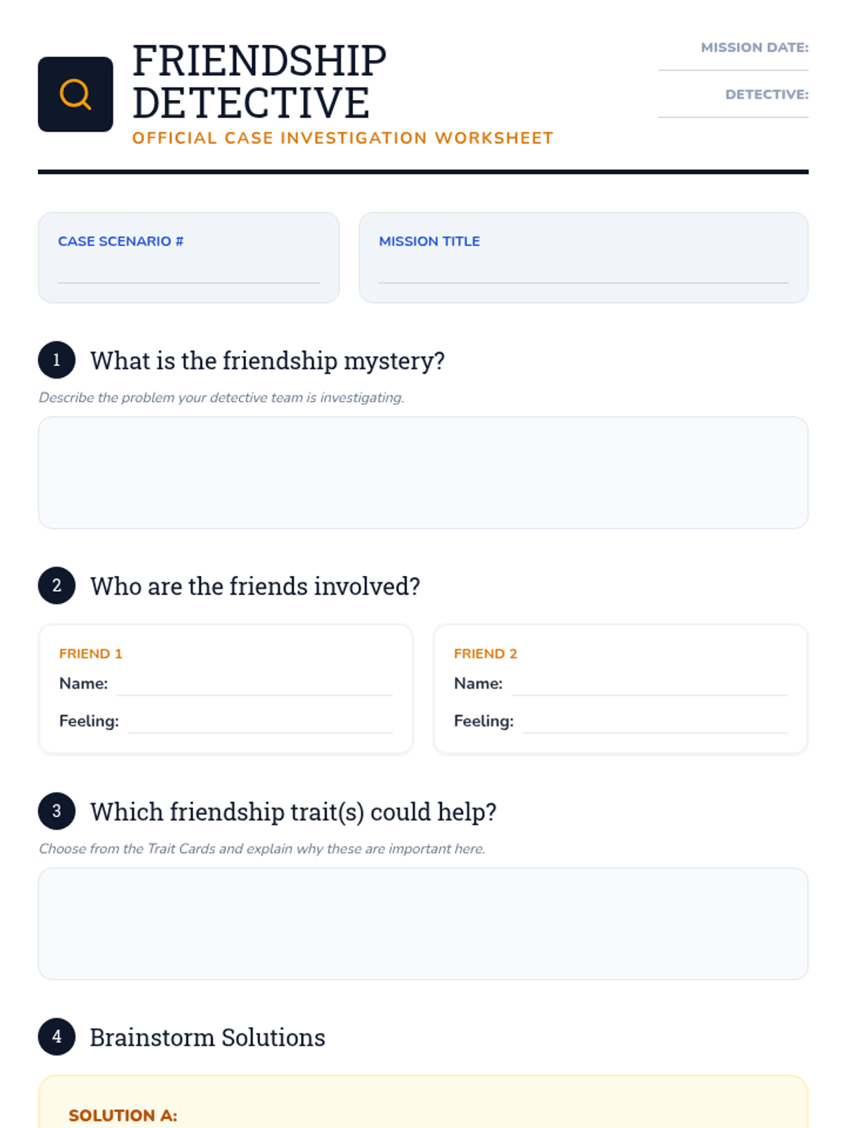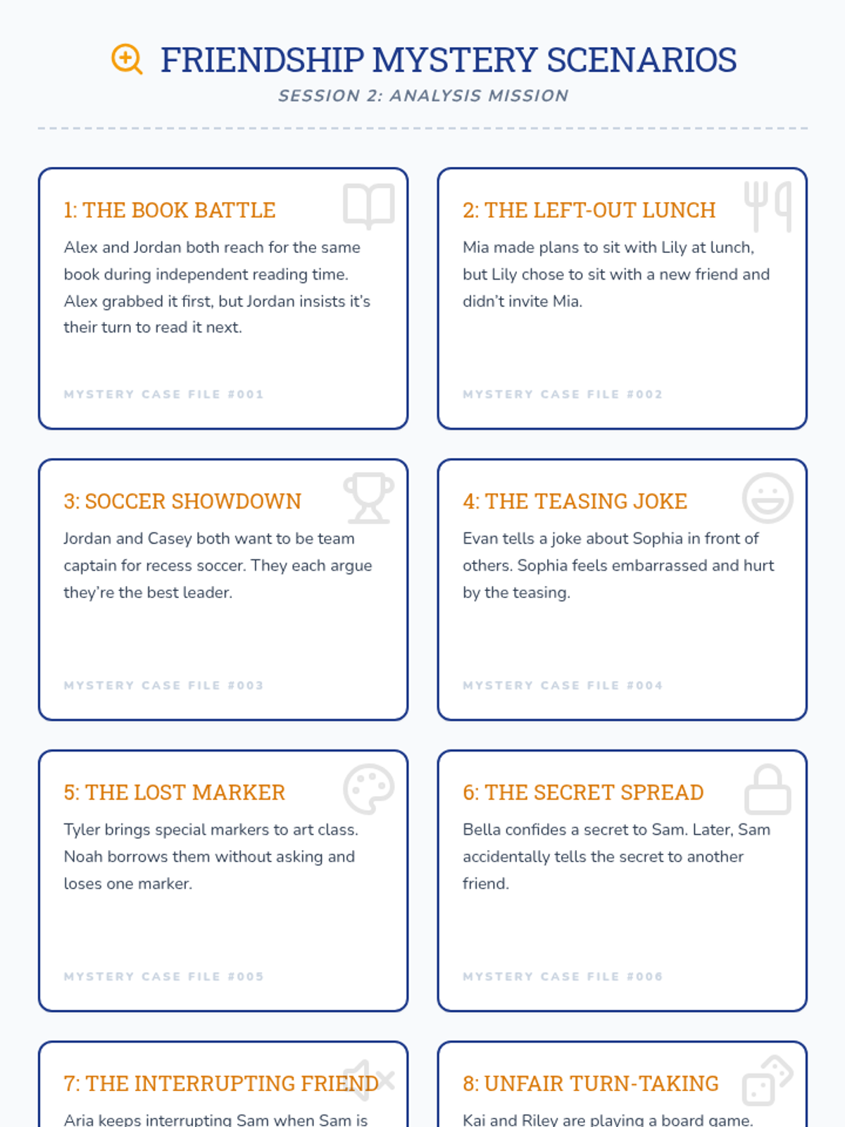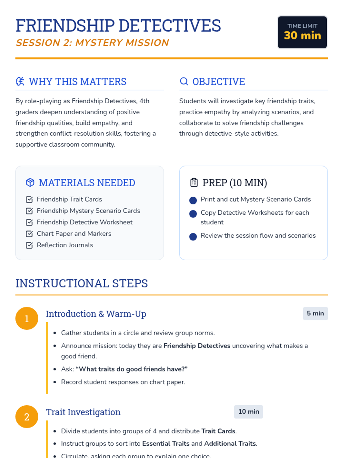 A two-session Tier 2 group lesson sequence for 4th graders to build social skills, empathy, and conflict-resolution strategies through a detective-themed exploration of friendship.