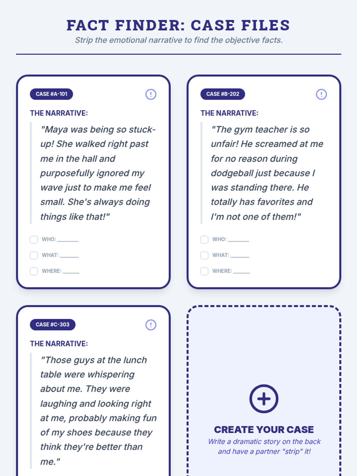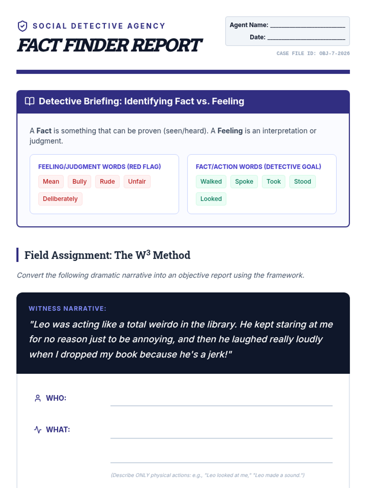 A comprehensive 5-lesson unit for 7th grade students focusing on social problem-solving. This sequence guides students from identifying the size of a conflict to objectively defining facts, brainstorming diverse solutions, and selecting the most assertive and effective response.