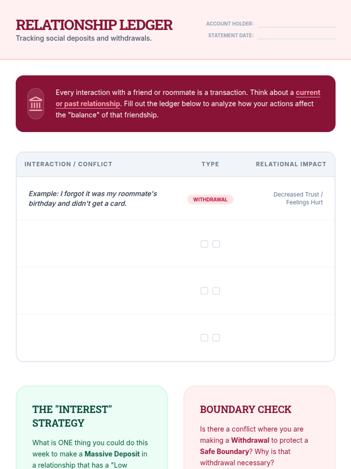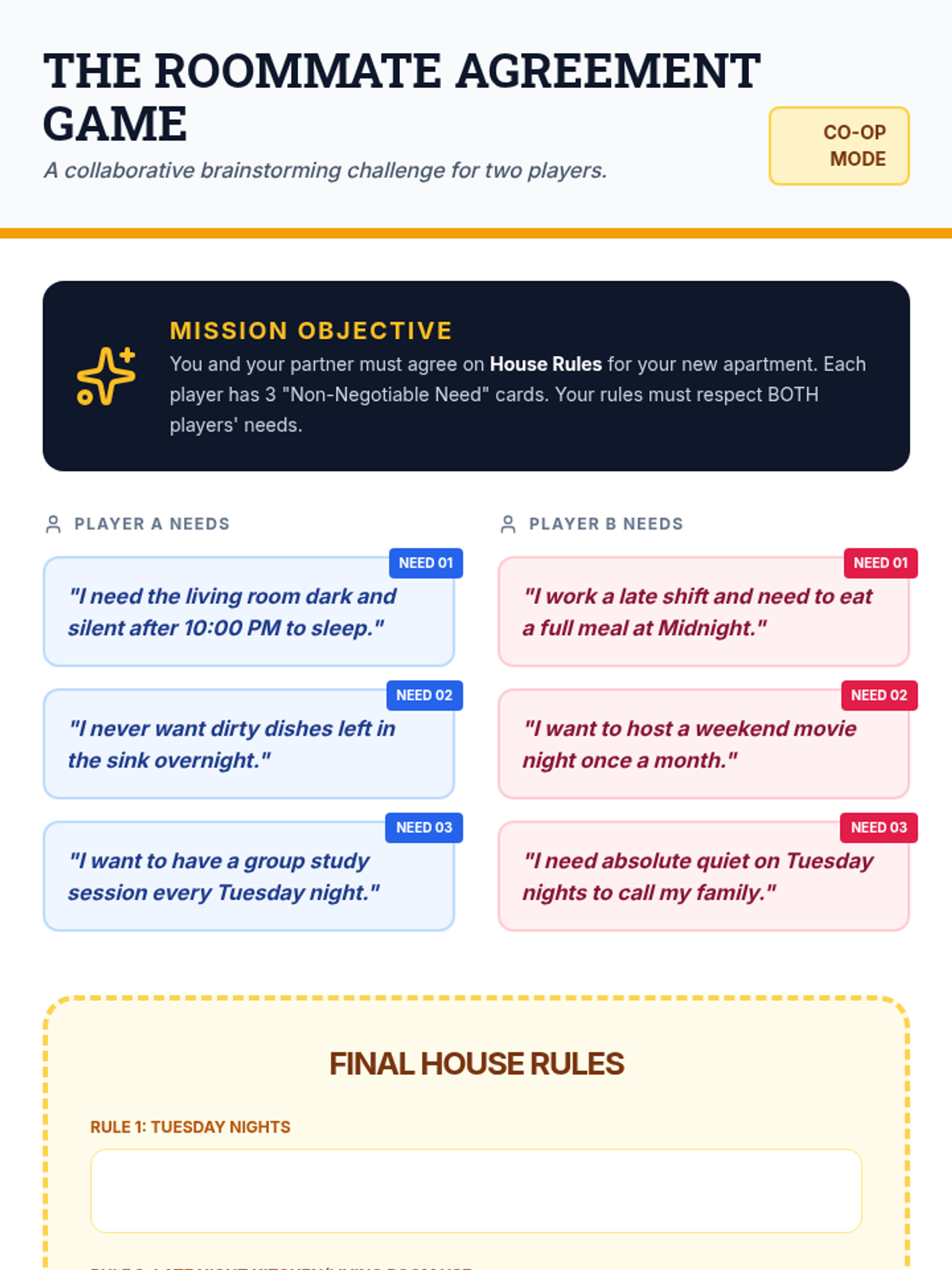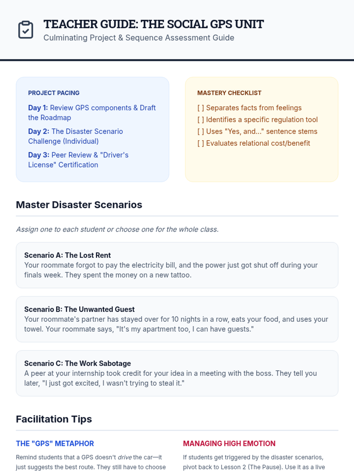 A 5-lesson unit for 11th-grade students focusing on navigating complex interpersonal conflicts with roommates and peers. Students learn to deconstruct ambiguous social situations, regulate their emotions, brainstorm collaborative solutions, and evaluate the long-term impact of their choices on relationships.