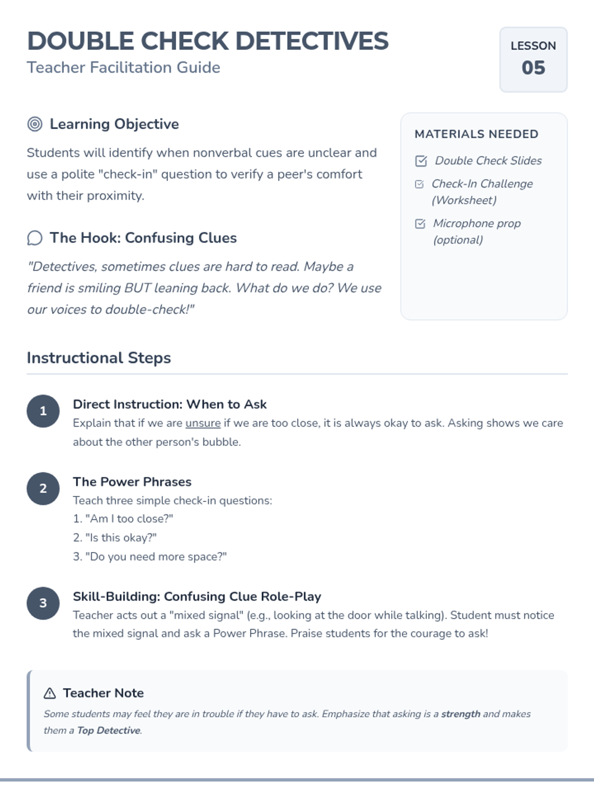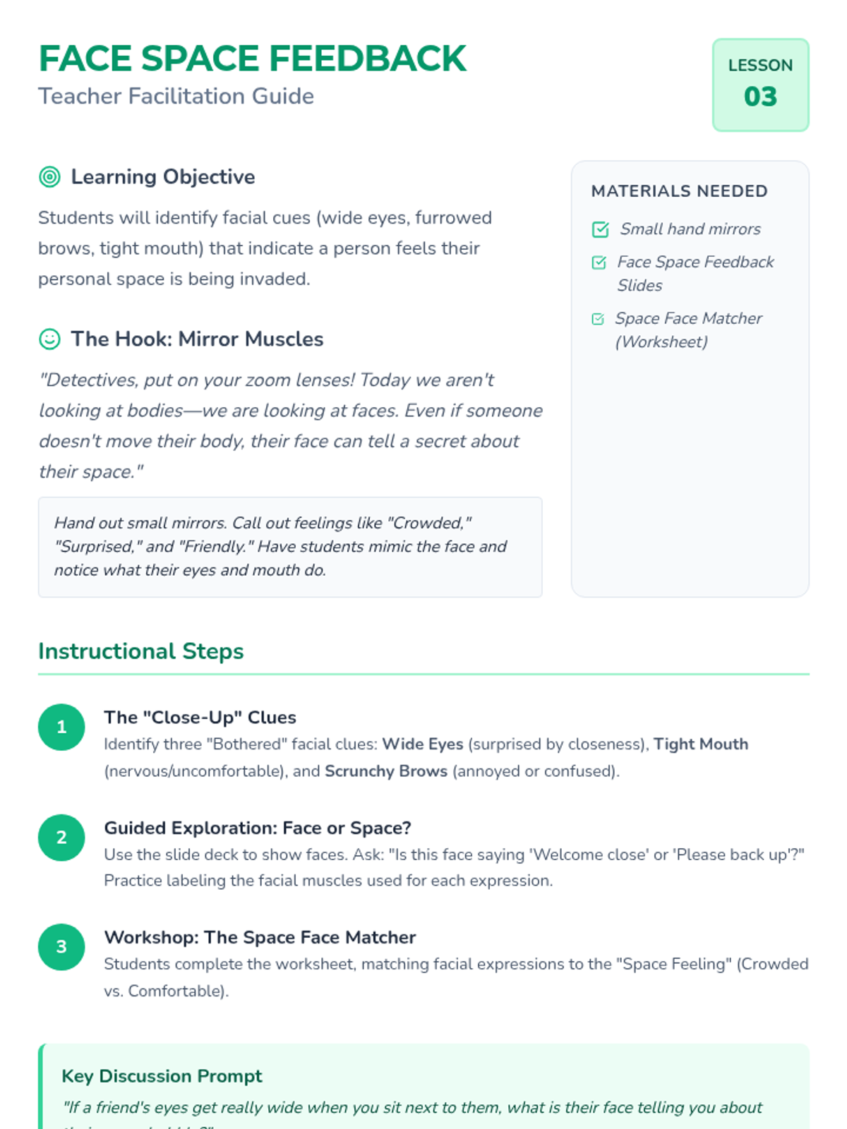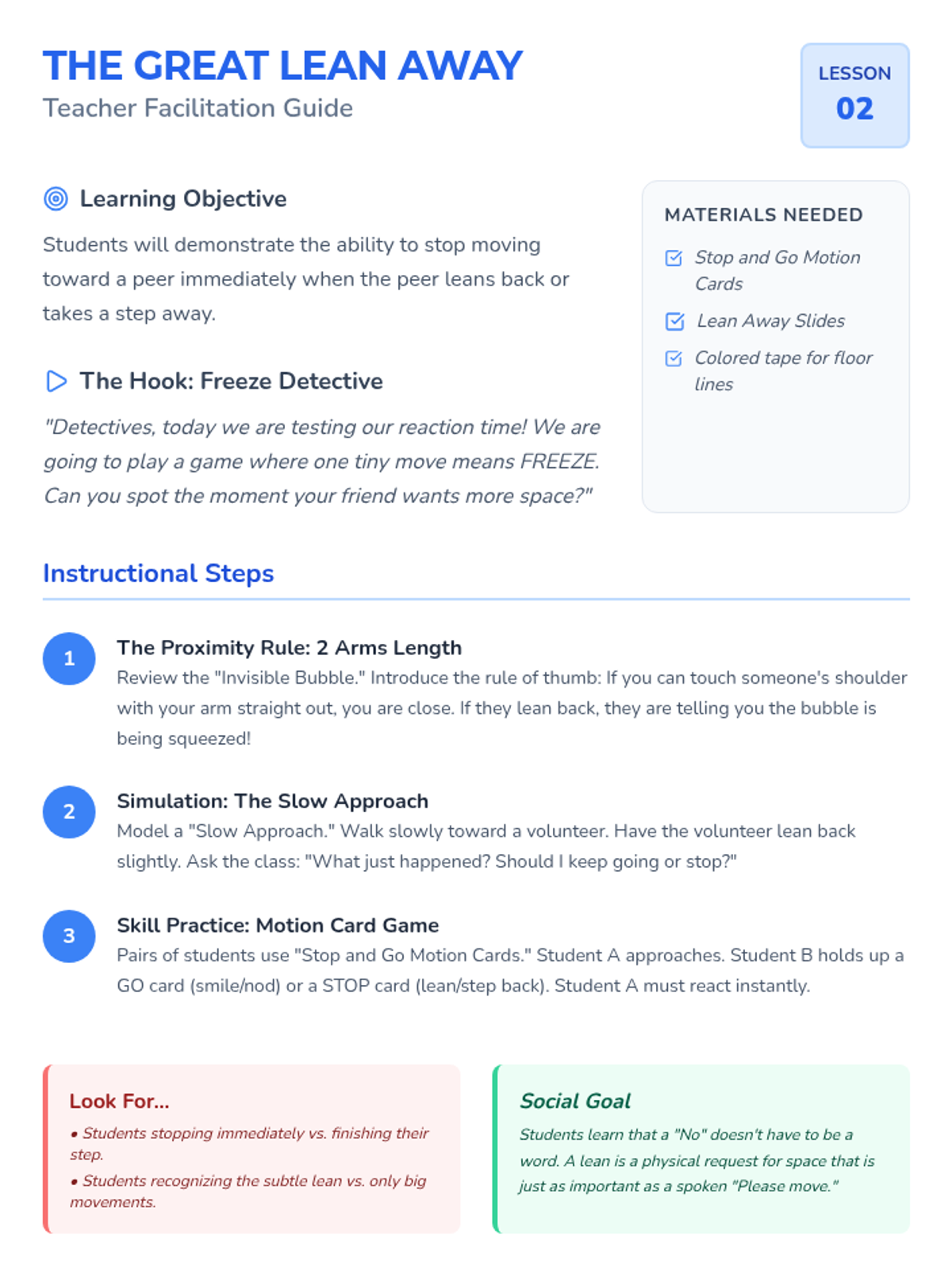 This sequence teaches 2nd grade students to interpret nonverbal cues like body language and facial expressions to respect personal space. Students learn to recognize 'stop' and 'go' signals and practice adjusting their proximity based on real-time social feedback.
