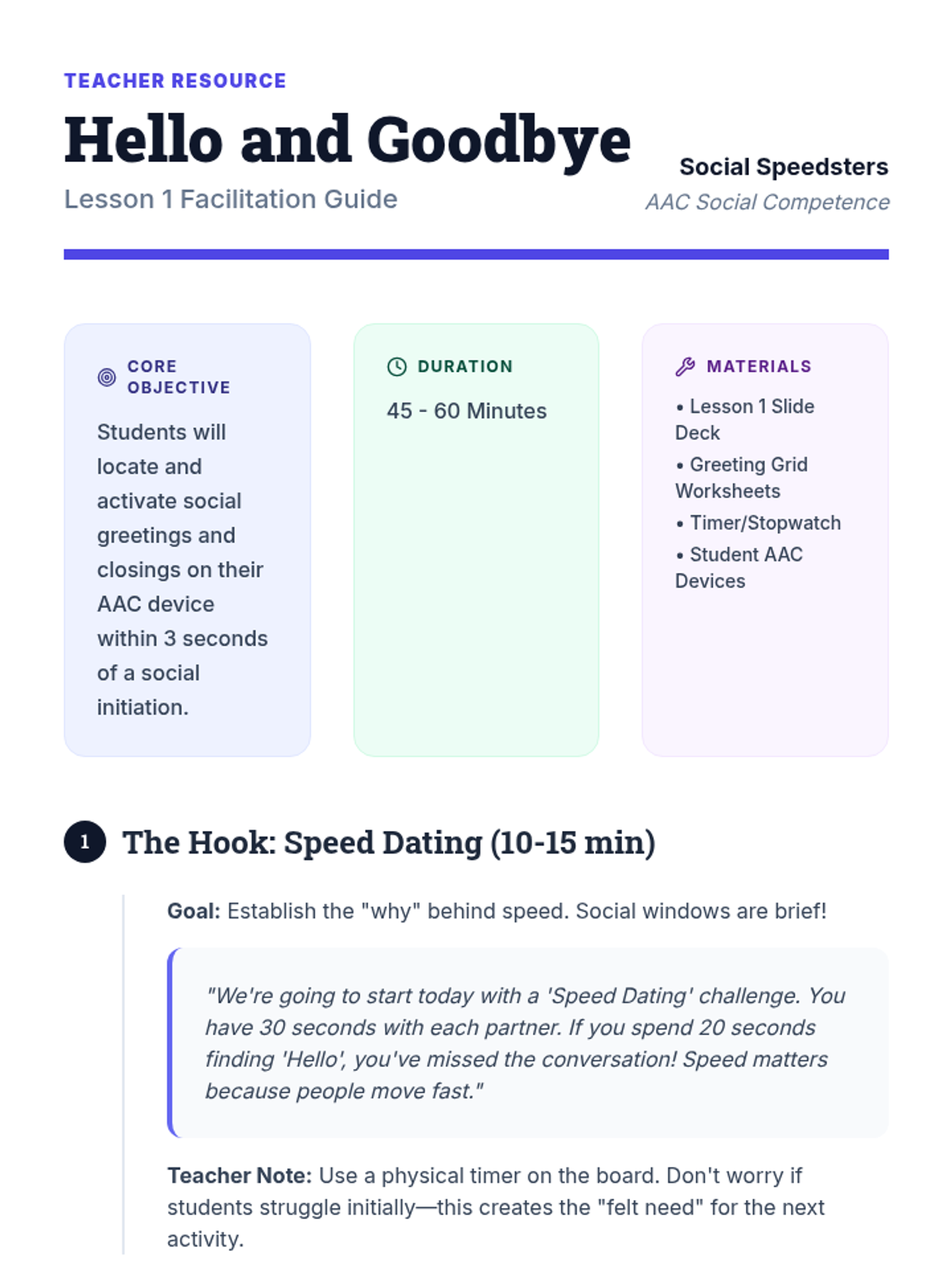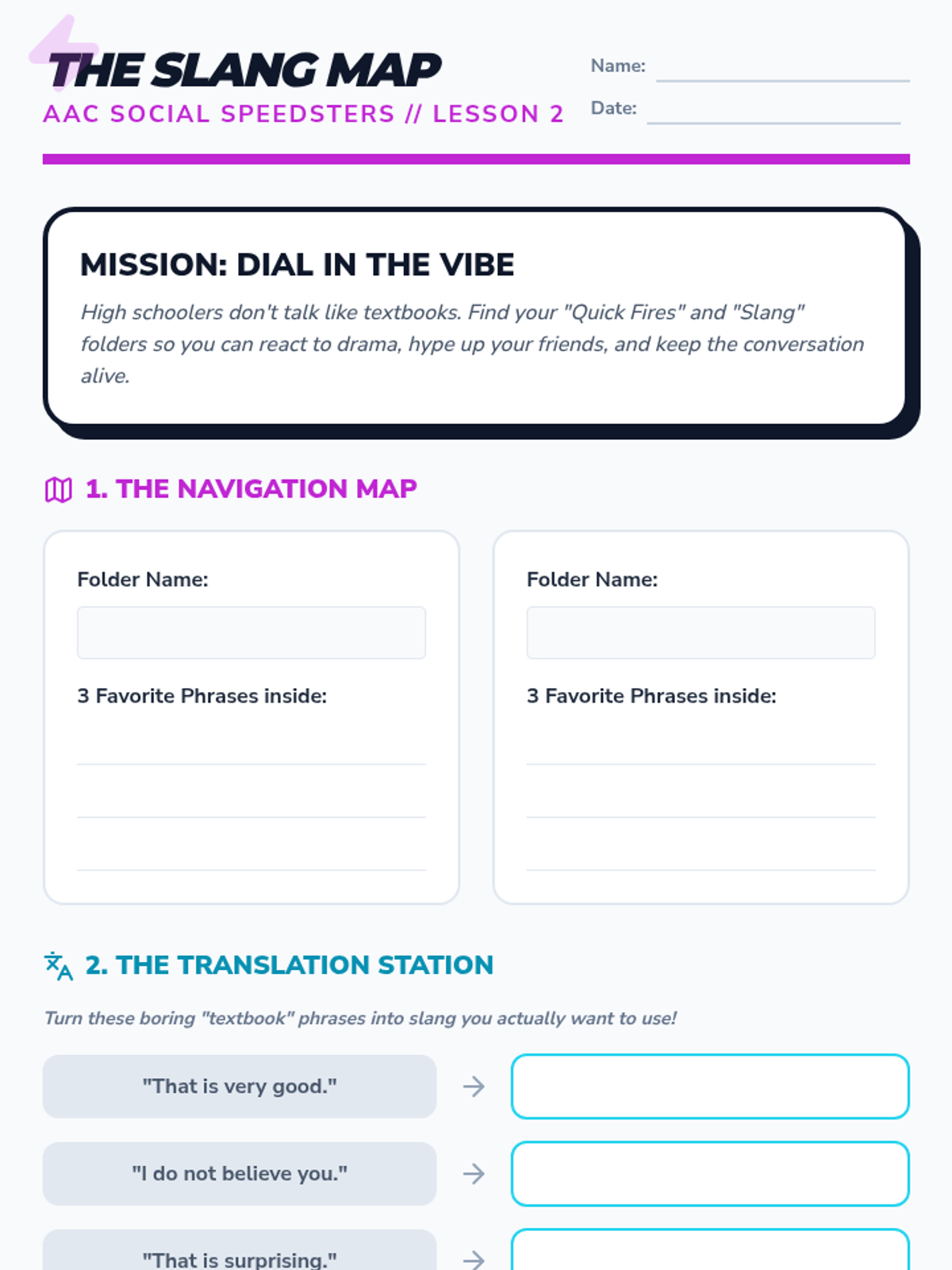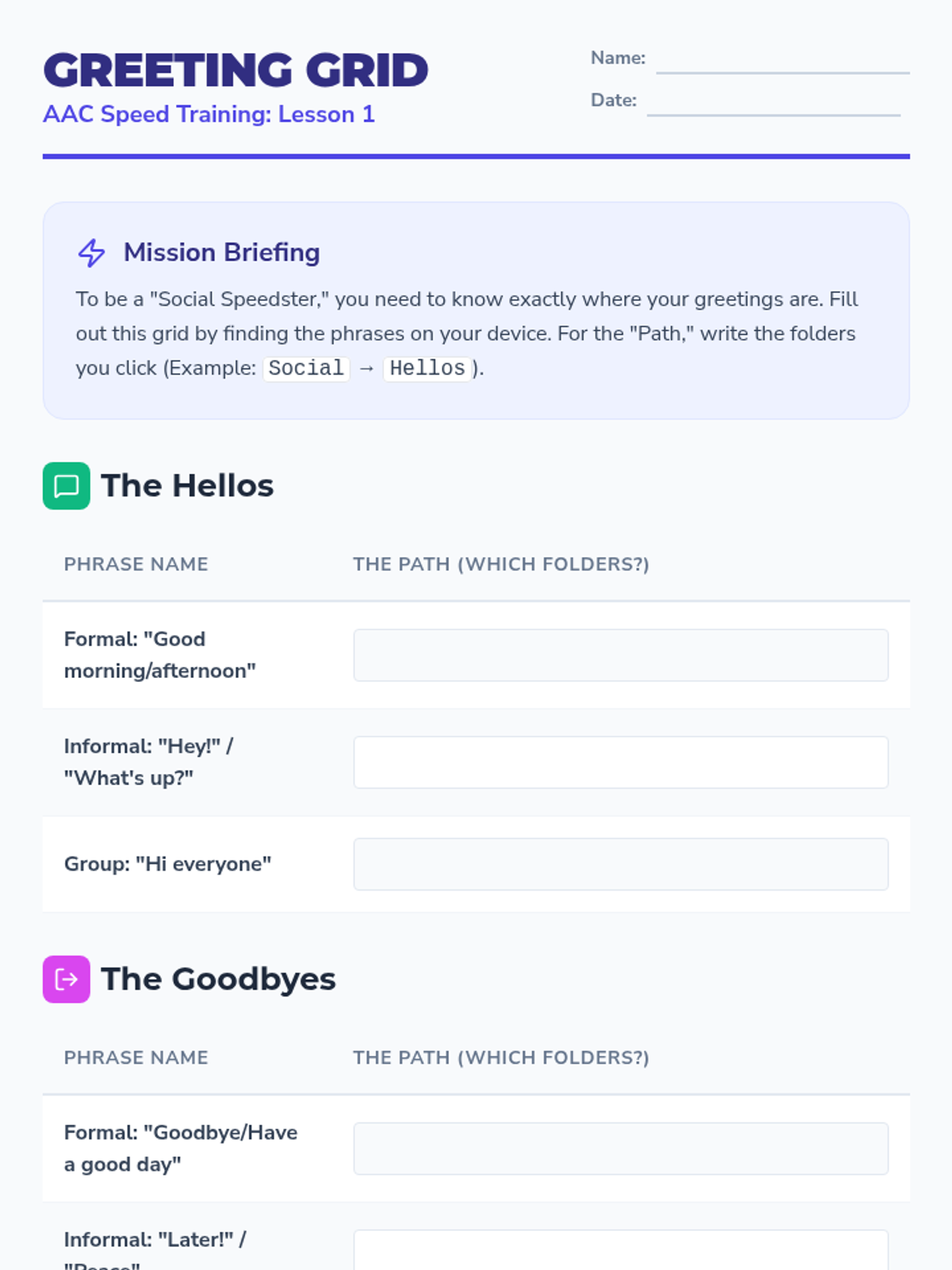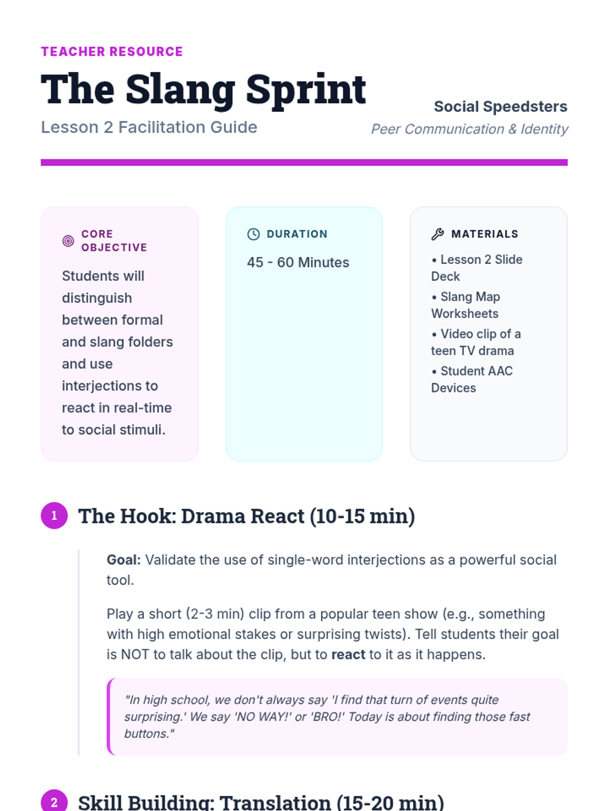 A comprehensive 9th-grade sequence focused on improving the speed and social relevance of AAC device navigation for high school students. Students practice rapid access to greetings, slang, narratives, and questions to enhance real-time peer interactions.