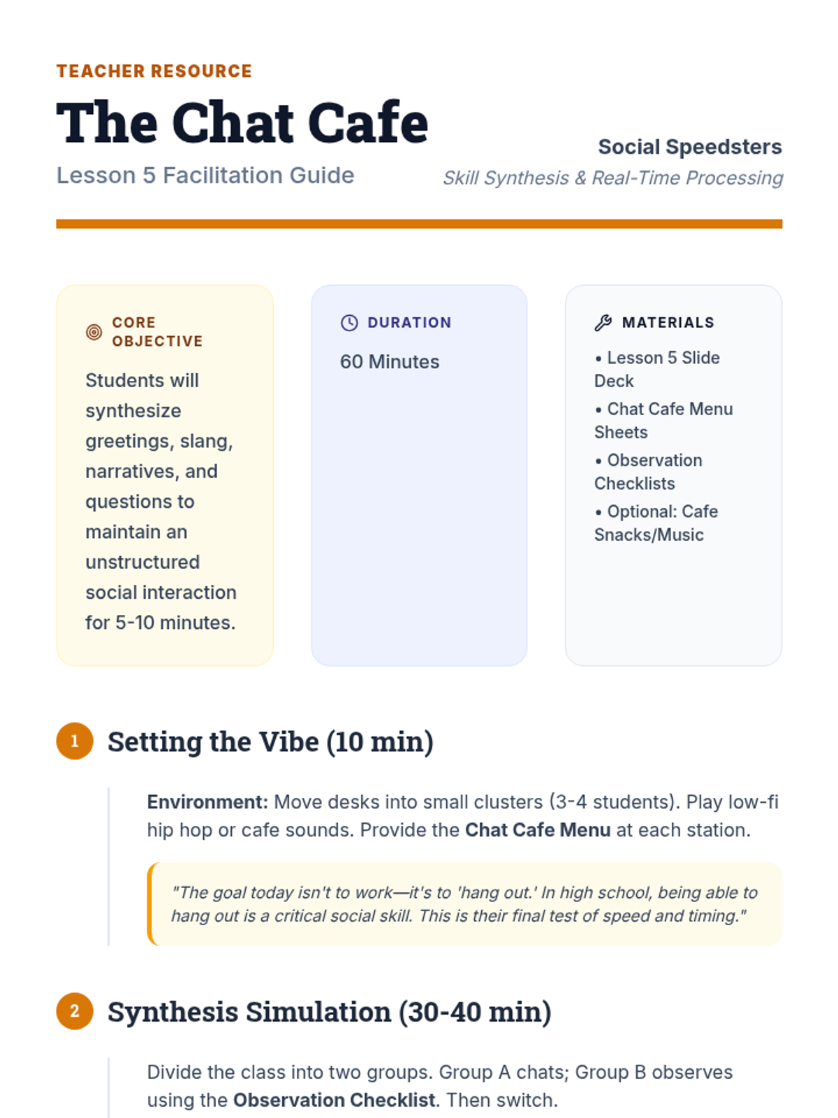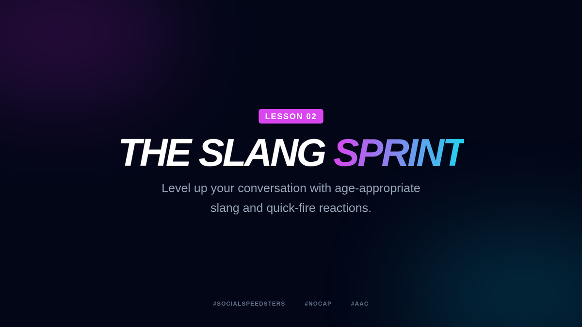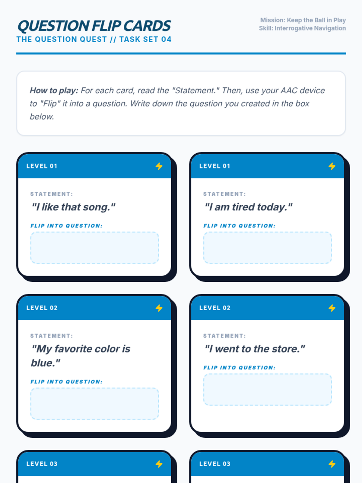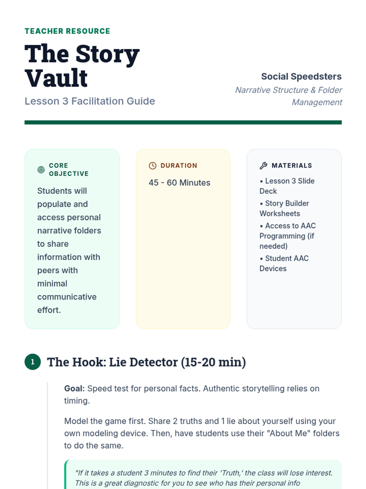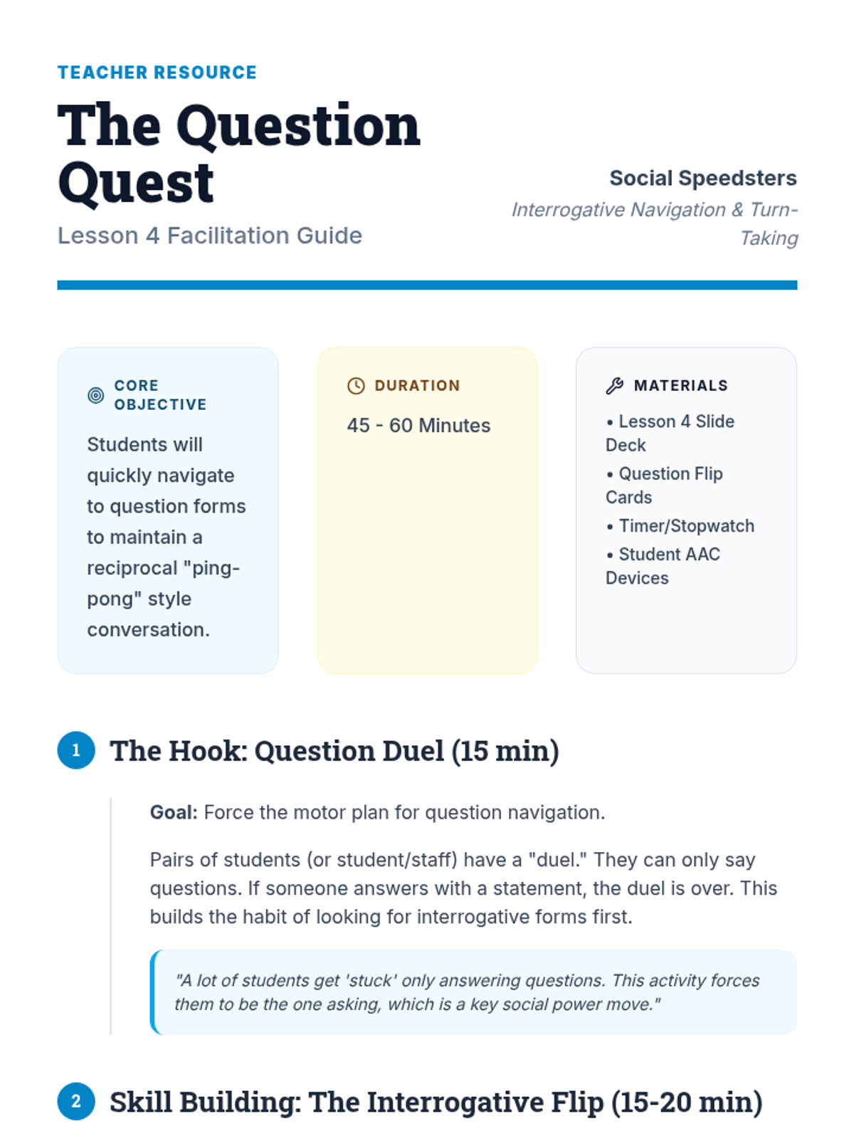 A comprehensive 9th-grade sequence focused on improving the speed and social relevance of AAC device navigation for high school students. Students practice rapid access to greetings, slang, narratives, and questions to enhance real-time peer interactions.