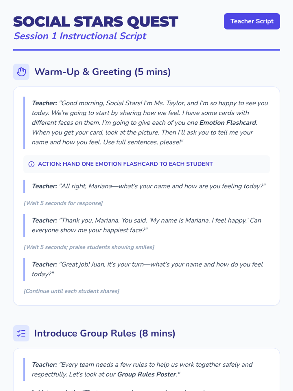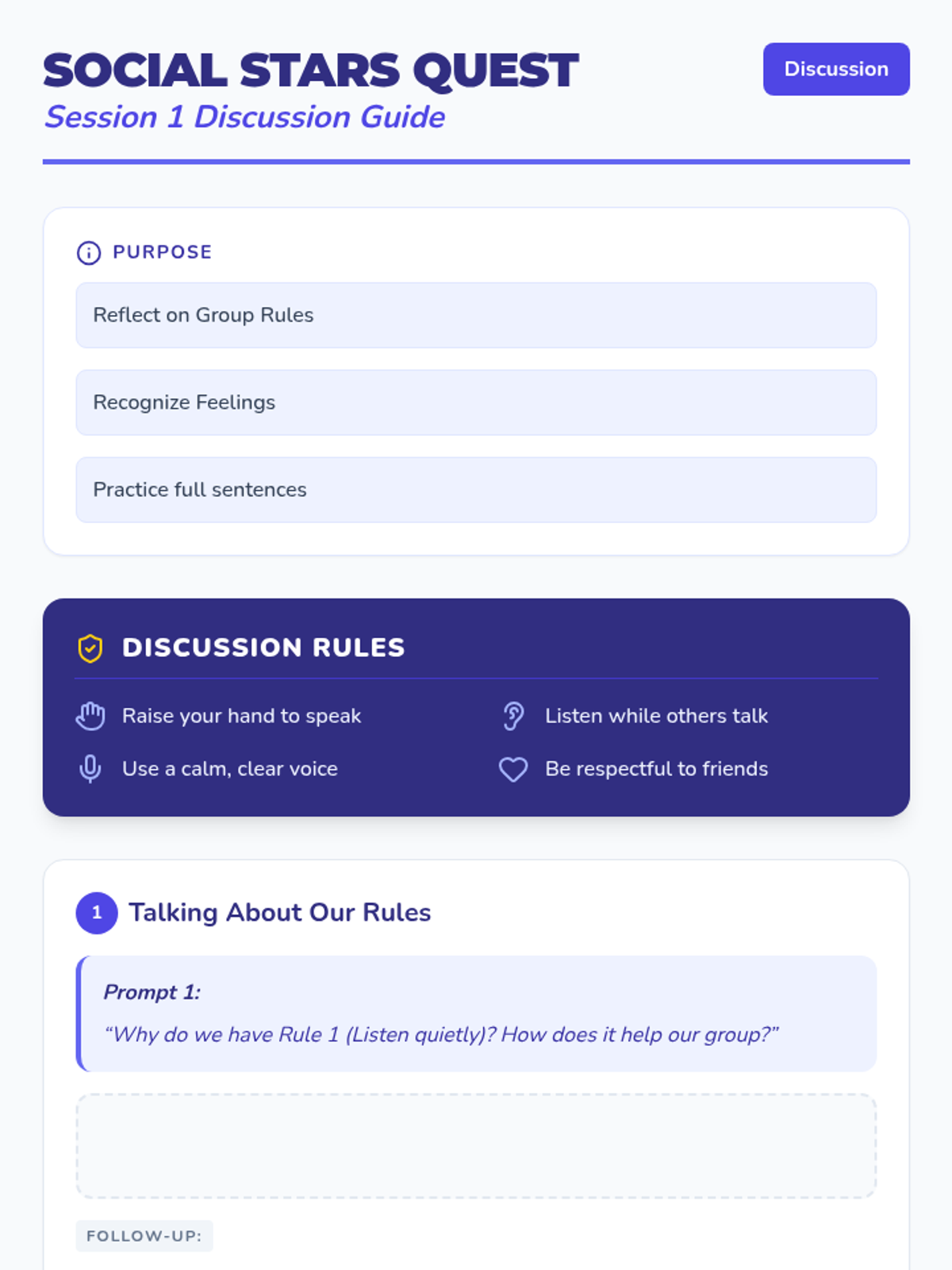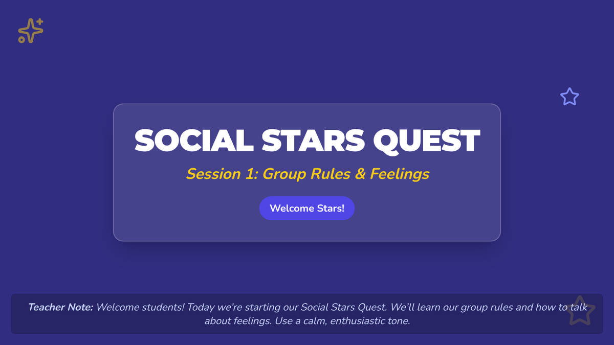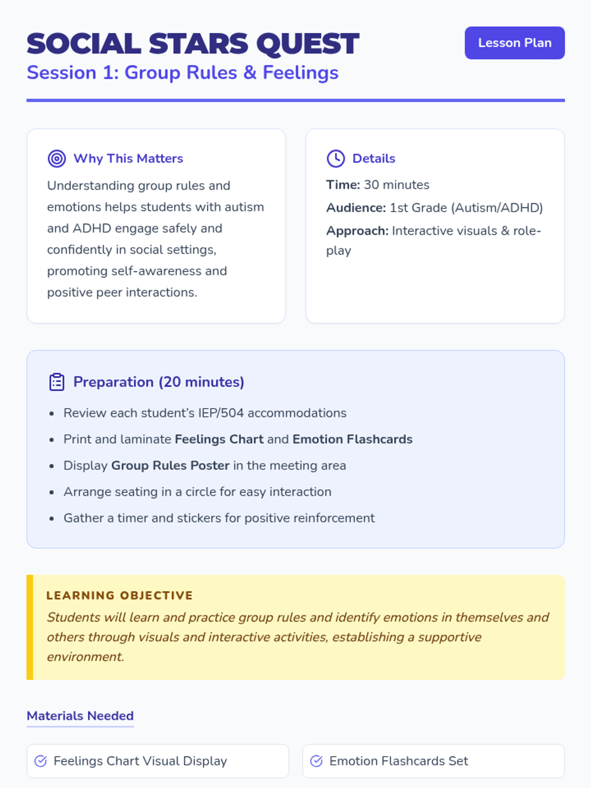 A 10-session social skills curriculum designed for 1st graders with autism and ADHD. The program focuses on group participation, emotional regulation, personal space, safety, and managing non-preferred tasks through interactive play, visual supports, and structured routines.