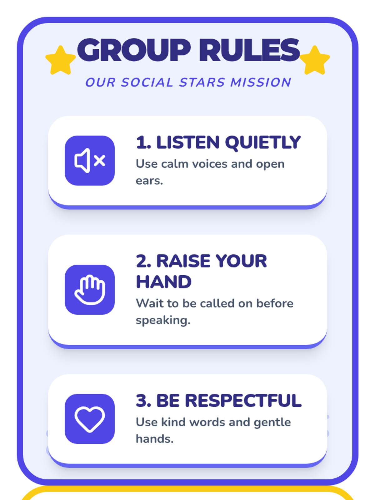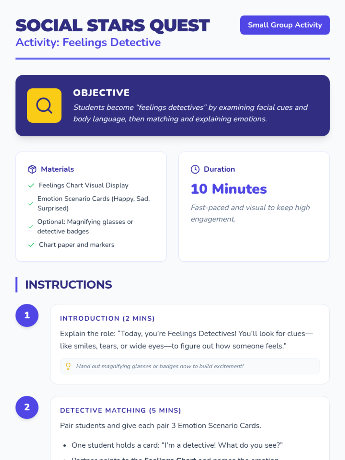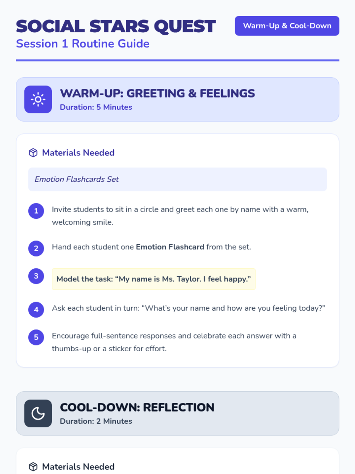 A 10-session social skills curriculum designed for 1st graders with autism and ADHD. The program focuses on group participation, emotional regulation, personal space, safety, and managing non-preferred tasks through interactive play, visual supports, and structured routines.