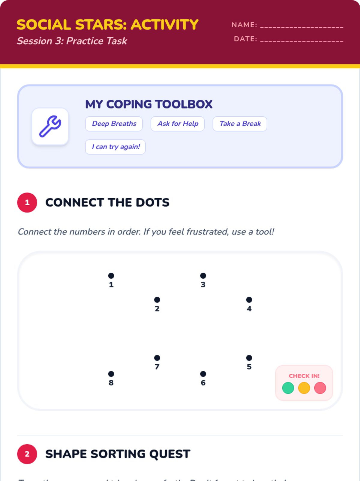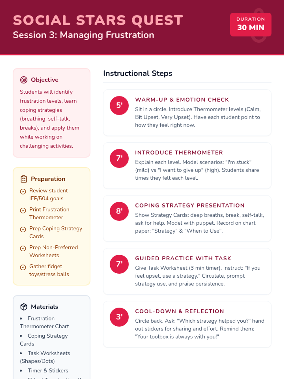 A 10-session social skills curriculum for 1st graders with autism and ADHD, focusing on social behaviors, safety, boundaries, and managing frustration using a Star Quest theme.