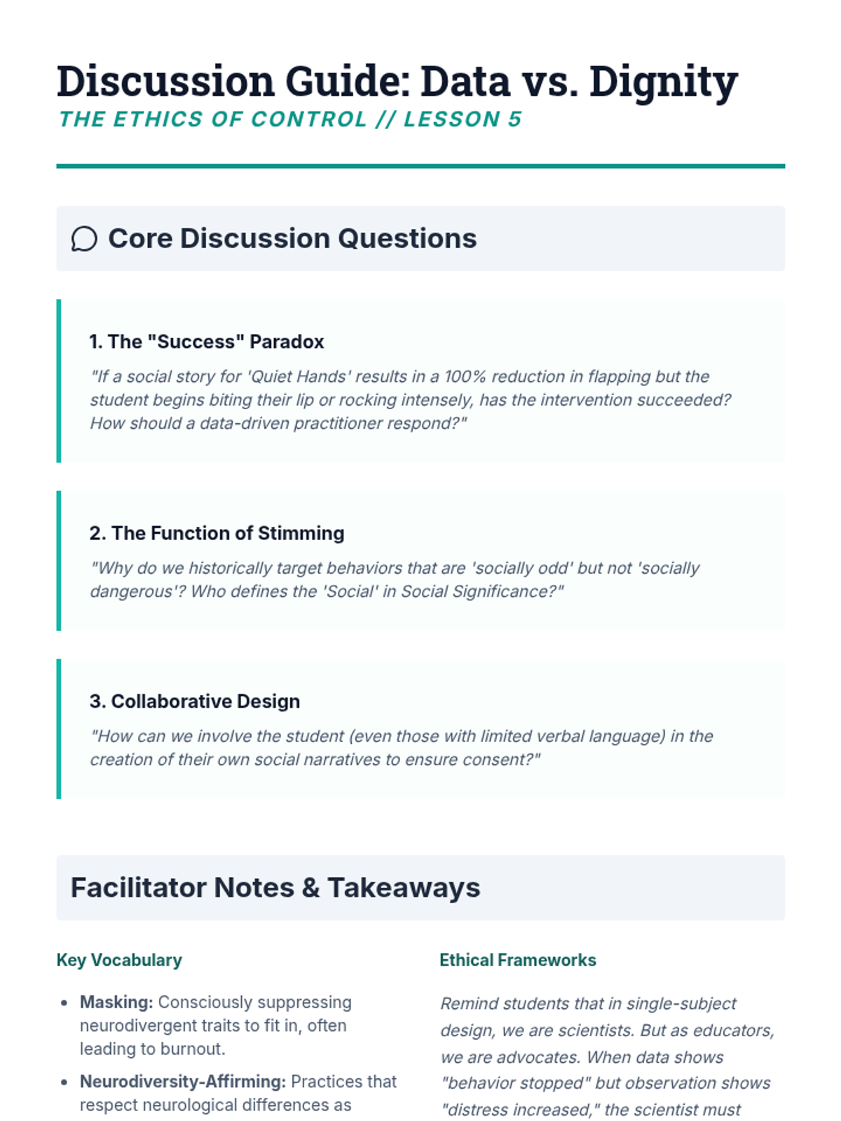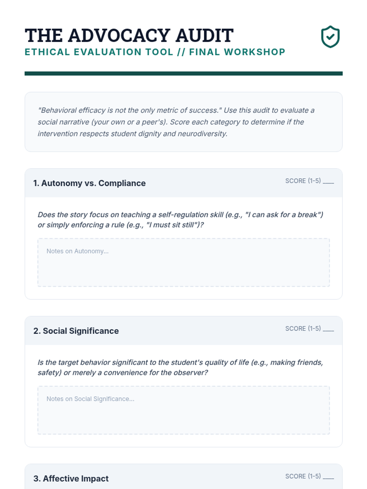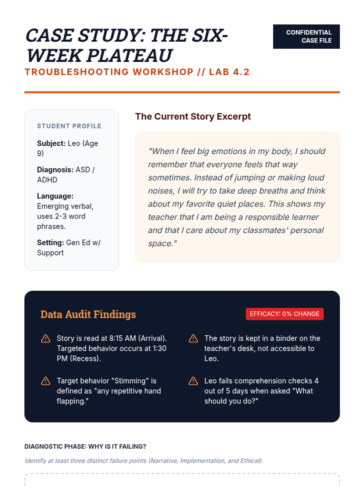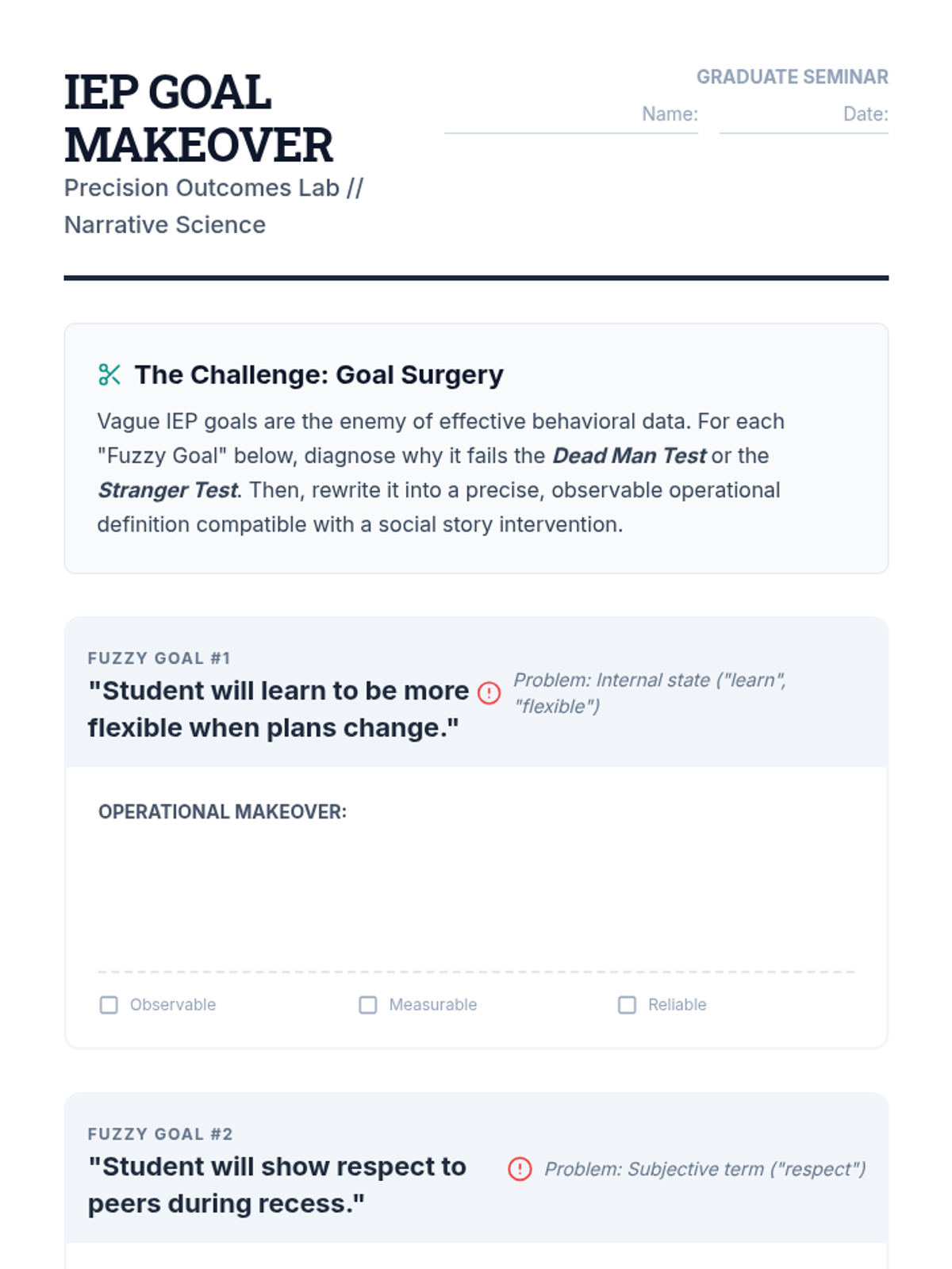 A graduate-level sequence focused on the empirical evaluation and iterative refinement of social narratives within a Positive Behavior Support framework. Students learn to operationalize behavioral goals, design robust data collection systems, and analyze trend data to ensure intervention efficacy and ethical compliance.
