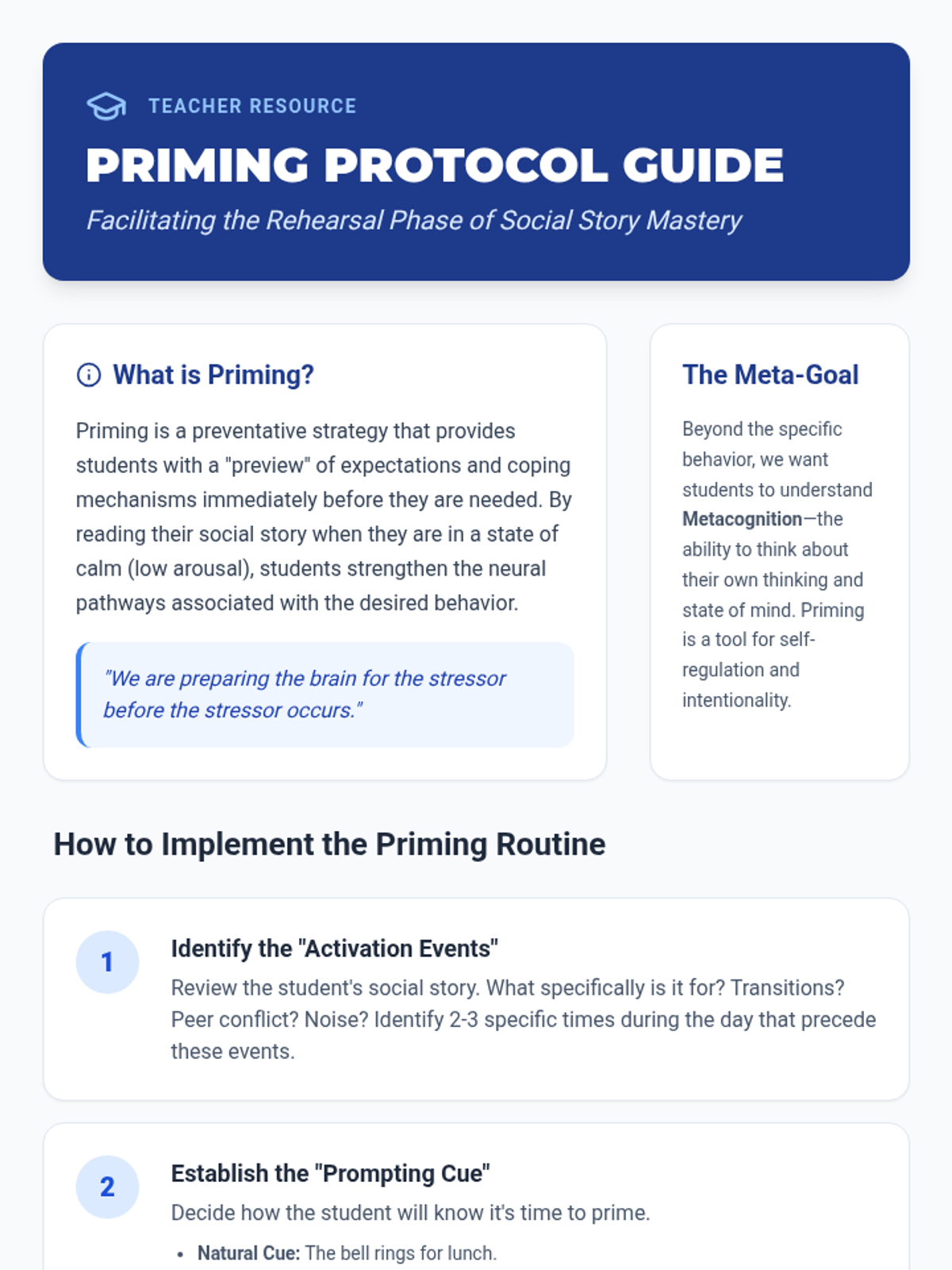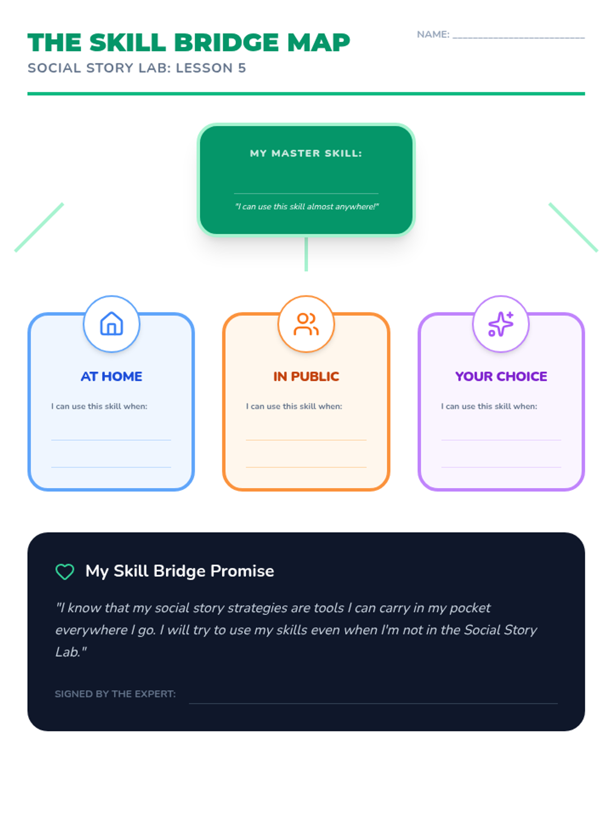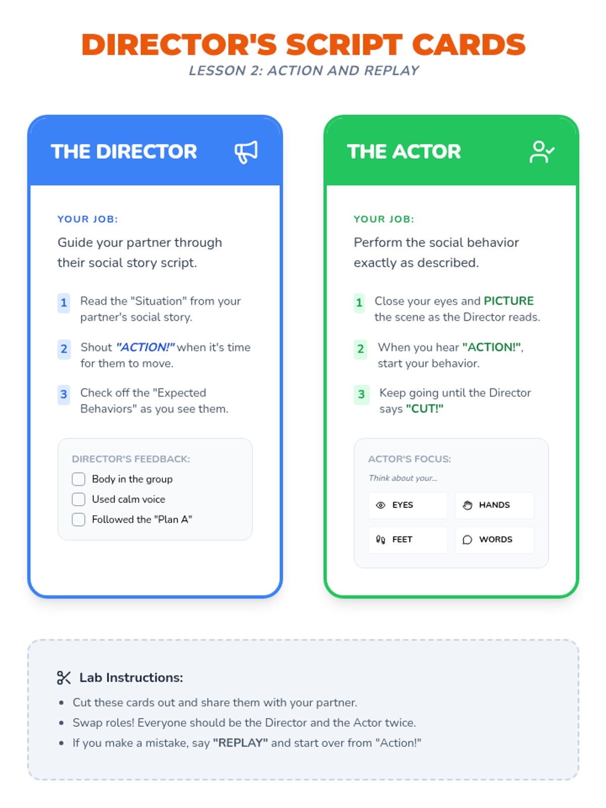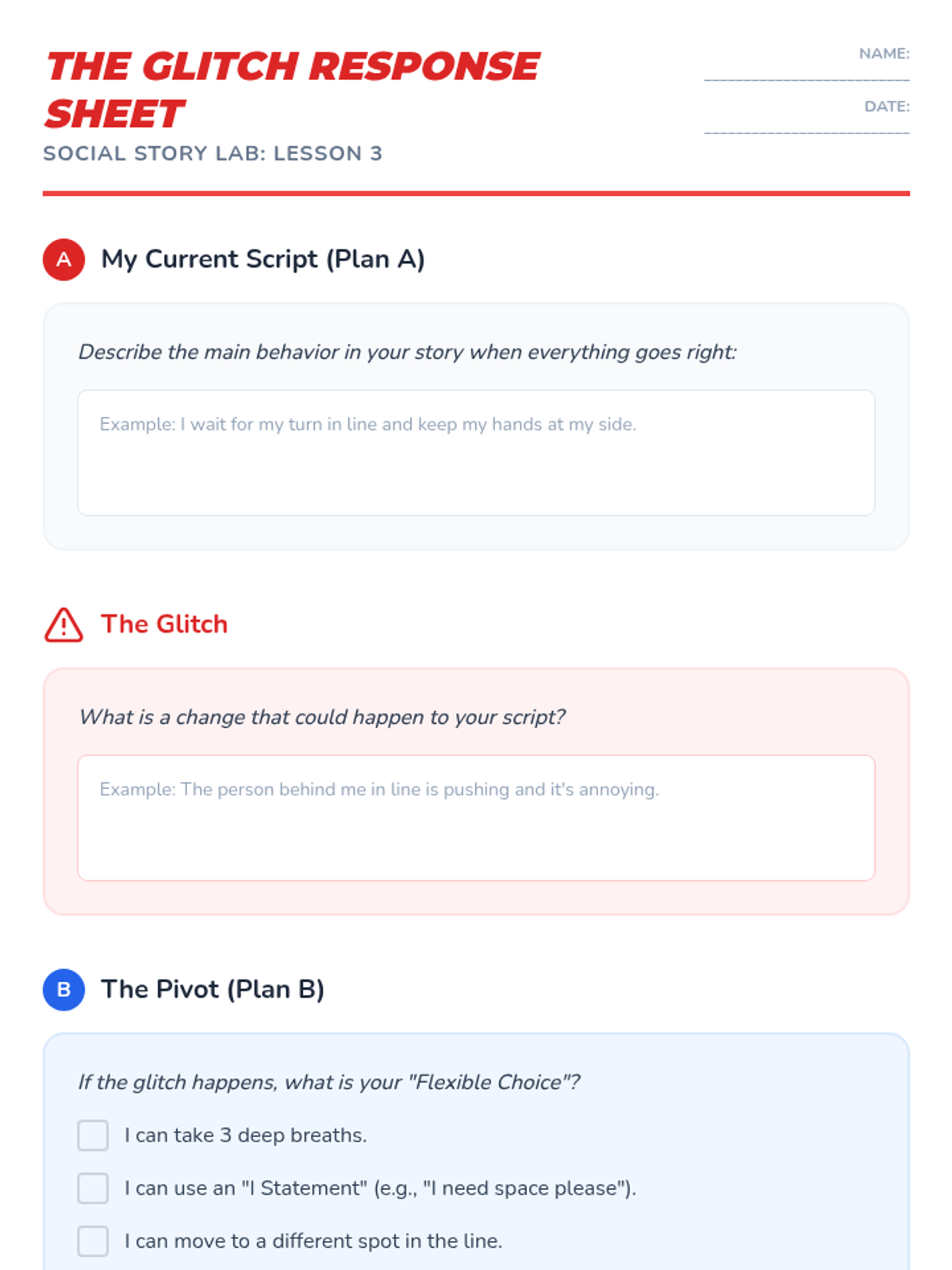 A 5-lesson sequence for 4th-grade students to practice, test, and apply their personal social stories through simulation and role-play. Students move from simple rehearsal to troubleshooting unexpected changes and generalizing their skills to new environments.