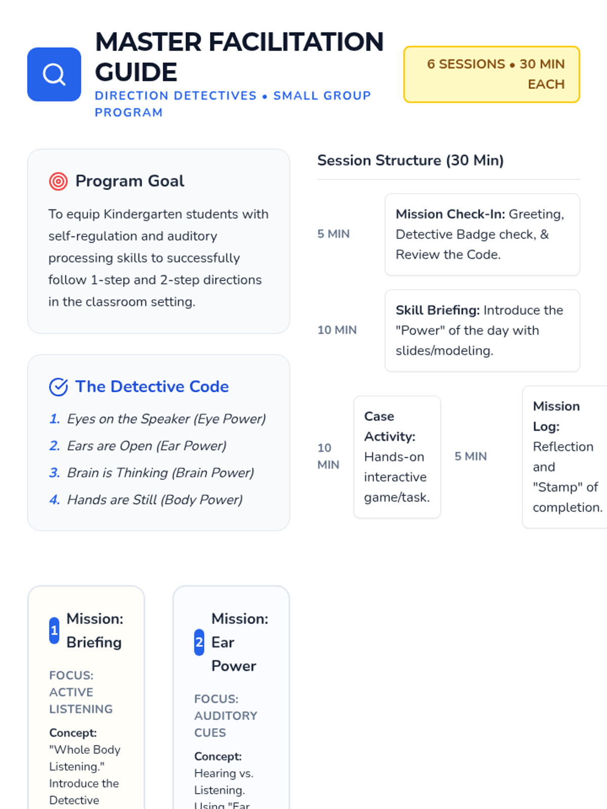 A 6-session small group program designed for Kindergarten students to develop listening skills and the ability to follow multi-step directions through engaging detective-themed missions.