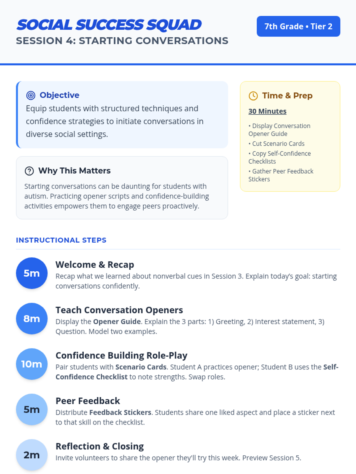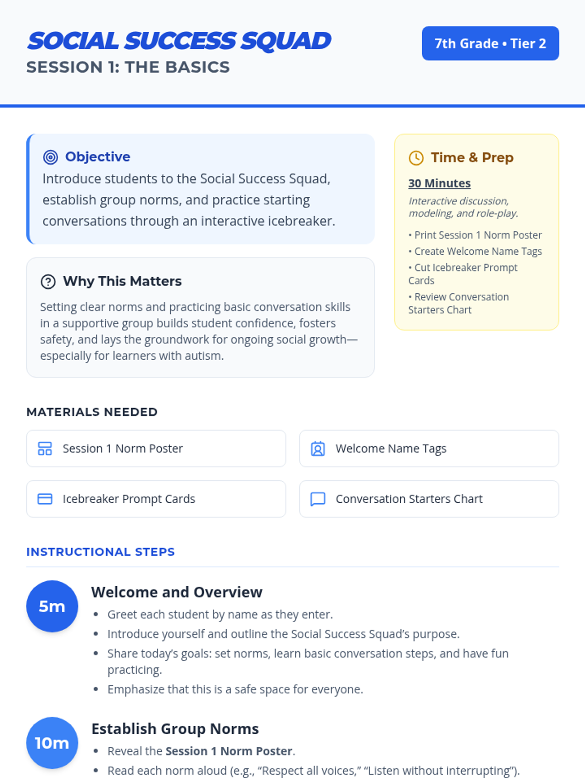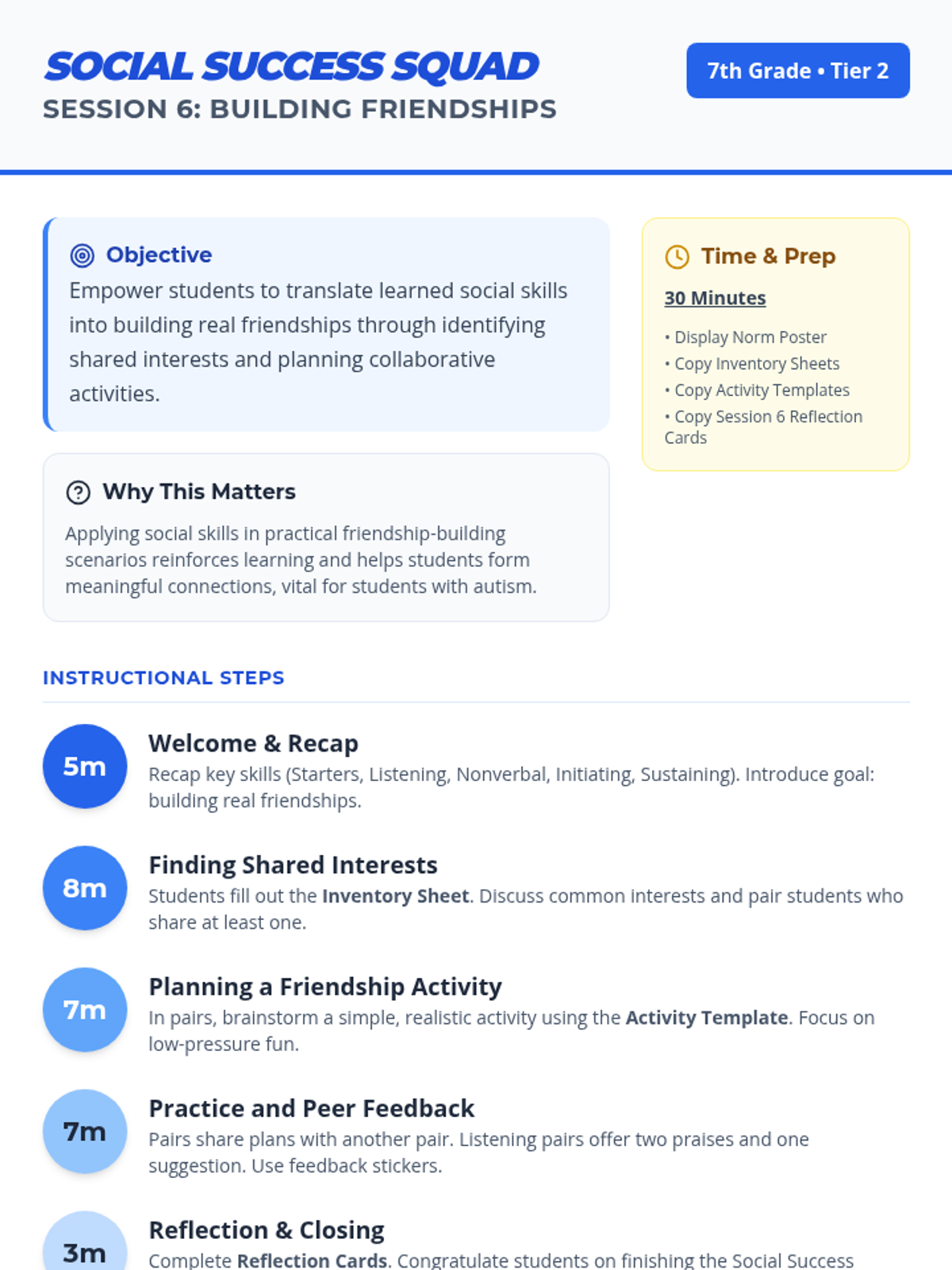 A 6-session Tier 2 social skills curriculum for 7th graders designed to build confidence, communication, and friendship-building skills, particularly for students on the autism spectrum.