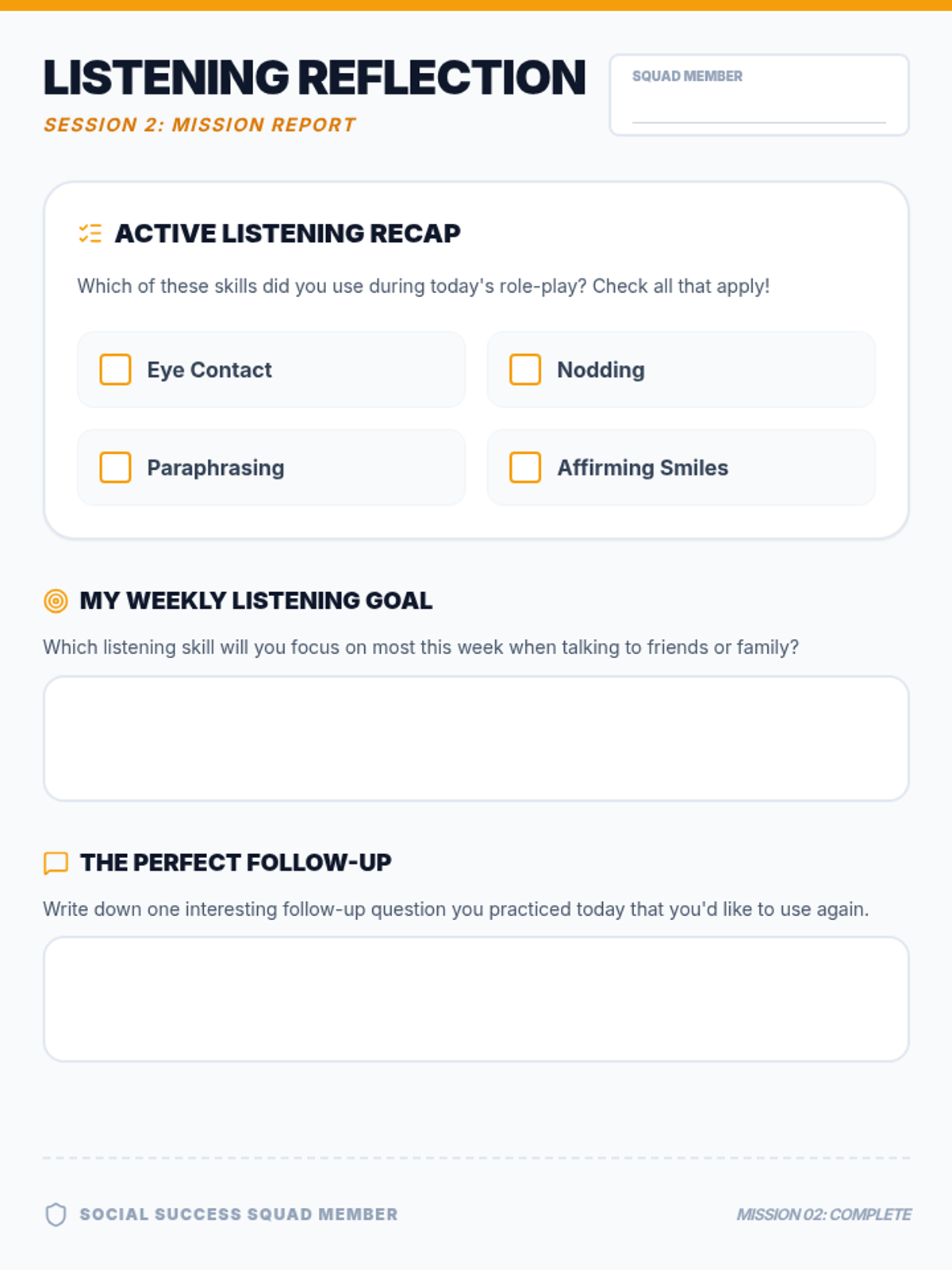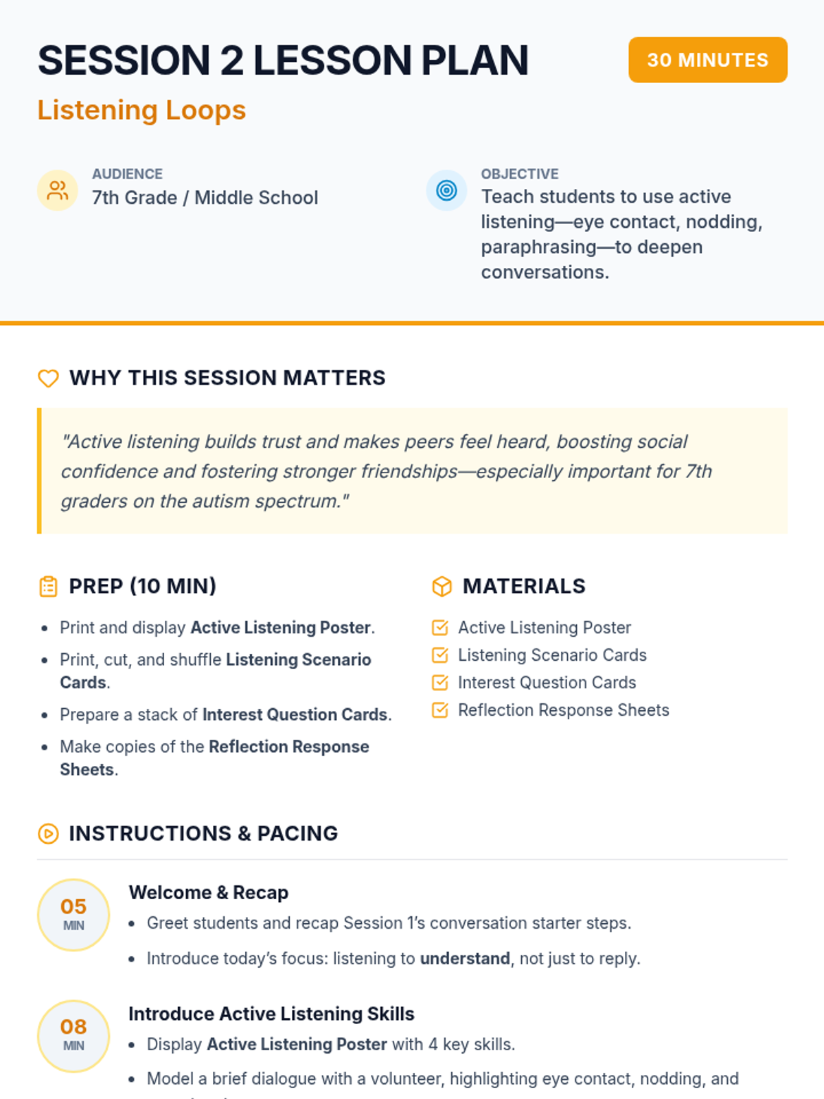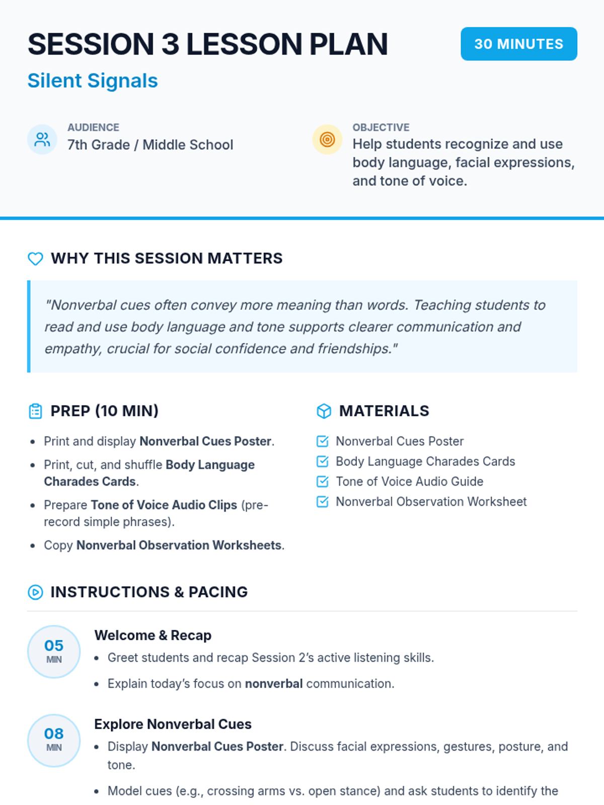 A 6-session social skills program for 7th-grade students, focusing on confidence, communication, and friendship-building through structured instruction and practice.