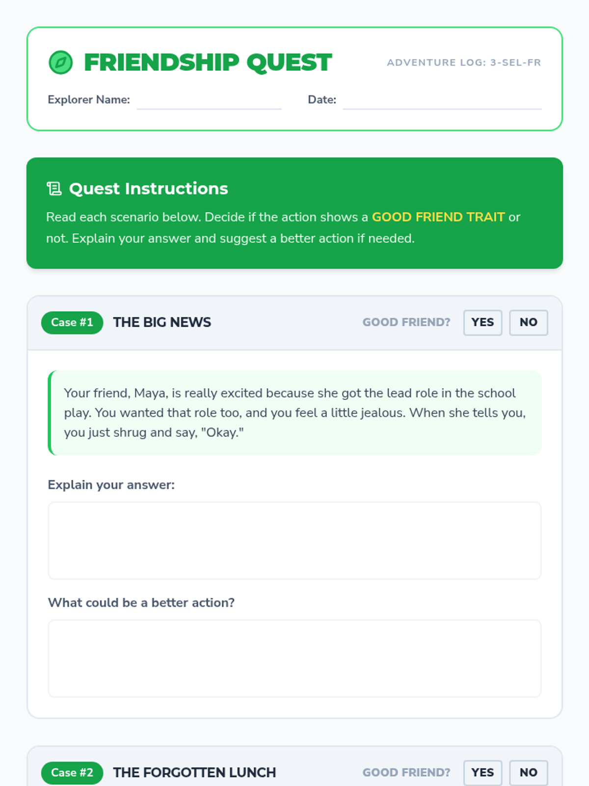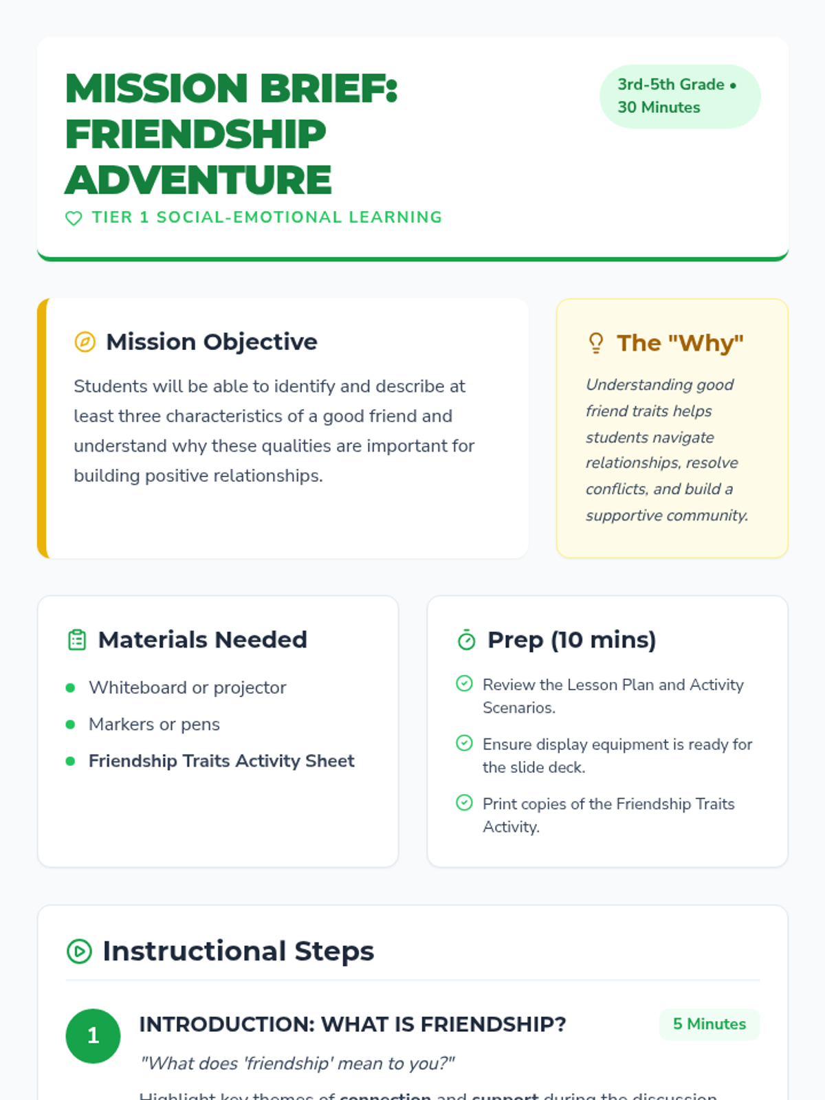 A sequence of two social-emotional learning lessons for 3rd graders focused on practical problem-solving strategies and the traits of healthy friendships. Students build empathy, resilience, and communication skills through scenario analysis and interactive discussions.
