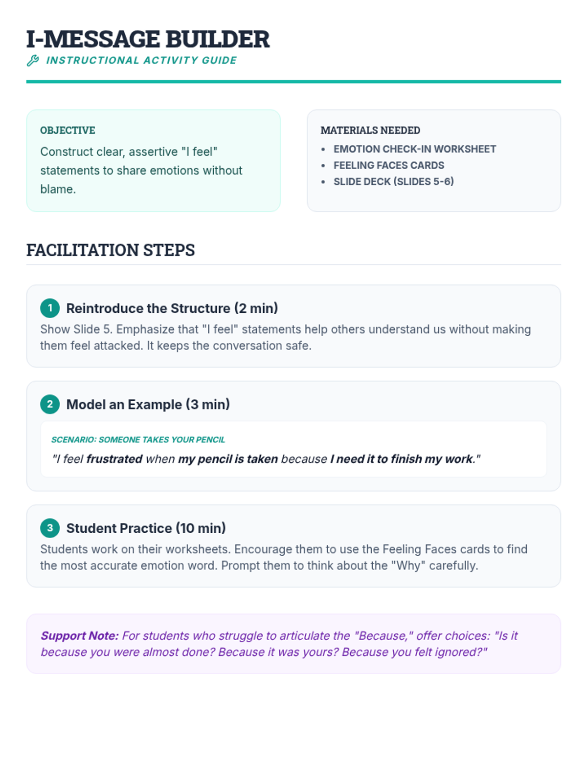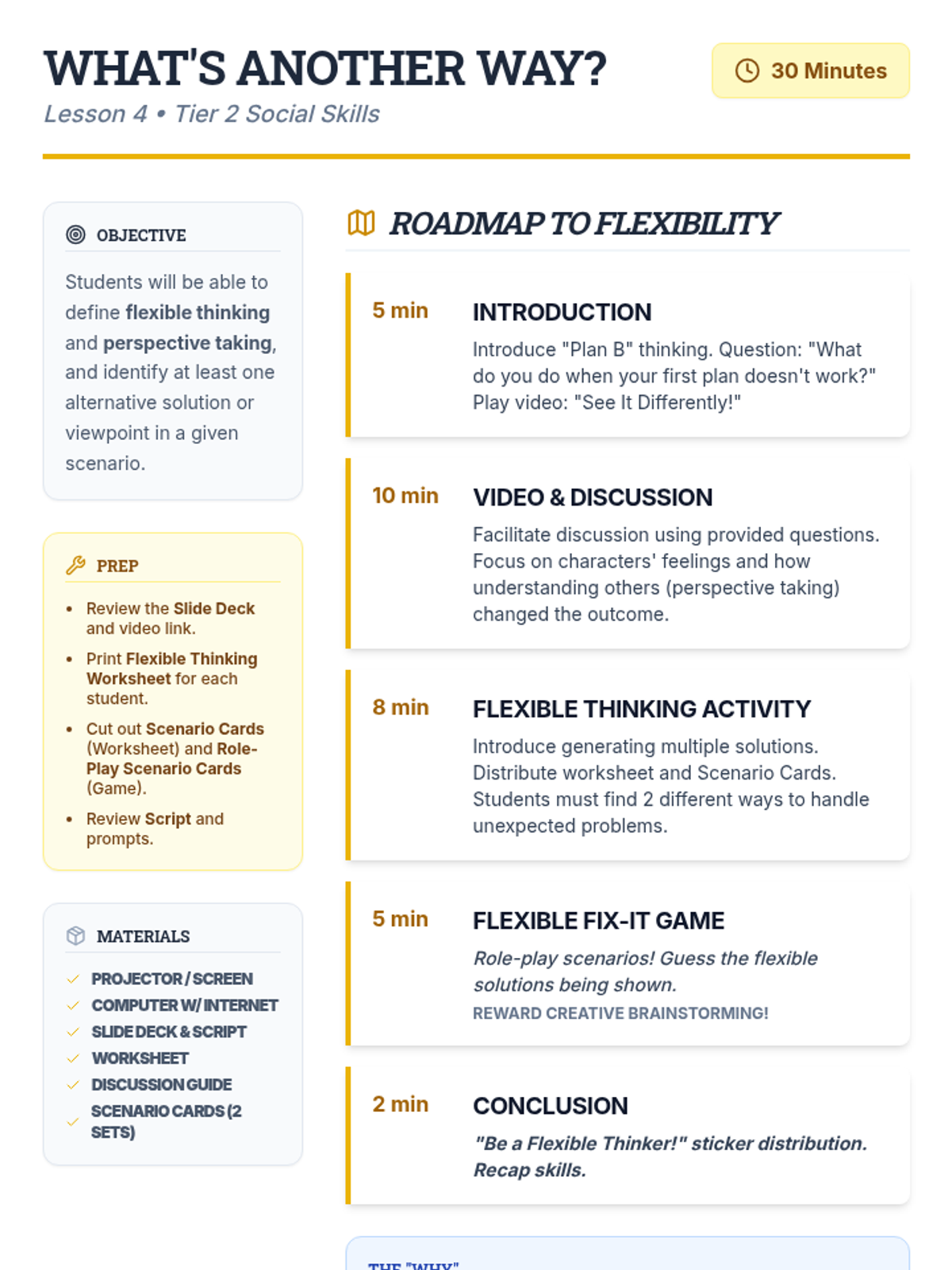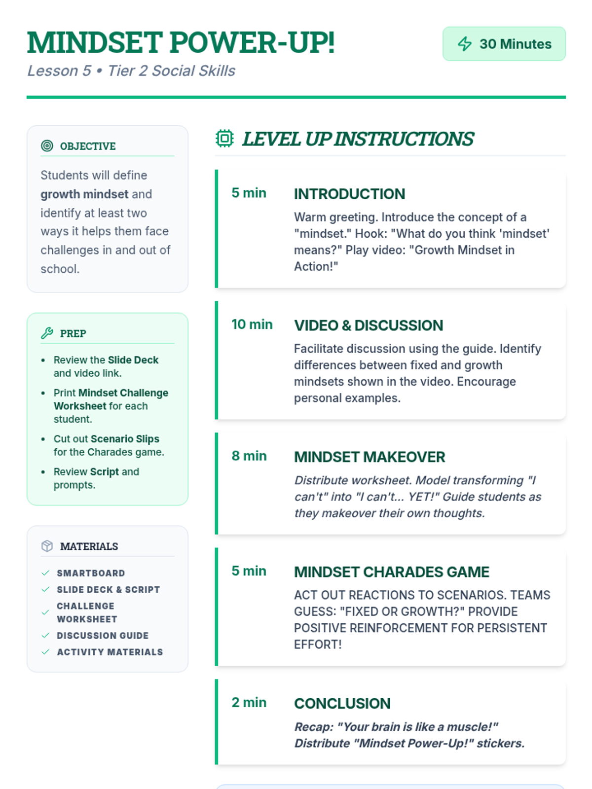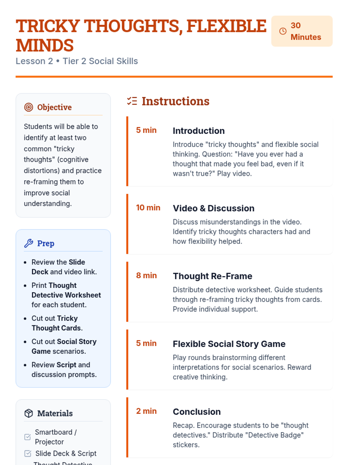 A 5-session social-emotional learning sequence designed for middle school students in Tier 2 groups. This unit covers conflict resolution, cognitive flexibility, emotional regulation, perspective taking, and growth mindset through interactive games, role-plays, and structured discussions.