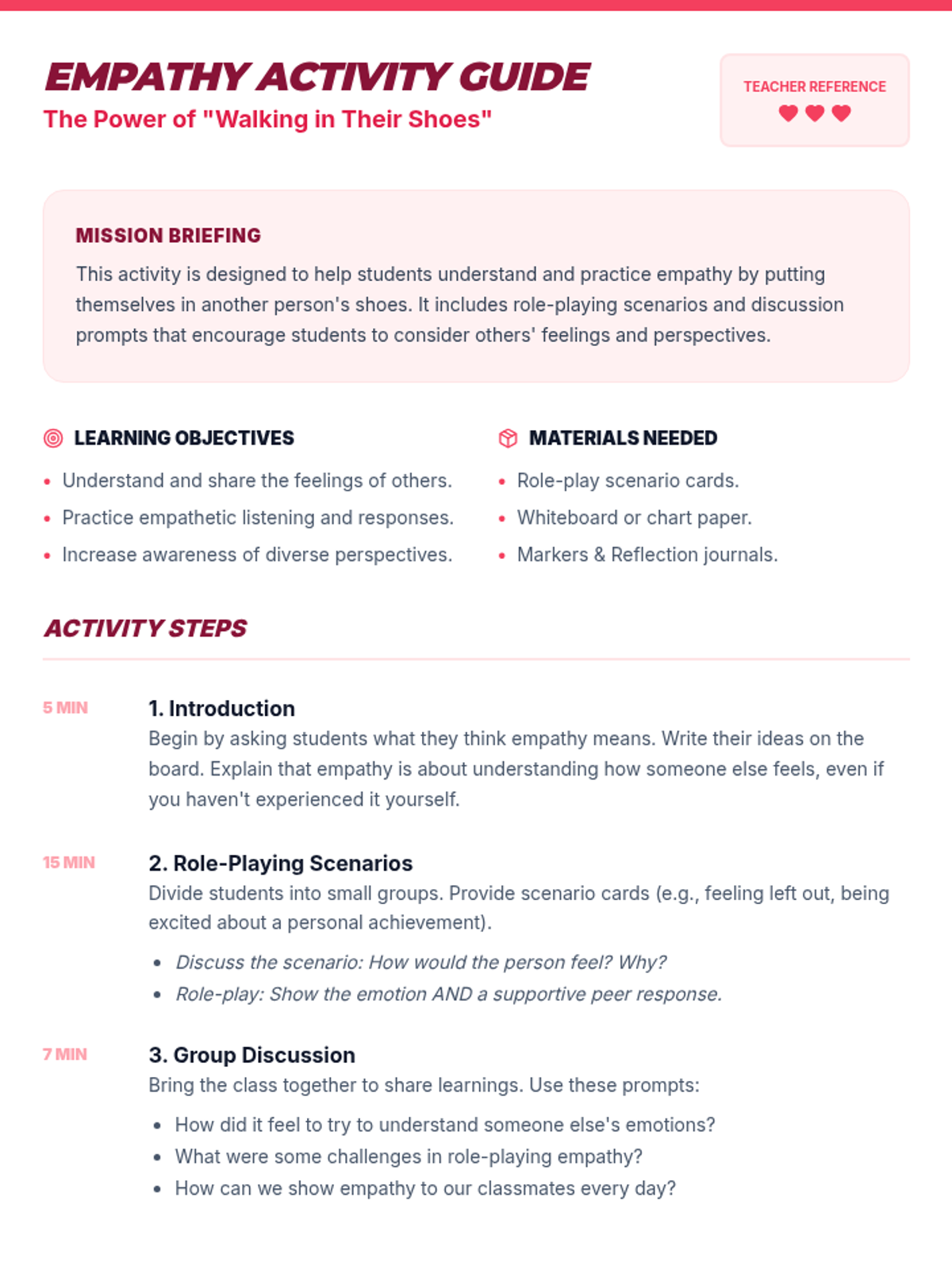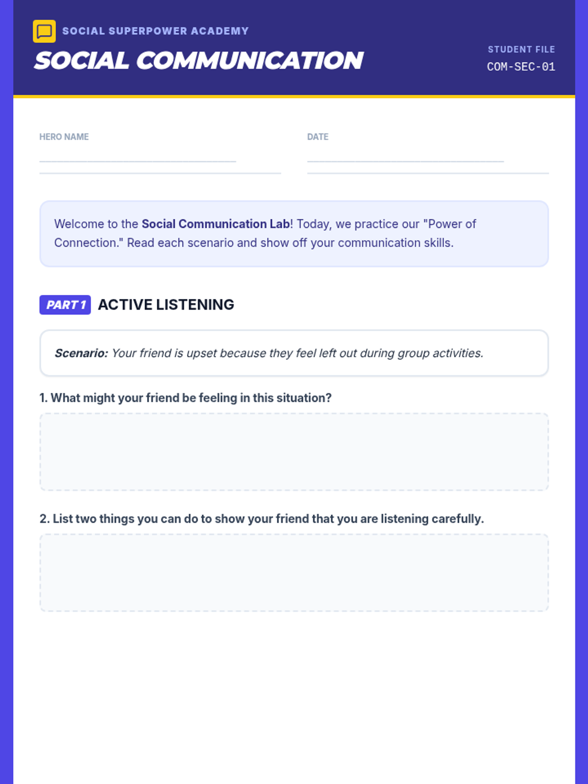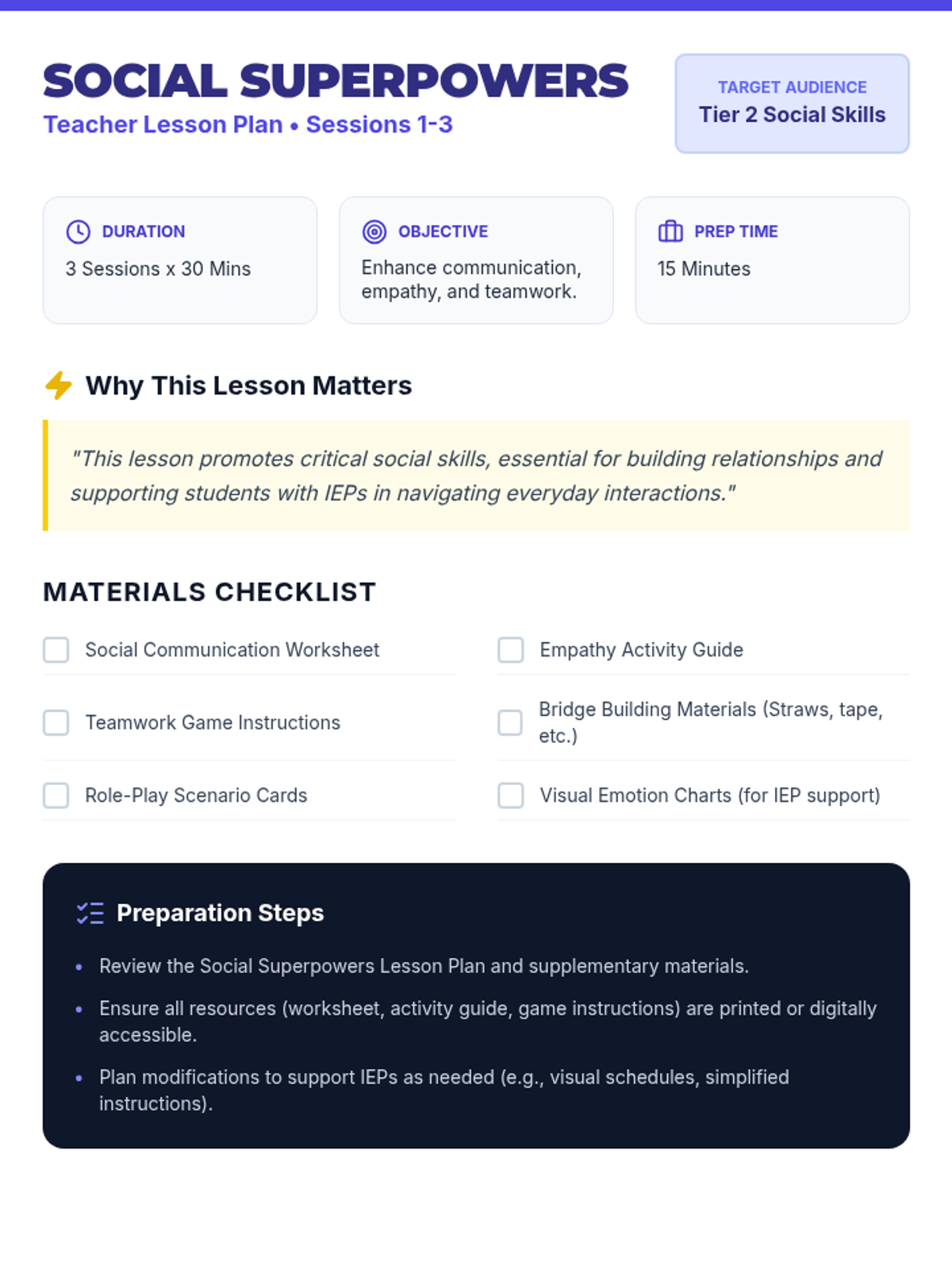 A 3-session social skills intervention sequence focusing on communication, empathy, and teamwork, designed for Tier 2 support and students with IEPs.