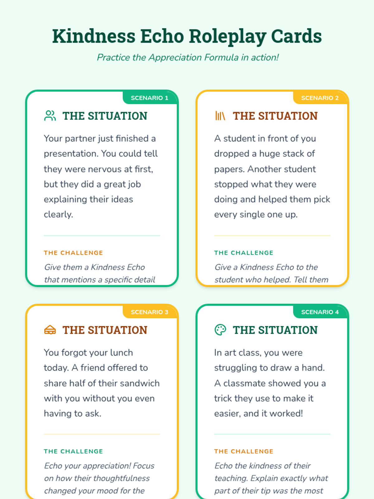 A collection of quick, under-5-minute math-themed brain breaks designed to help students practice coping skills like deep breathing, mindfulness, positive self-talk, and stretching. Each activity integrates mathematical concepts like counting, shapes, and logic to maintain a classroom focus while providing emotional regulation.