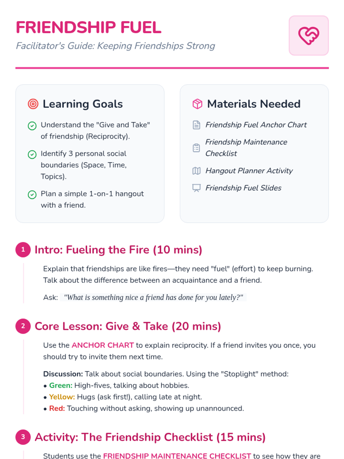 A sequence of lessons designed for young adults with cognitive disabilities to navigate social boundaries and consent. It transitions from foundational personal boundaries to complex professional and community-based interactions.