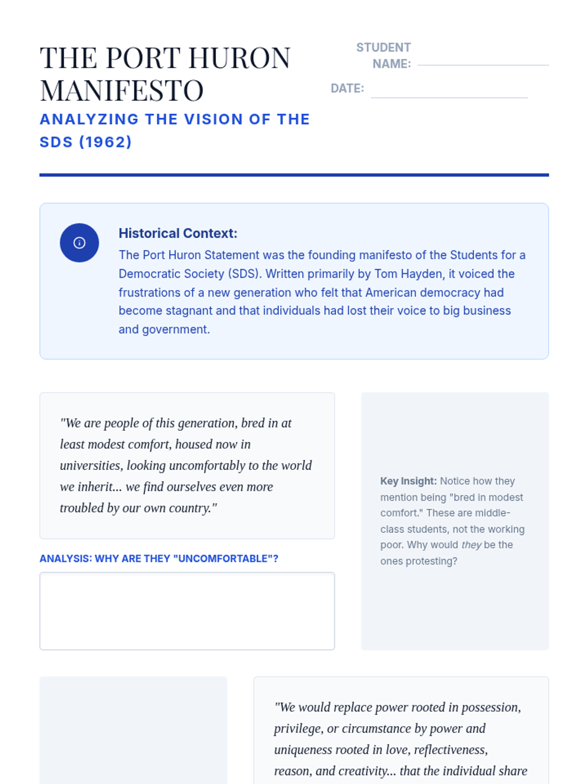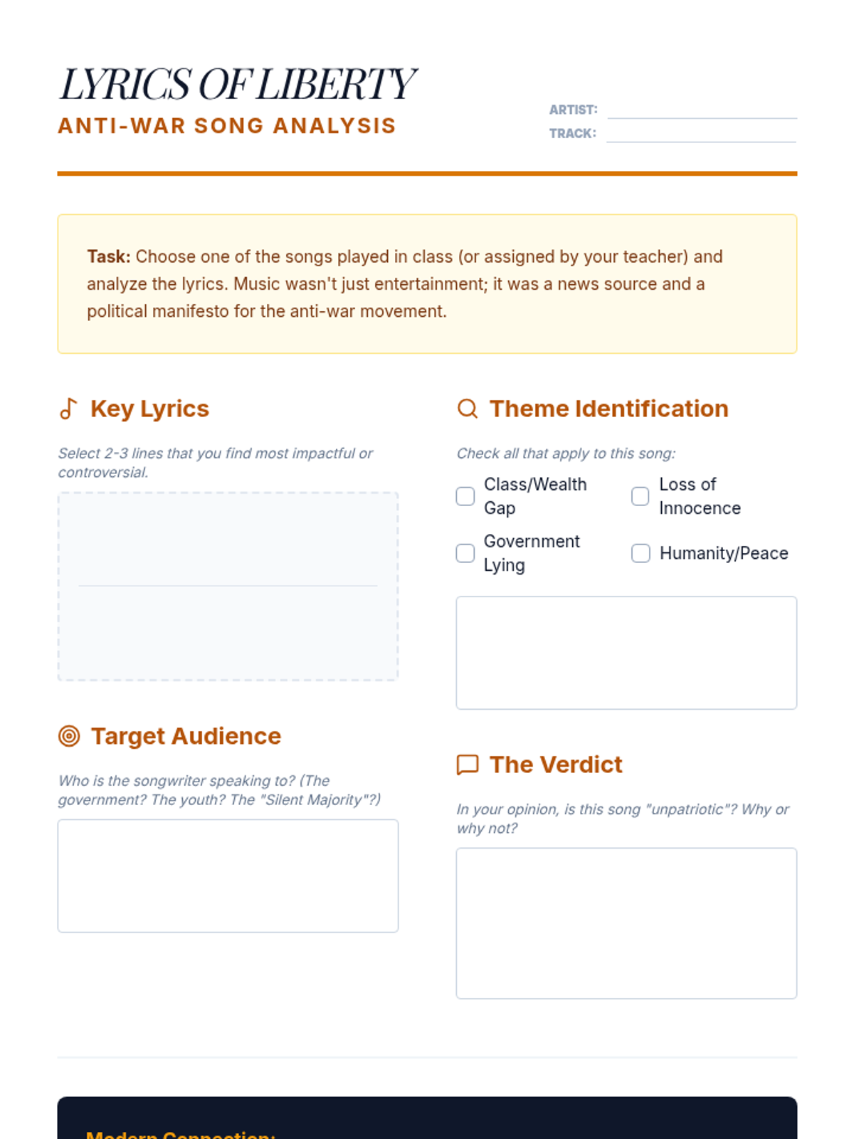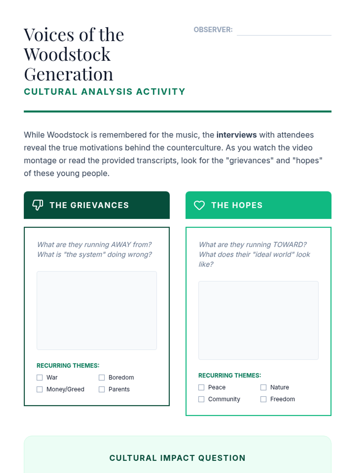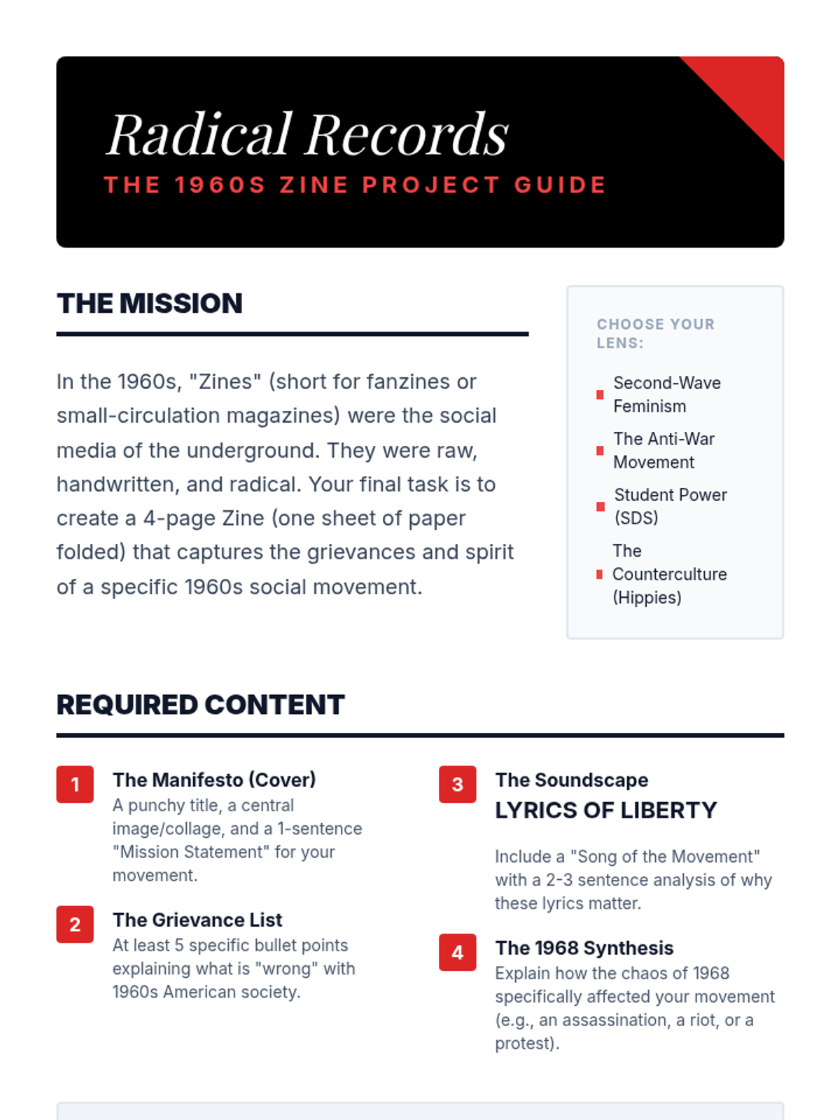 This project-based sequence explores the seismic cultural shifts of the late 1960s, focusing on the emergence of the counterculture, second-wave feminism, student activism, and the pivotal events of 1968. Students analyze primary sources, music, and art to understand how these movements challenged traditional American values.
