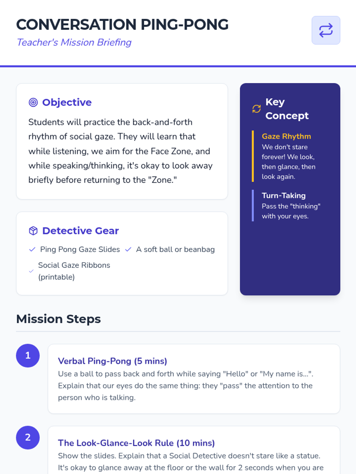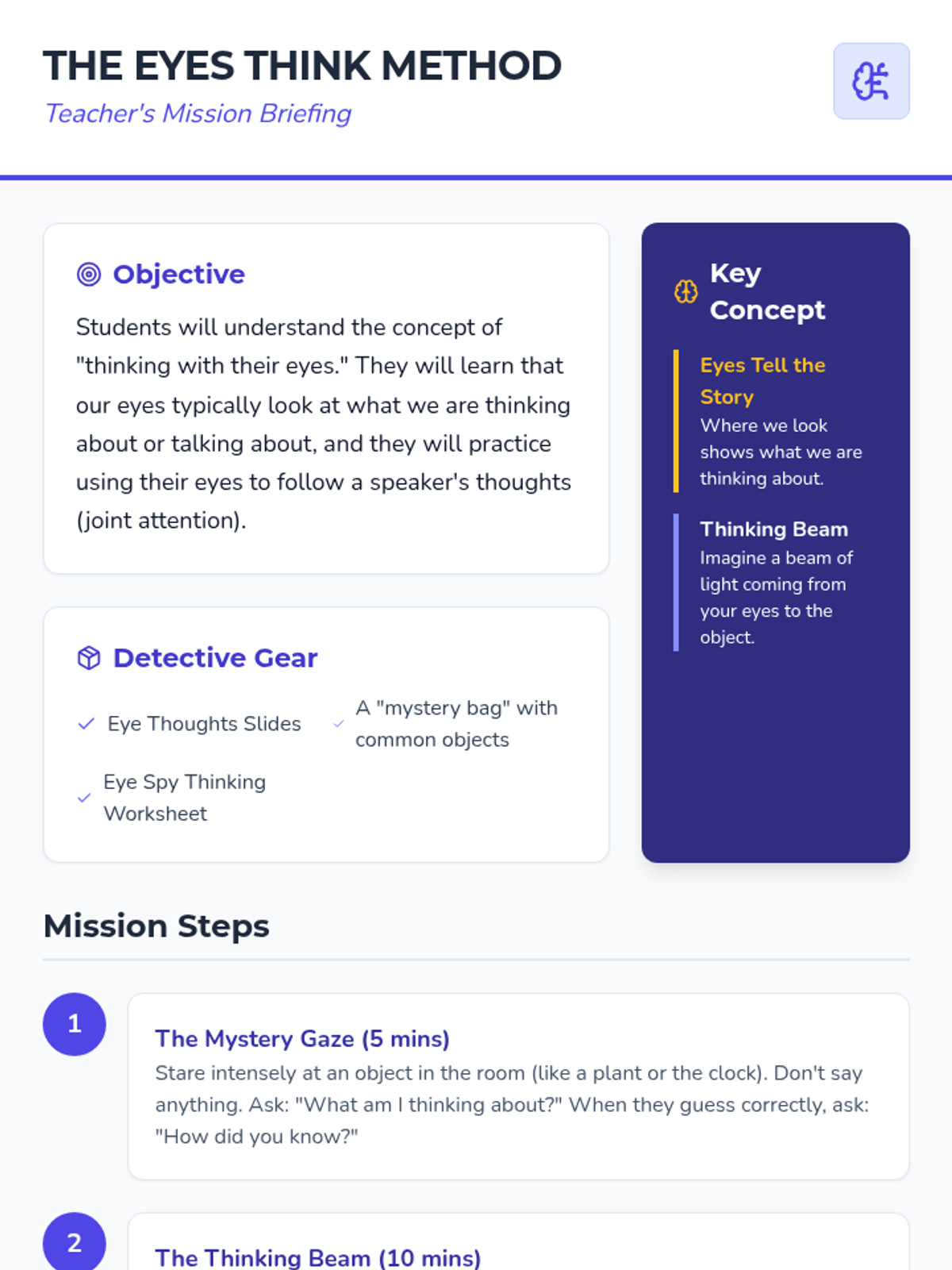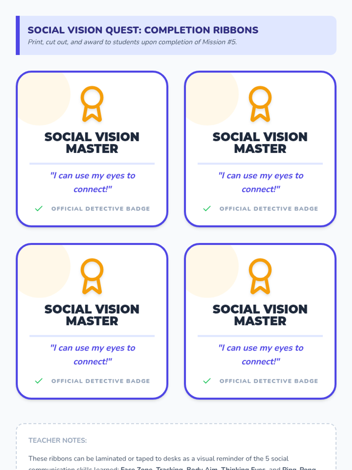 A social communication unit for 1st Grade students focused on developing visual attention, gaze modulation, and personal space through the lens of a 'Social Detective'. Students learn to use their eyes to connect and communicate effectively without the pressure of forced eye contact.