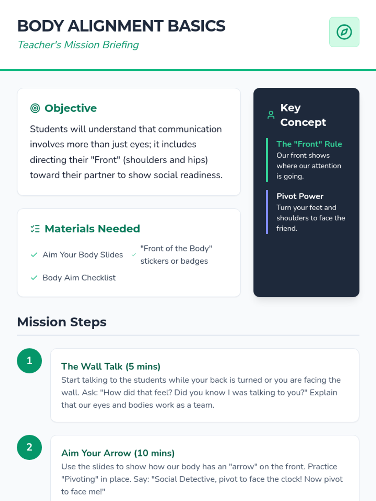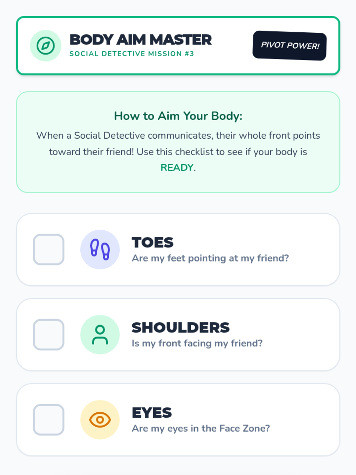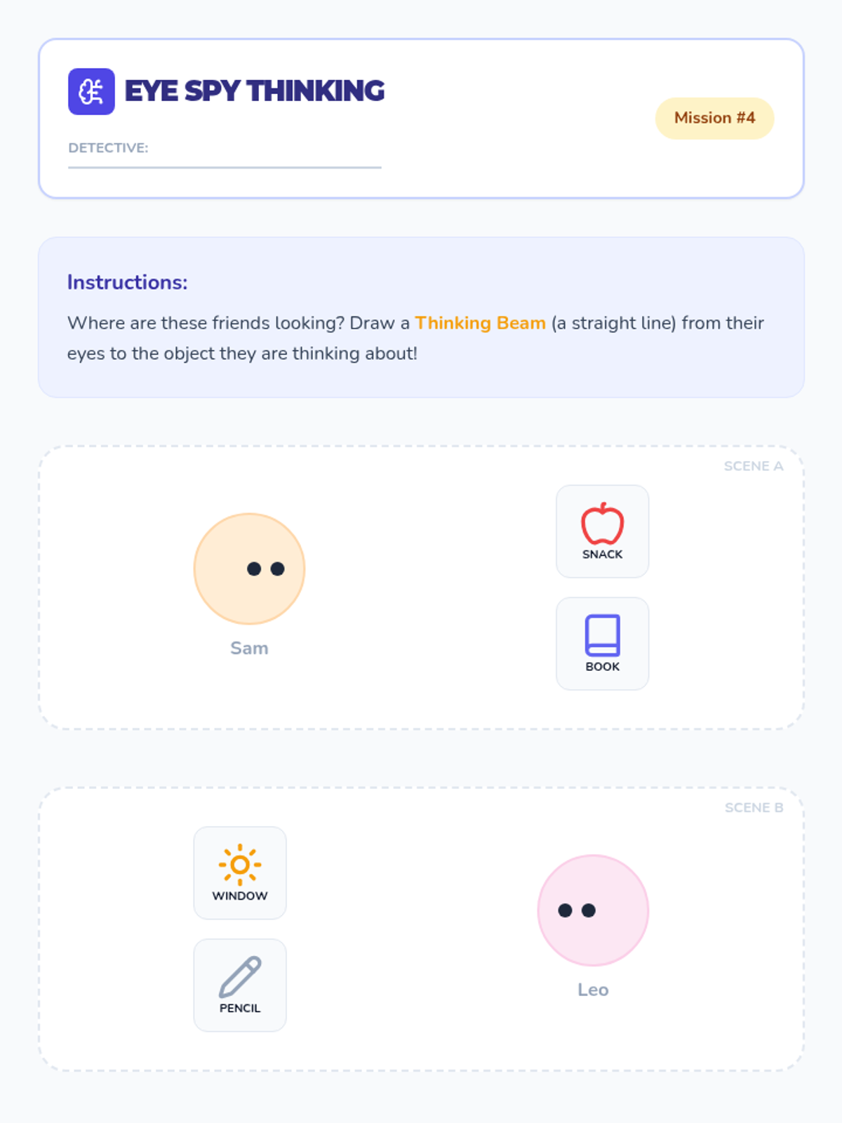 A social communication unit for 1st Grade students focused on developing visual attention, gaze modulation, and personal space through the lens of a 'Social Detective'. Students learn to use their eyes to connect and communicate effectively without the pressure of forced eye contact.