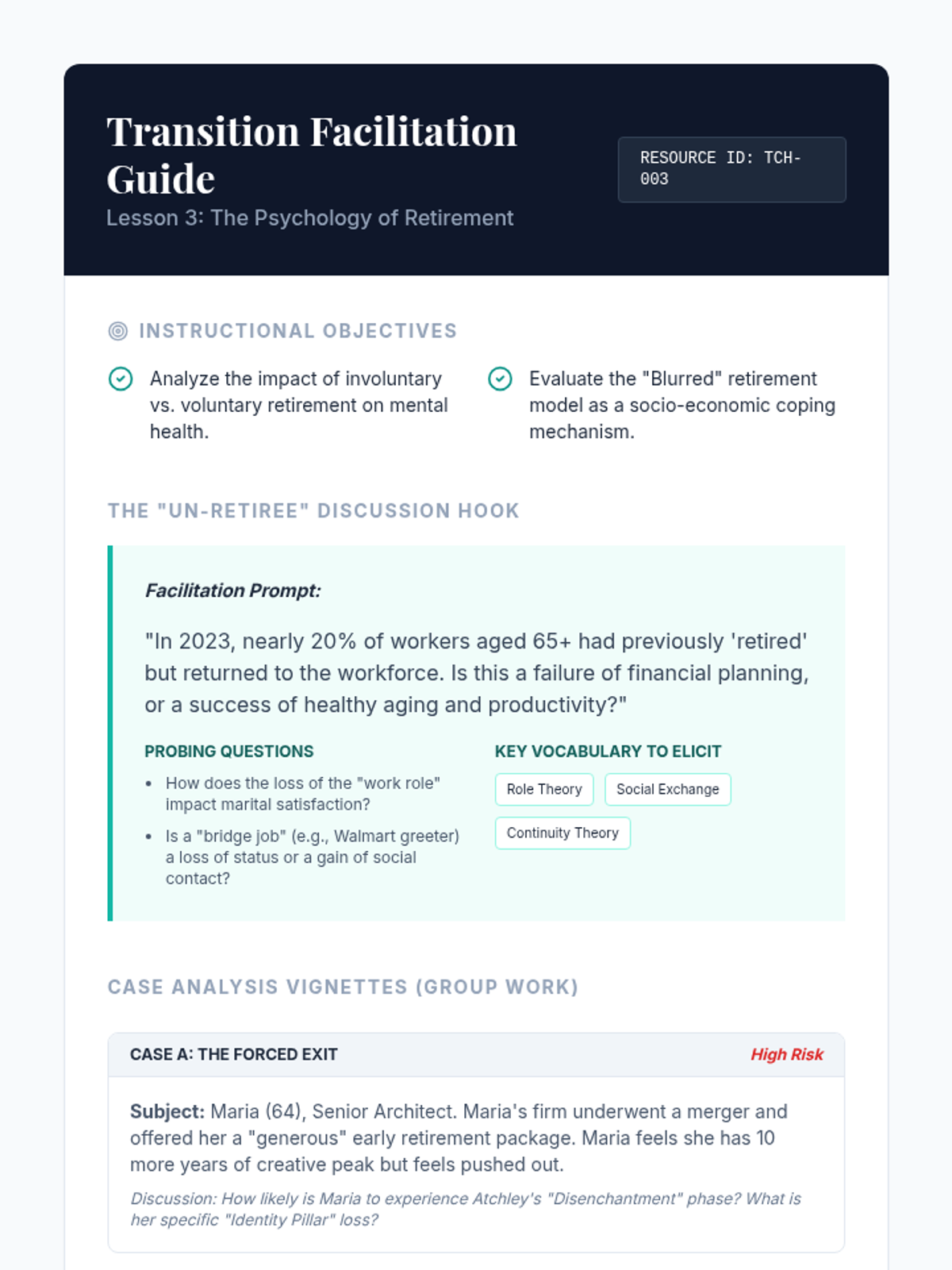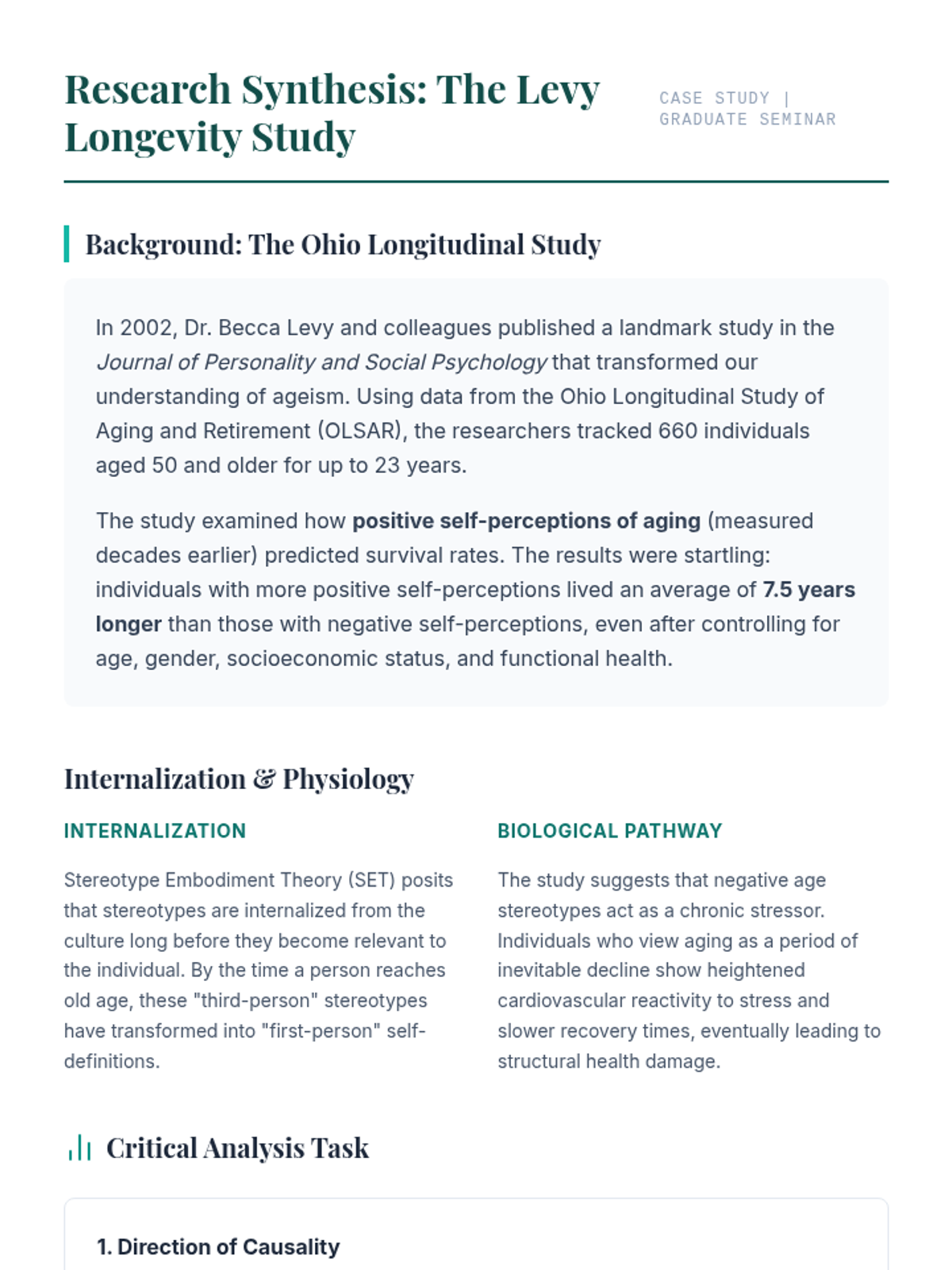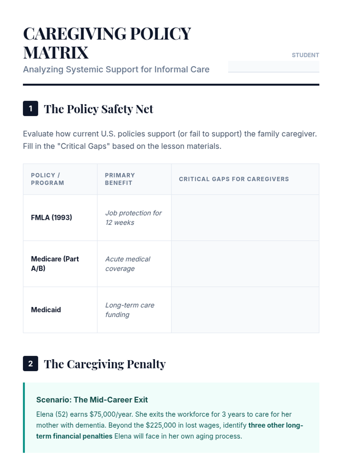 A graduate-level examination of the macro-level systems shaping aging, focusing on demographics, ageism, retirement psychology, environmental fit, and caregiving policy.