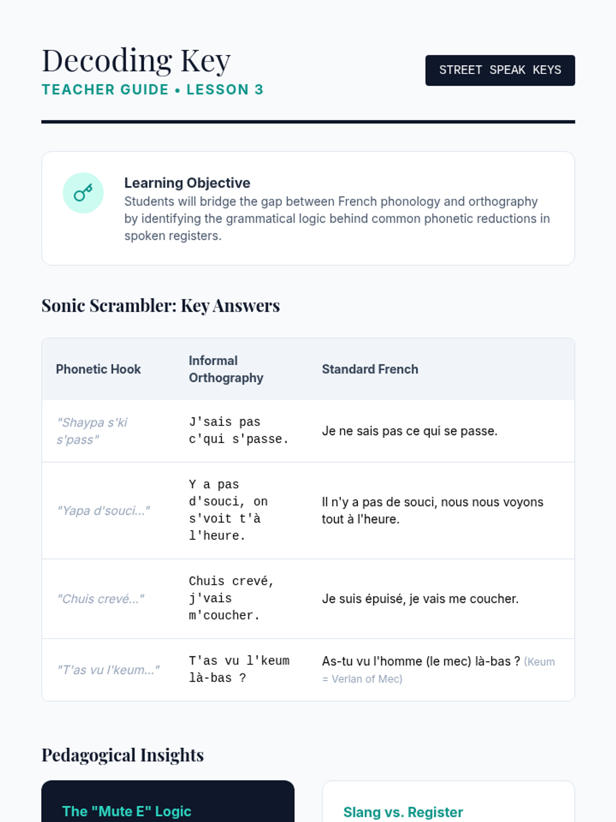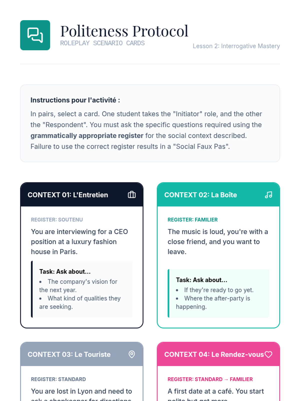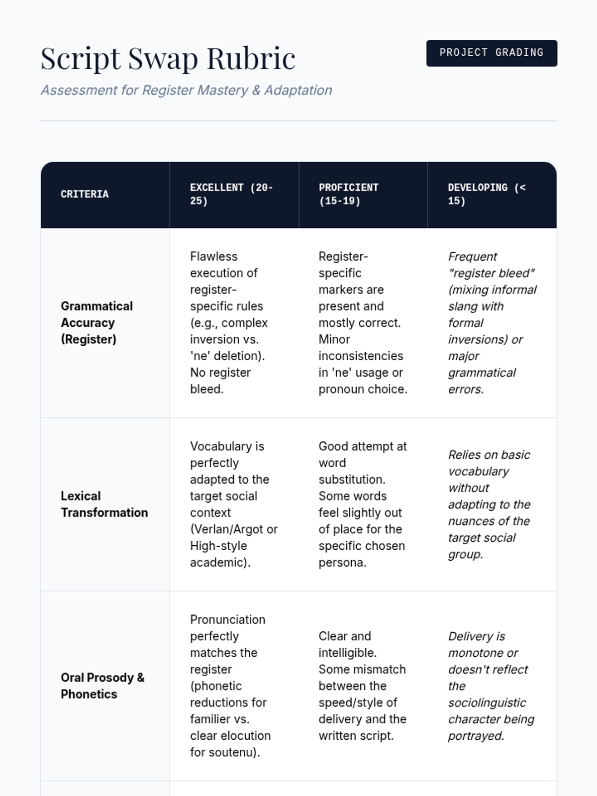 This advanced French sequence explores the sociolinguistic dimensions of grammar, focusing on how language shifts between 'langue populaire', 'langue standard', and 'langue soutenue'. Students develop the ability to navigate different social contexts by mastering register-specific grammatical structures, from slang reductions to formal inversions.
