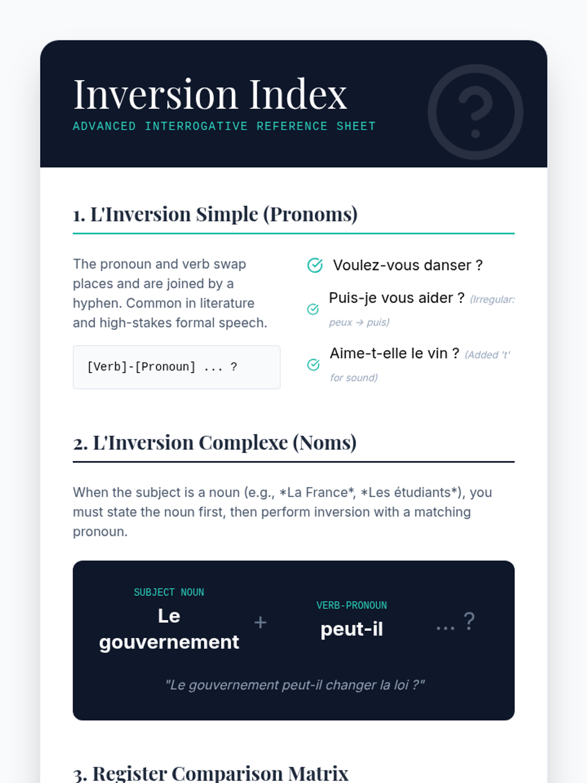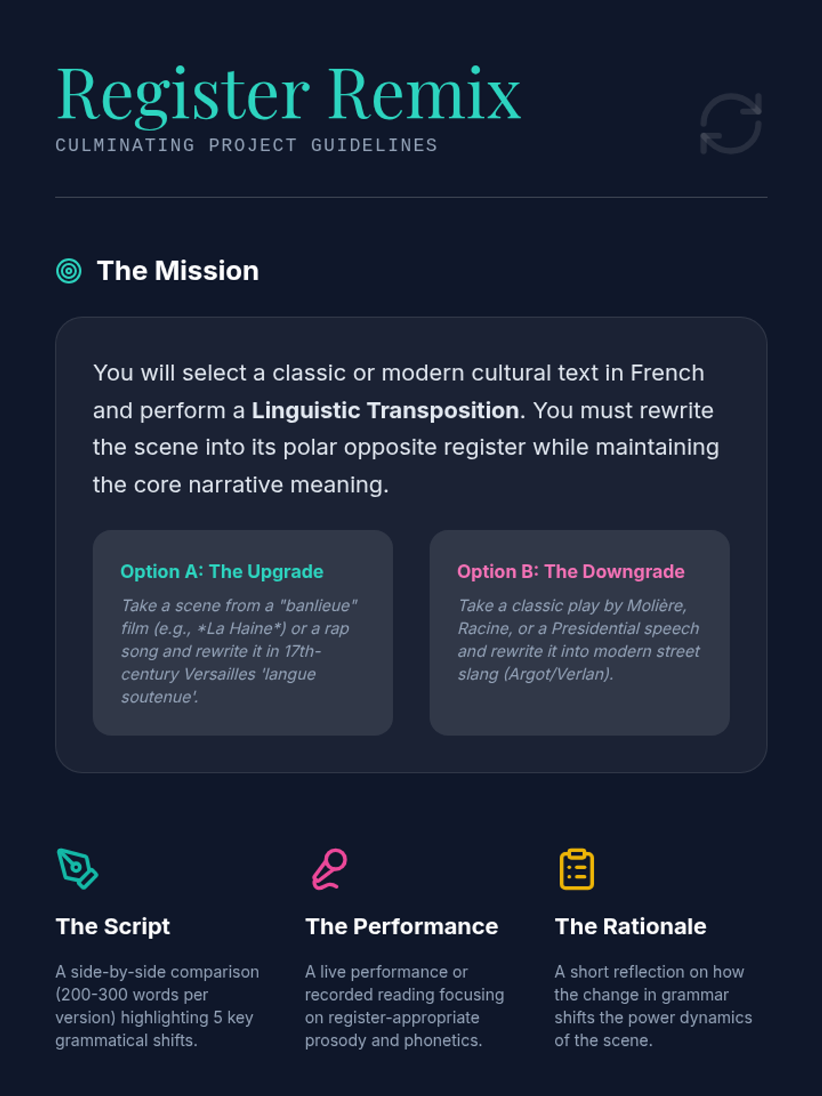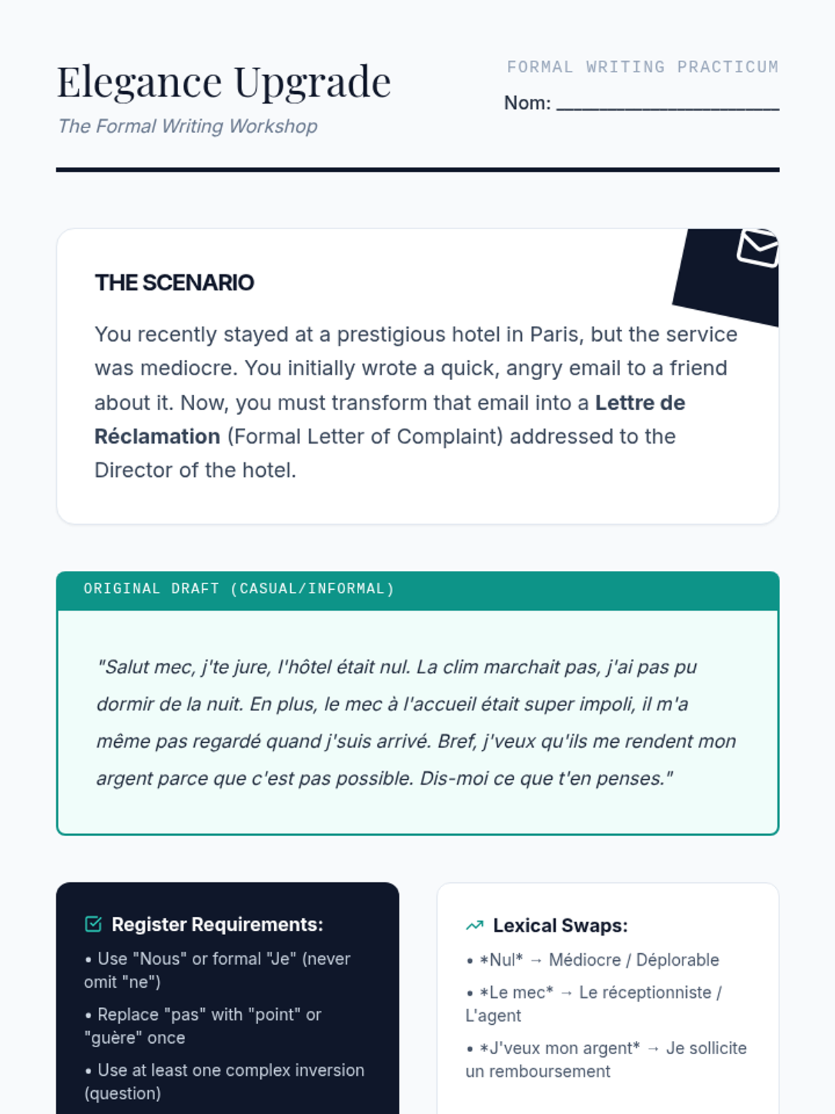 This advanced French sequence explores the sociolinguistic dimensions of grammar, focusing on how language shifts between 'langue populaire', 'langue standard', and 'langue soutenue'. Students develop the ability to navigate different social contexts by mastering register-specific grammatical structures, from slang reductions to formal inversions.