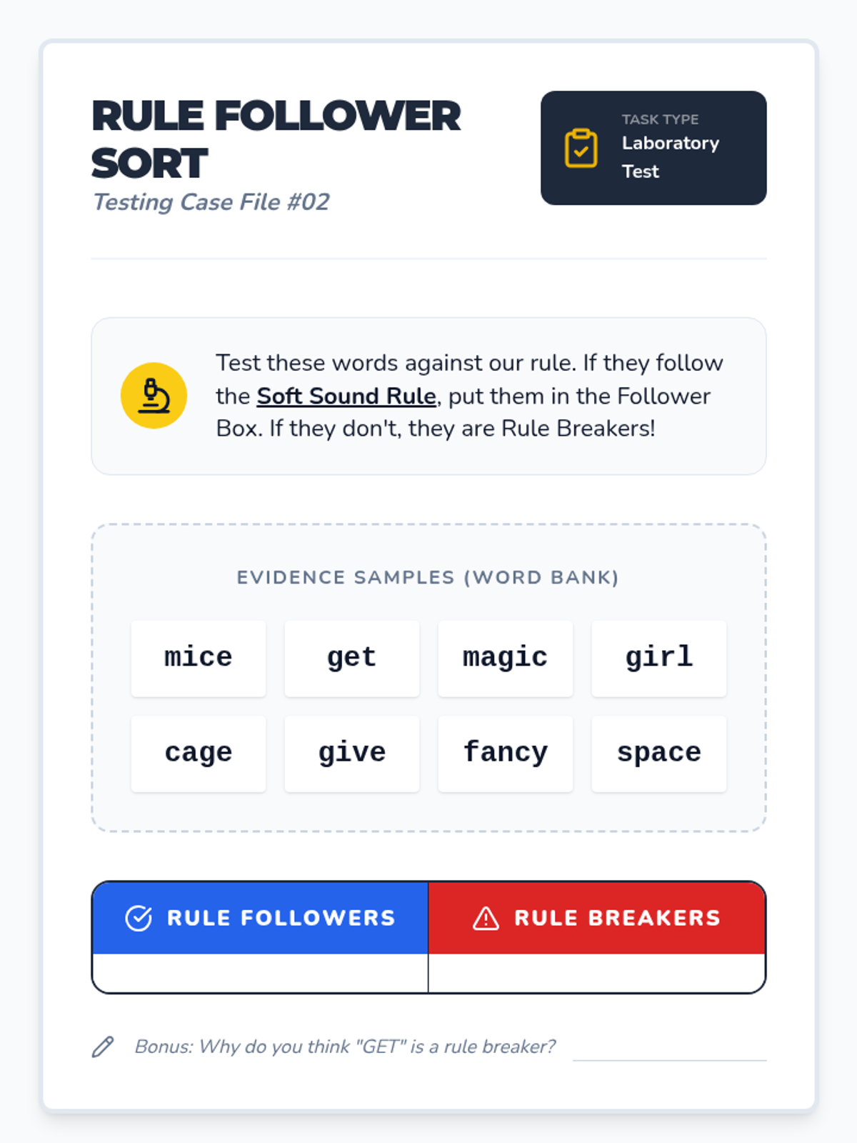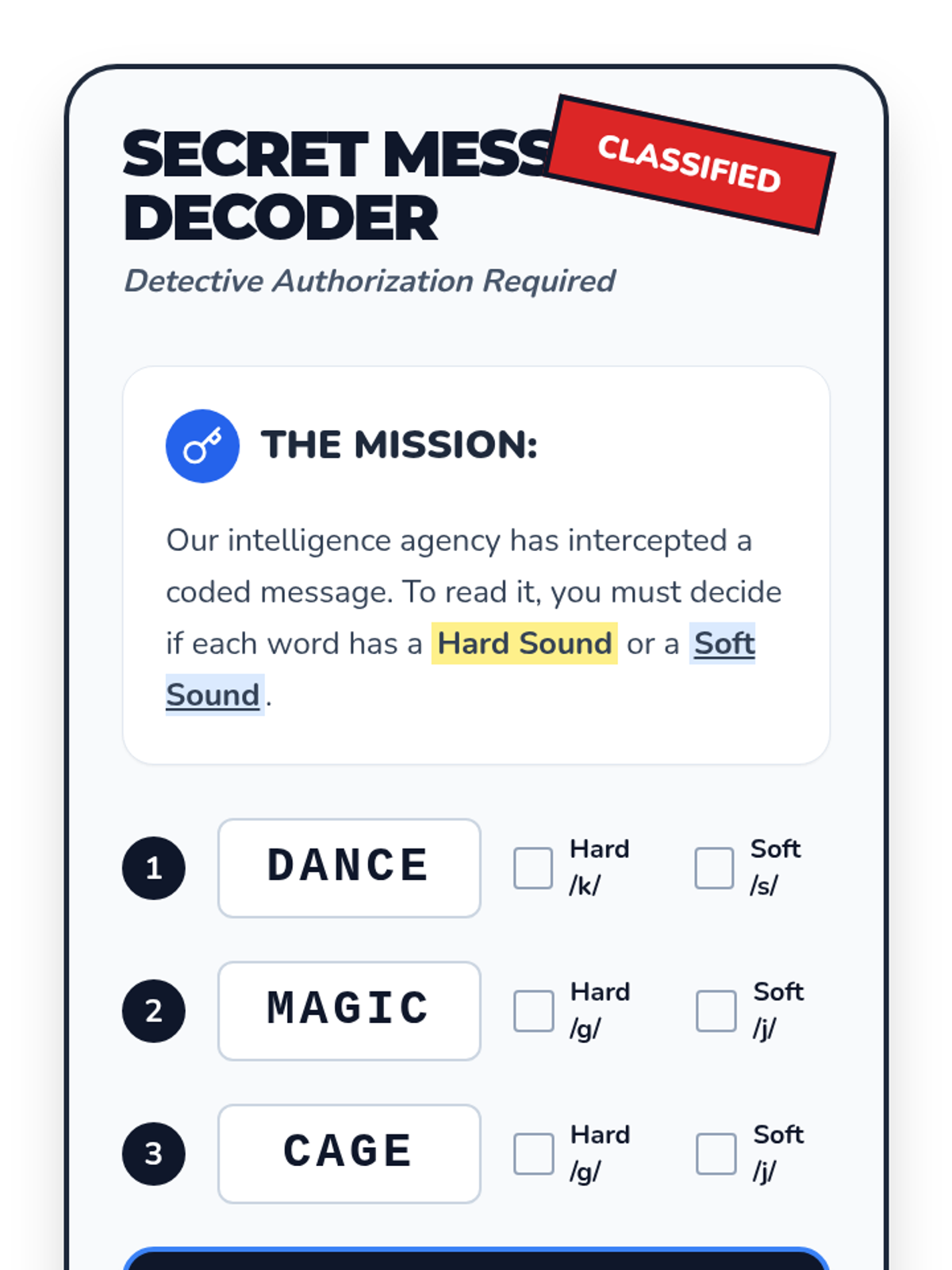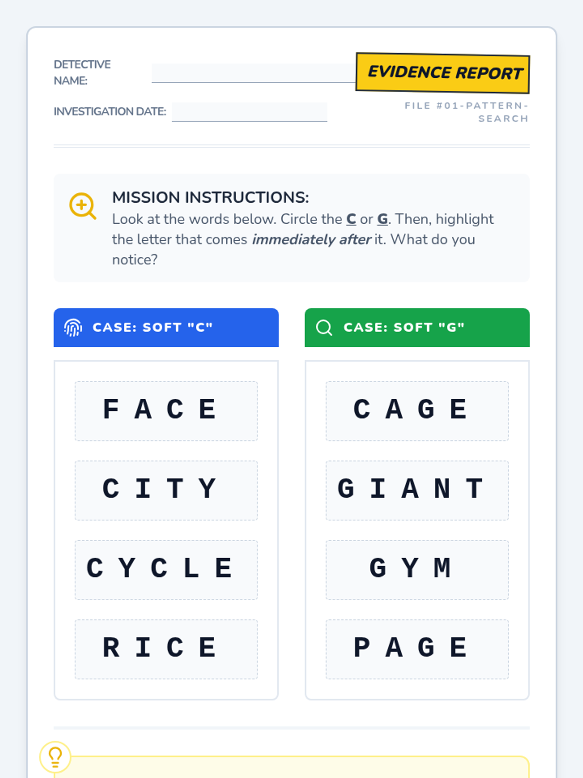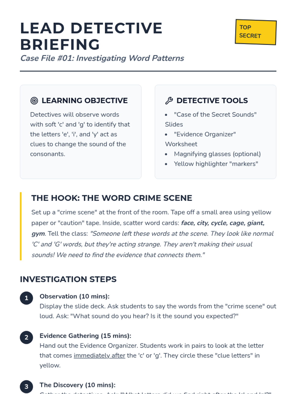 An inquiry-based 1st-grade phonics sequence where students become 'Word Detectives' to discover the rules for soft 'c' and 'g' through observation, hypothesis testing, and application. Students move from finding patterns to teaching the rules and decoding nonsense words.