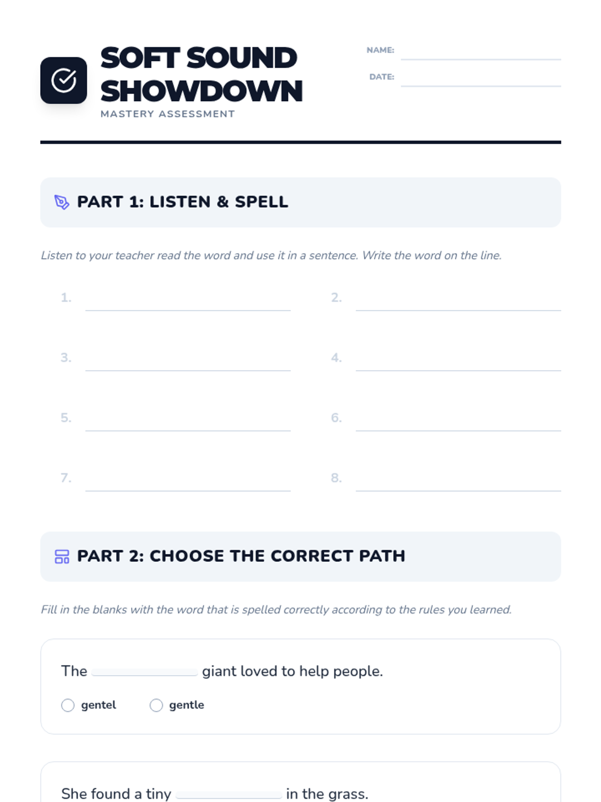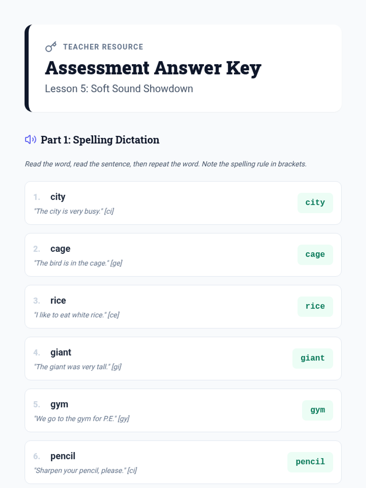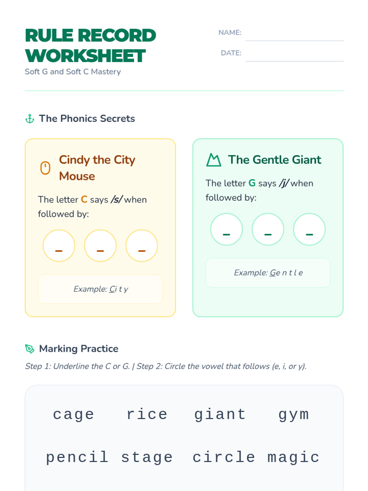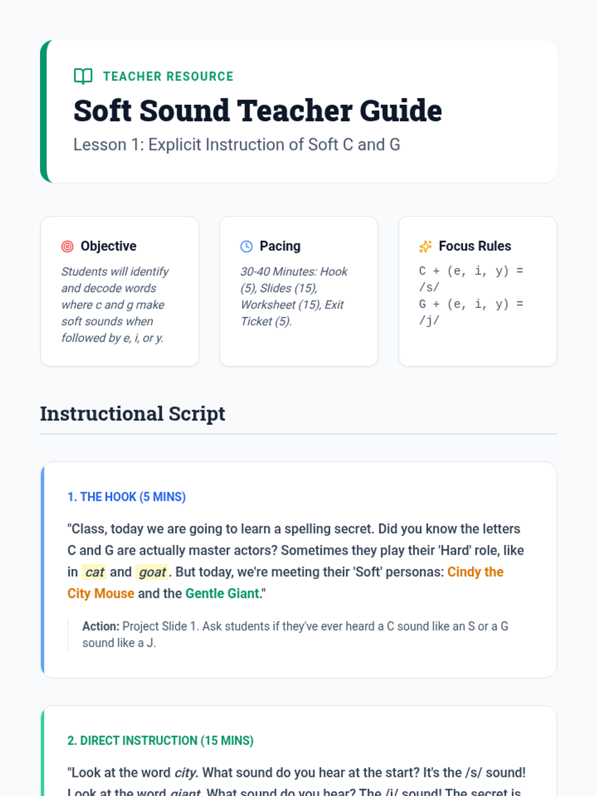 This sequence provides explicit instruction and practice for 3rd-grade students to master the soft 'c' and 'g' phonics rules. Through a combination of direct instruction, word chaining, dictation, and contextual reading, students build decoding automaticity and spelling accuracy for words where 'c' and 'g' are followed by e, i, or y.