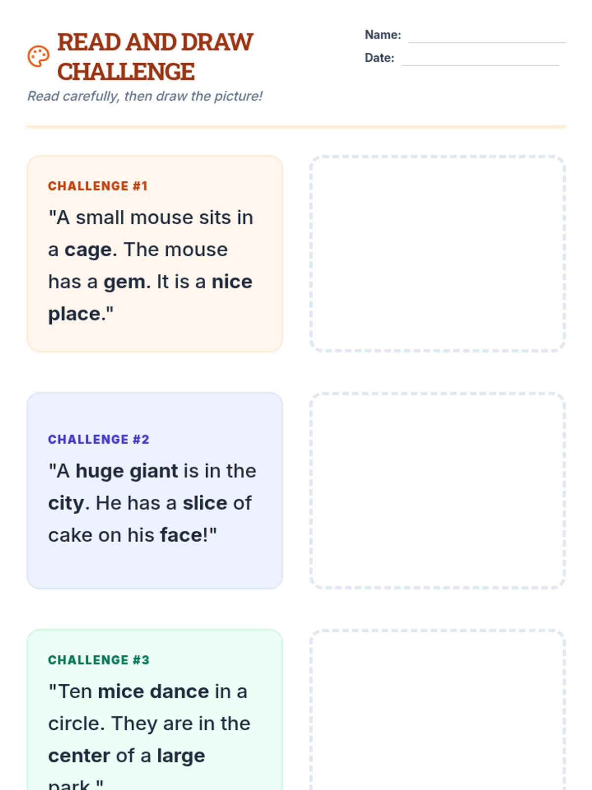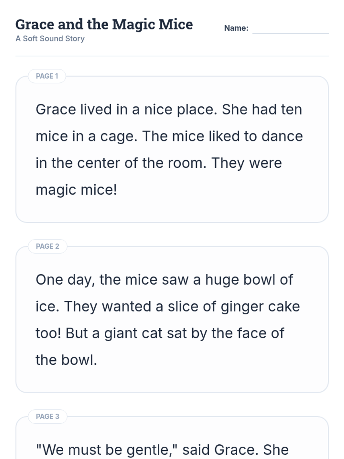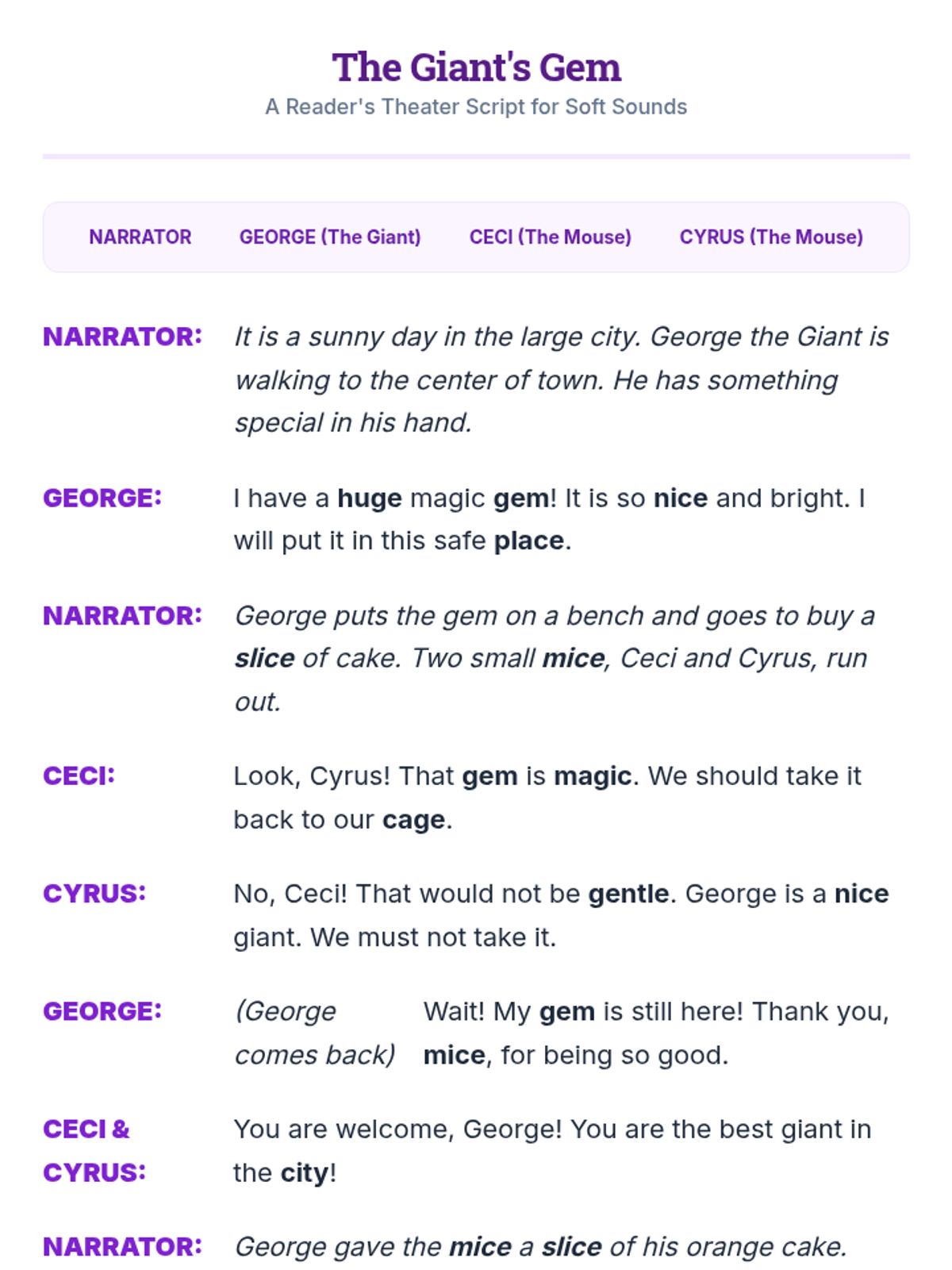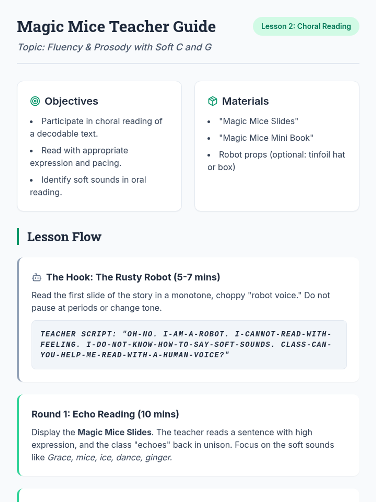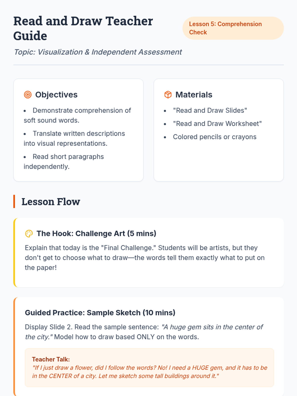 A 1st Grade phonics sequence focused on reading connected text with soft 'c' and 'g' patterns. Students progress from sentence-level identification to choral reading, partner retells, performance, and independent comprehension through drawing.