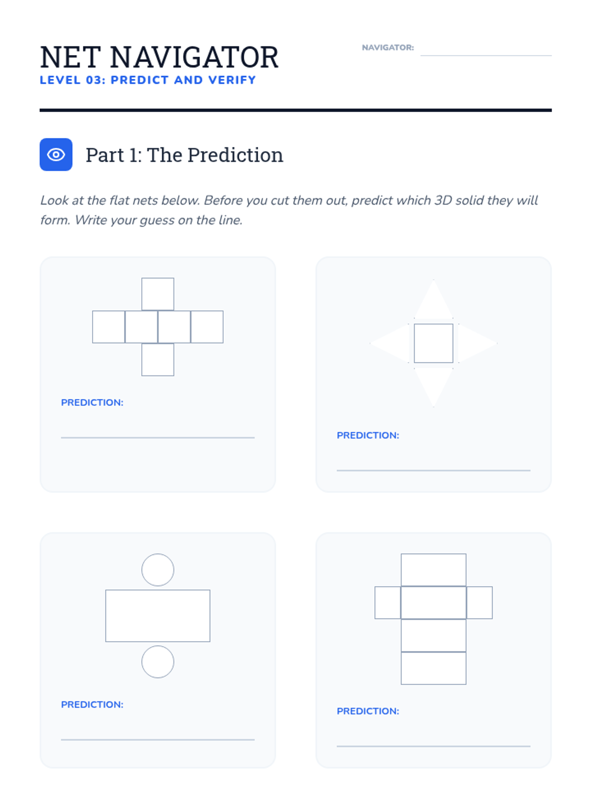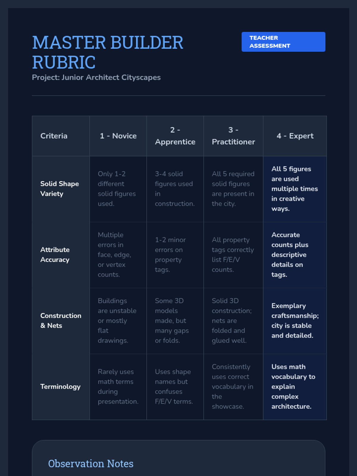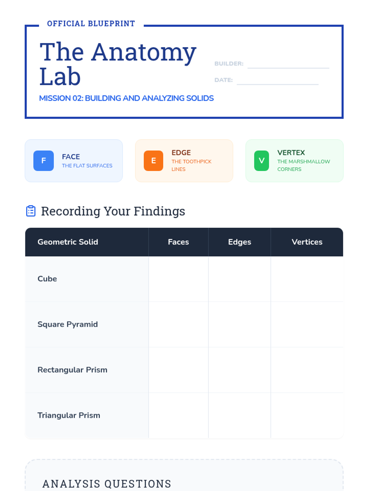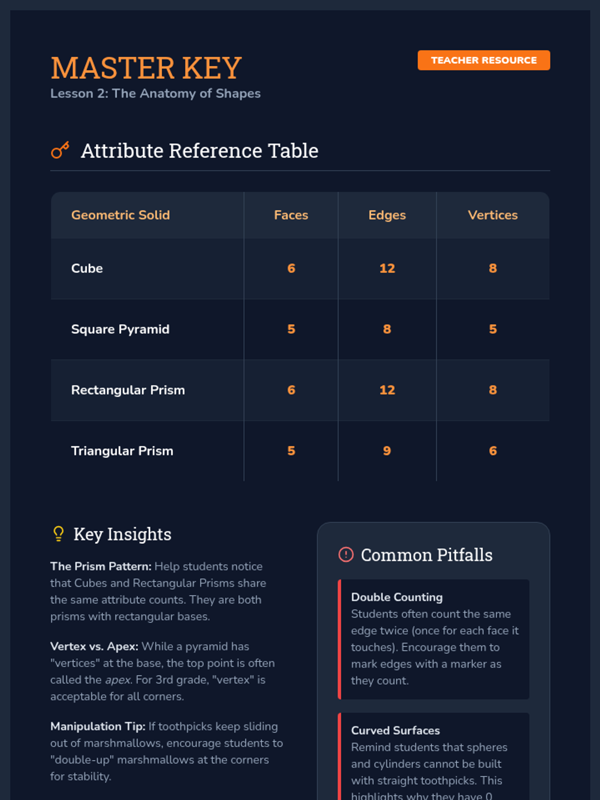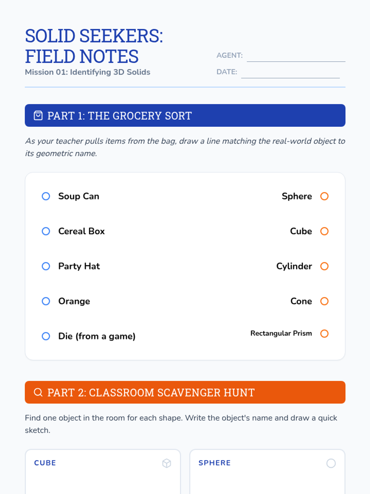 A 3rd-grade geometry unit transitioning from 2D shapes to 3D solids. Students investigate faces, edges, and vertices, explore the relationship between solids and their nets, and apply their knowledge through hands-on building and real-world identification.